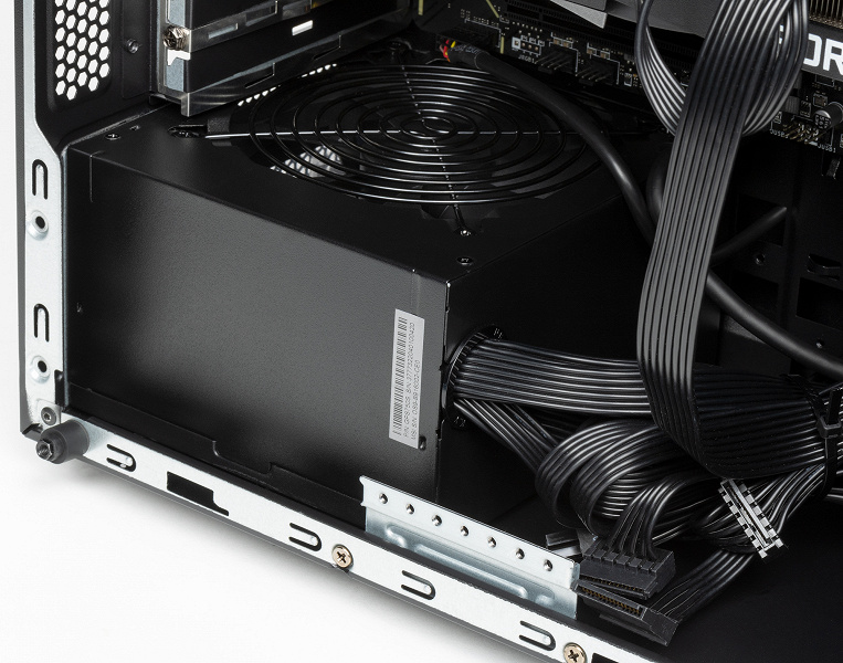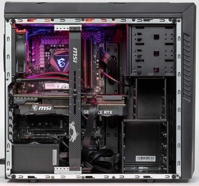 Снимаем крышку, и... Да — опять олдскул. Складывается ощущение, что корпус разрабатывался еще во времена немного других тенденций, так что «осовременили» его позднее просто установкой глухой передней панели. На что прямо намекают три пятидюймовых отсека в верхней части дисковой корзины — которым не помешал бы (раз уж есть) внешний доступ: были бы рады сохранившиеся поклонники оптических дисков, да и всяких интересных устройств под такие отсеки встречалось немало. Но что есть — то есть. Сейчас эти отсеки можно использовать разве что для установки дополнительных жестких дисков, что не слишком удобно, поскольку требует адаптеров. Да и не слишком нужно — и без того отсеков больше, чем может понадобиться современному пользователю. Даже очень требовательному — поскольку нижняя часть позволяет разместить пять трехдюймовых накопителей, а средняя — еще пять двухдюймовых. Столько SATA-портов на современных платах уже не бывает, так что для полной реализации потенциальных возможностей без дополнительных контроллеров никуда. При этом несъемная и неразборная корзина такой конструкции добавляет корпусу жесткости, но может помешать установке очень длинных видеокарт — максимум тут «впихнуть» получится 320 мм, чего достаточно для референсной RTX 4090, но большинство видеокарт собственного дизайна всех производителей длиннее. Даже для RTX 4080 нередки 340 мм — не войдут. И собственной MSI GeForce RTX 4080 16GB Ventus 3X, самую малость не хватает — ее длина 324 мм. Есть, правда, в ассортименте компании RTX 4090 с жидкостным охлаждением — достаточно короткие, чтобы поместиться здесь. Поэтому на что в будущем проапгрейдить видеосистему найдется, но, если бы не немного архаичная компоновка корпуса, выбор мог бы быть гораздо шире. Зато любители SATA-накопителей будут довольны. А для предпочитающих современные решения, а не наследие патриархальной старины, на системной плате есть целых четыре слота М.2, три из которых поддерживают PCIe Gen4. Так что в игровом компьютере можно и одними ими обойтись.