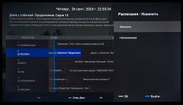 У телевизора есть базовая поддержка электронной программы передач — можно посмотреть, что именно идет или будет идти на текущем и других каналах и прочитать краткое описание, в том числе вывести его на треть площади экрана.