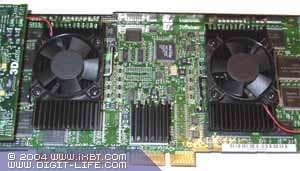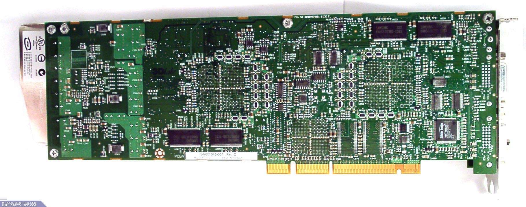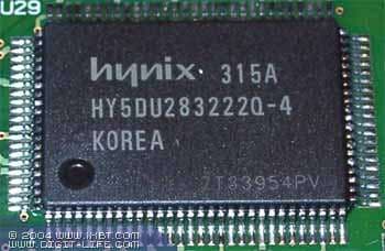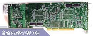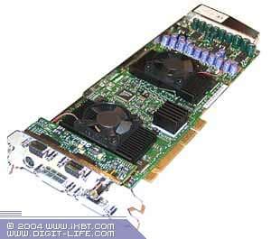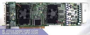 | Карта оборудована слотом AGP Pro 8x и 384 Мб памяти DDR (128 Мб фреймовый буфер плюс 256 Мб текстурный буфер). Микросхемы памяти Hynix (маркировка HYDU283222Q-4). Микросхемы памяти Samsung (маркировка K4H561638D-TCB3). | ![]() |