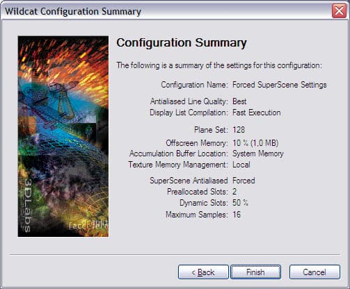 При тестировании с антиалиасингом использовался режим максимального качества сглаживания — 16хQ для Quadro FX 3000 и Forced SuperScene Settings (FSSS) для Wildcat 4 7210. И, раз уж речь зашла о настройках драйверов Wildcat 4, приведём несколько скриншотов: