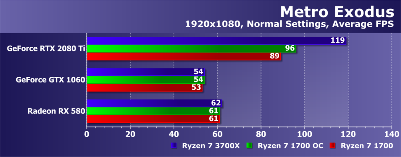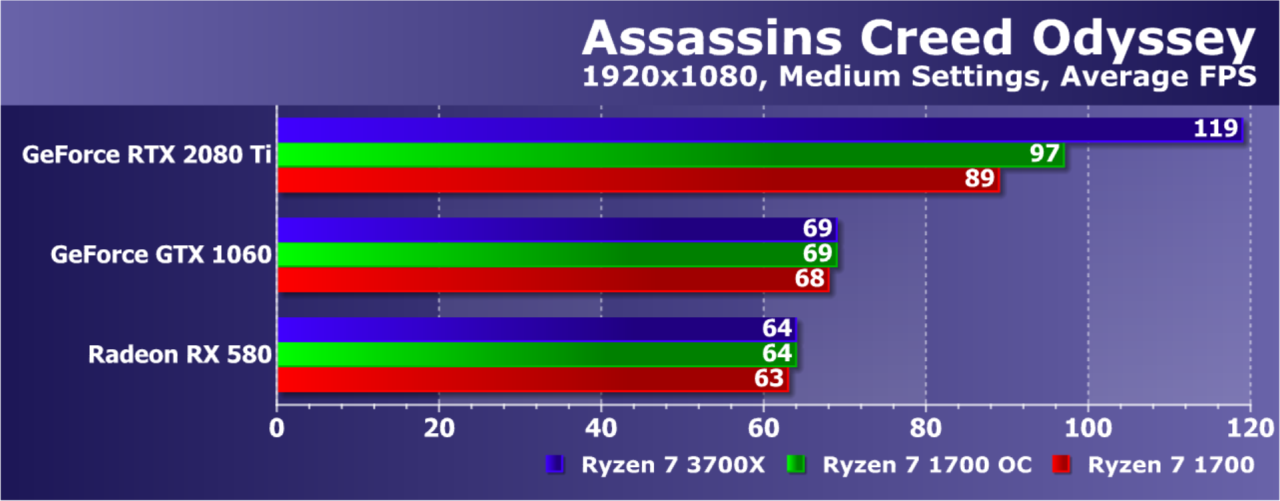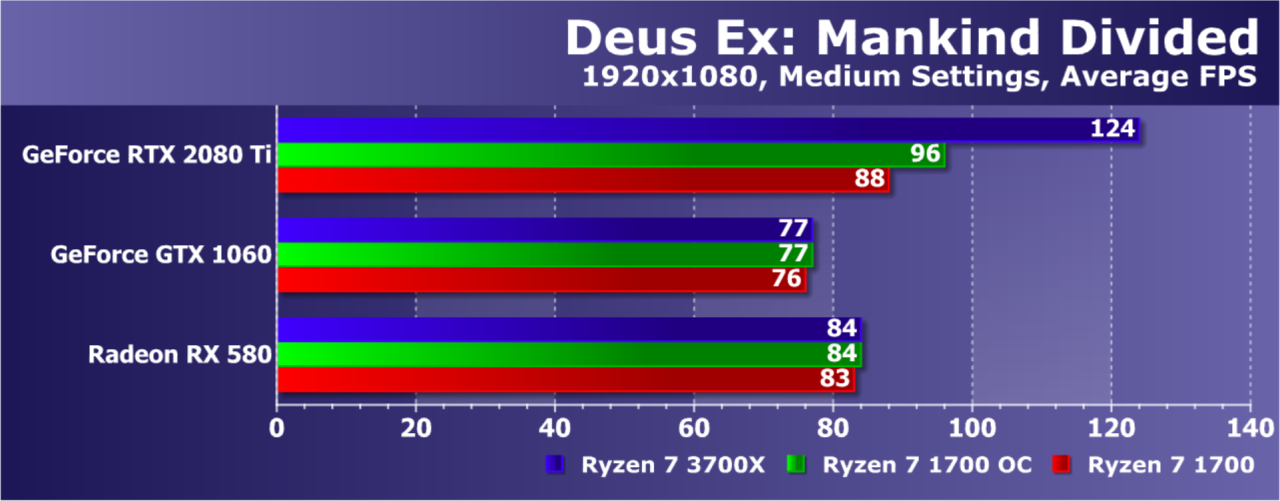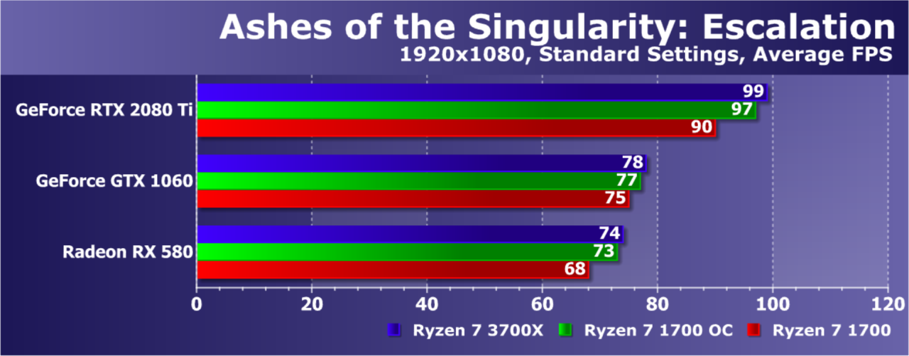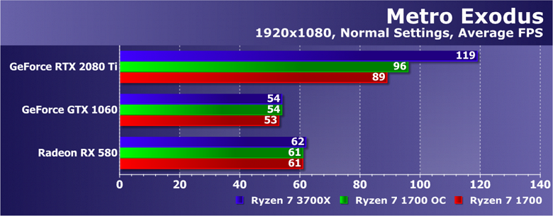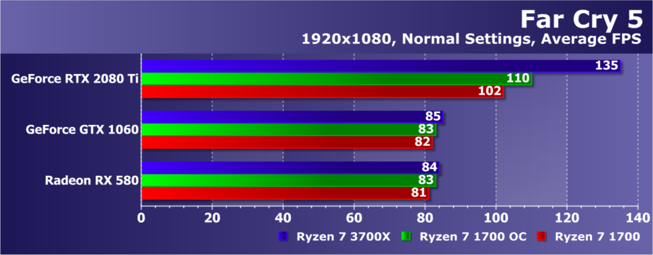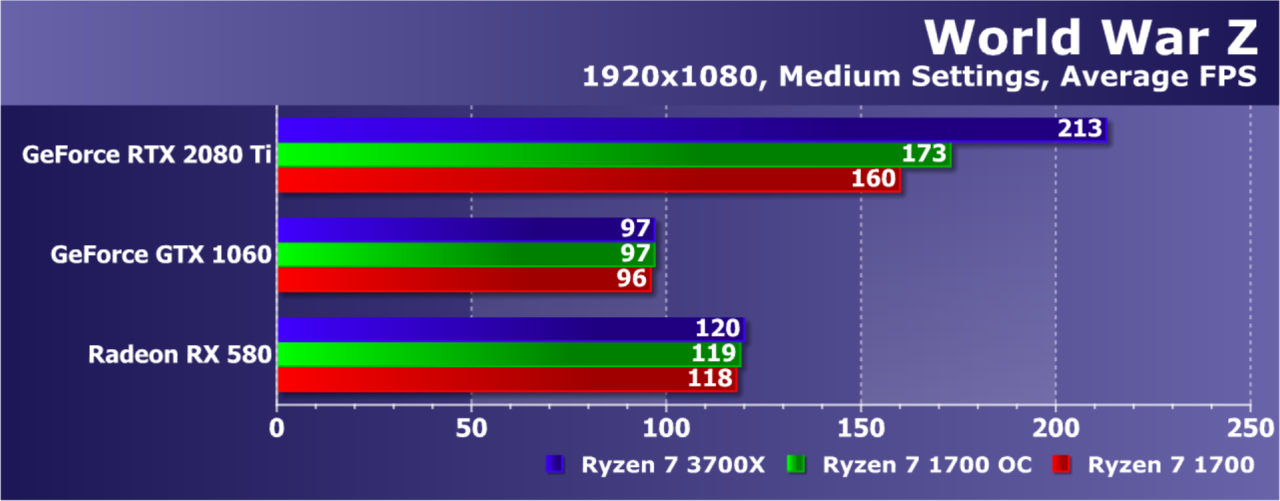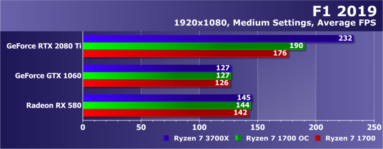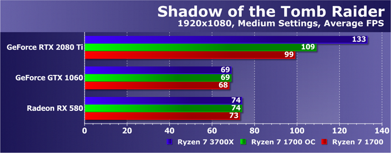 Увы, указанные выше GPU недостаточно мощны, а игра весьма ресурсоемкая для того, чтобы была видна разница даже в Full HD. А вот старшая GeForce RTX 2080 Ti показала хотя бы часть возможностей Ryzen 7 3700X: производительность при установке этой модели процессора была на 21% выше по сравнению со стоковым Ryzen 7 1700. И это при том, что разгон старого Ryzen дал лишь 5% дополнительной скорости.