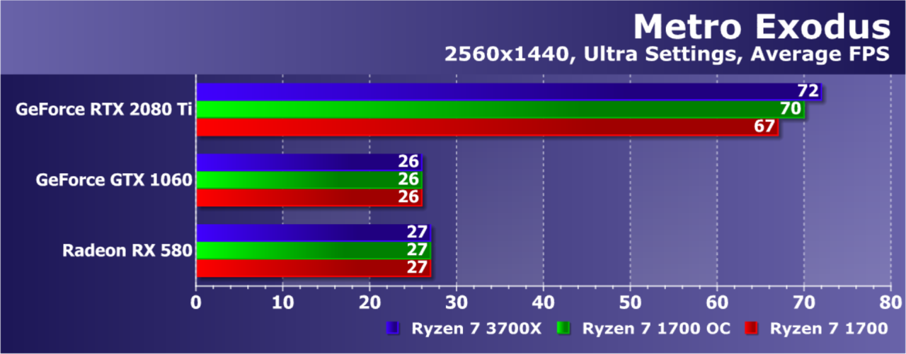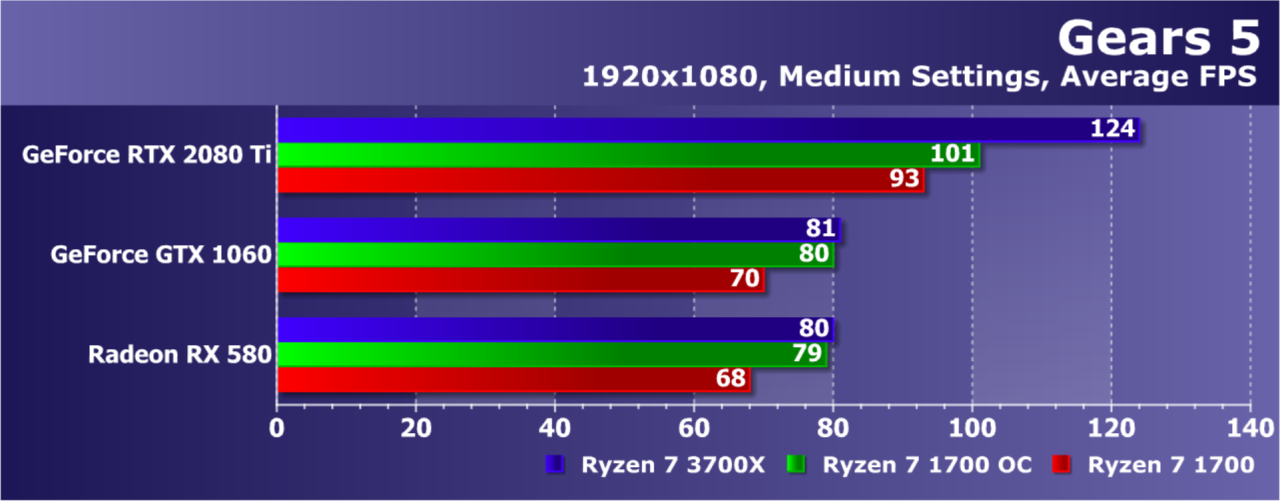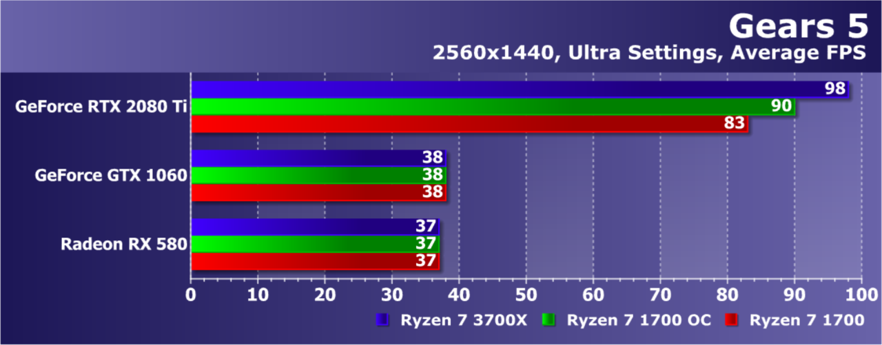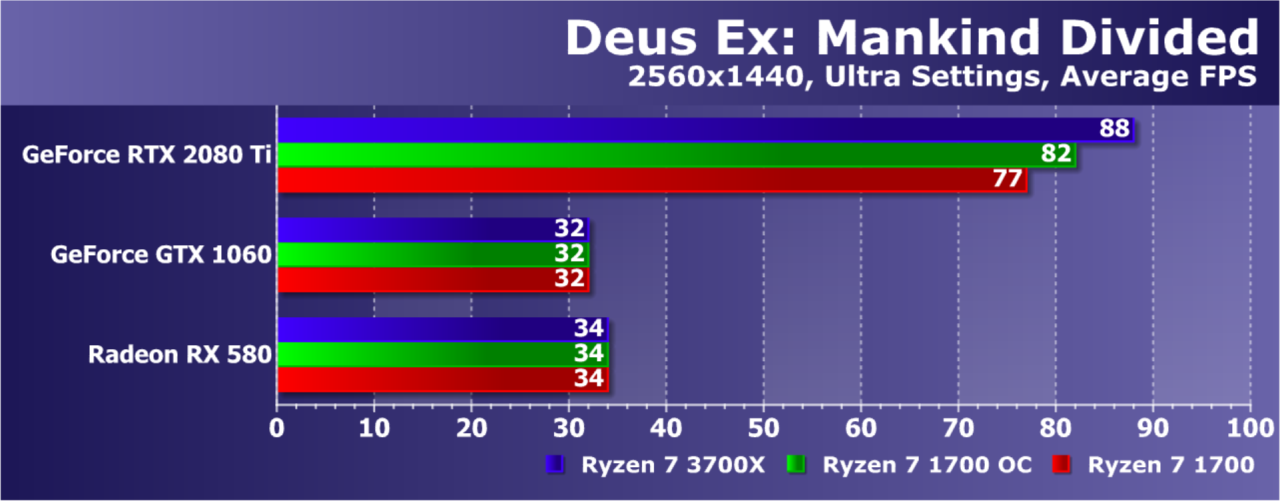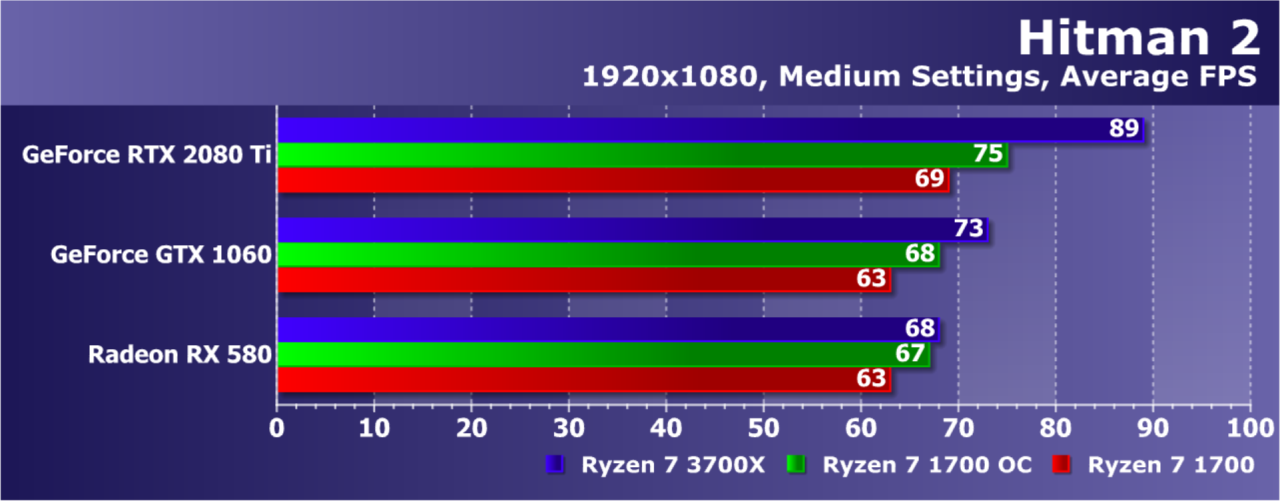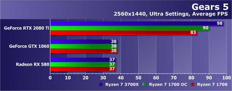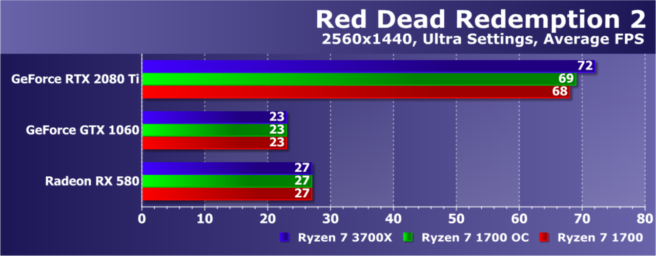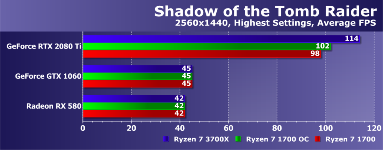 Увы, указанные выше GPU недостаточно мощны, а игра весьма ресурсоемкая для того, чтобы была видна разница даже в Full HD. А вот старшая GeForce RTX 2080 Ti показала хотя бы часть возможностей Ryzen 7 3700X: производительность при установке этой модели процессора была на 21% выше по сравнению со стоковым Ryzen 7 1700. И это при том, что разгон старого Ryzen дал лишь 5% дополнительной скорости.