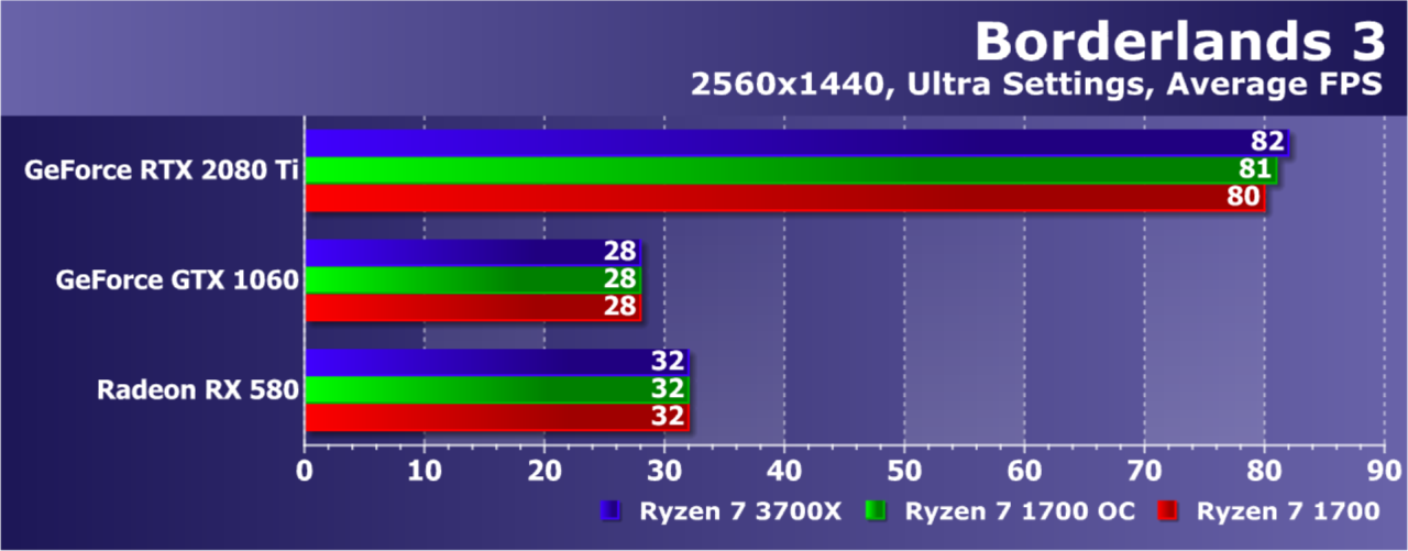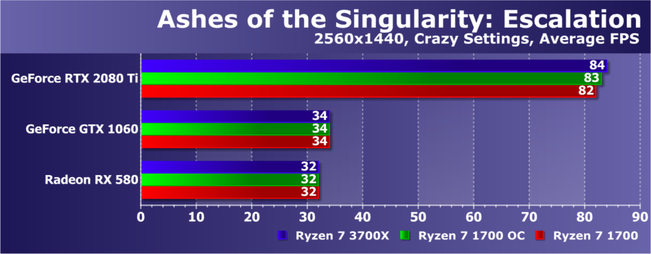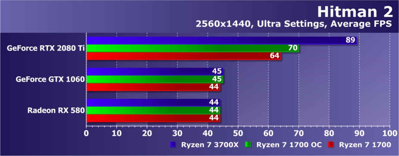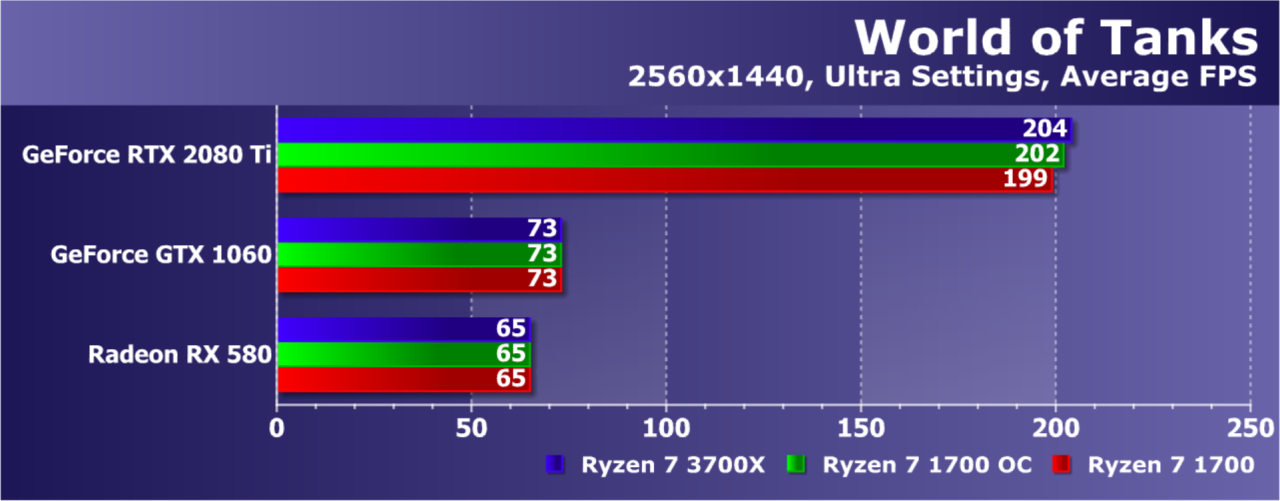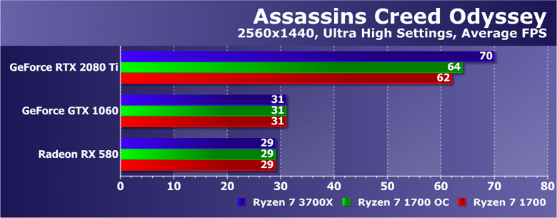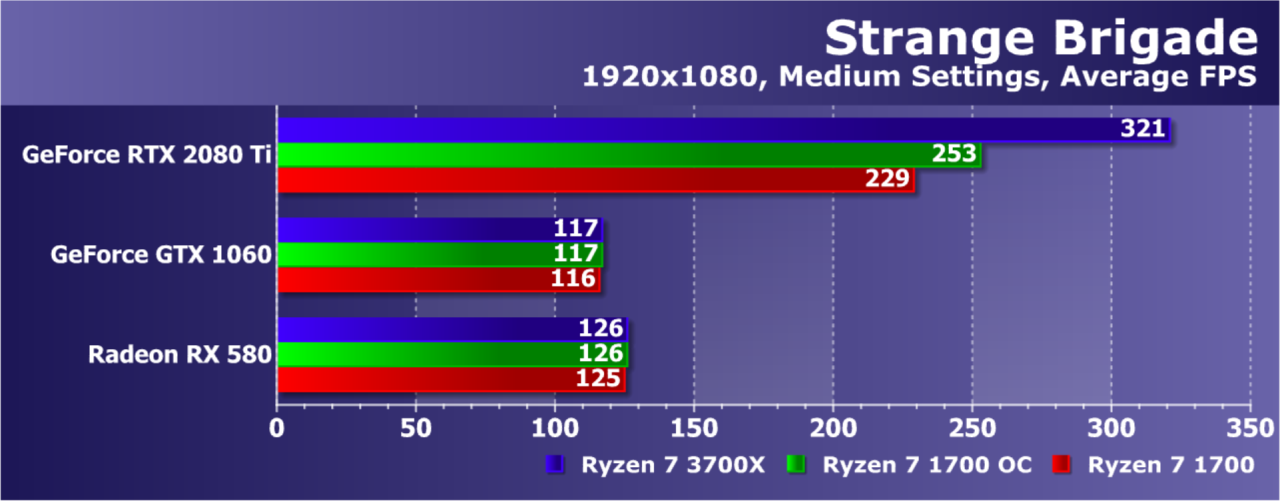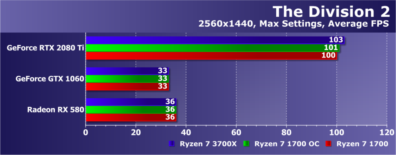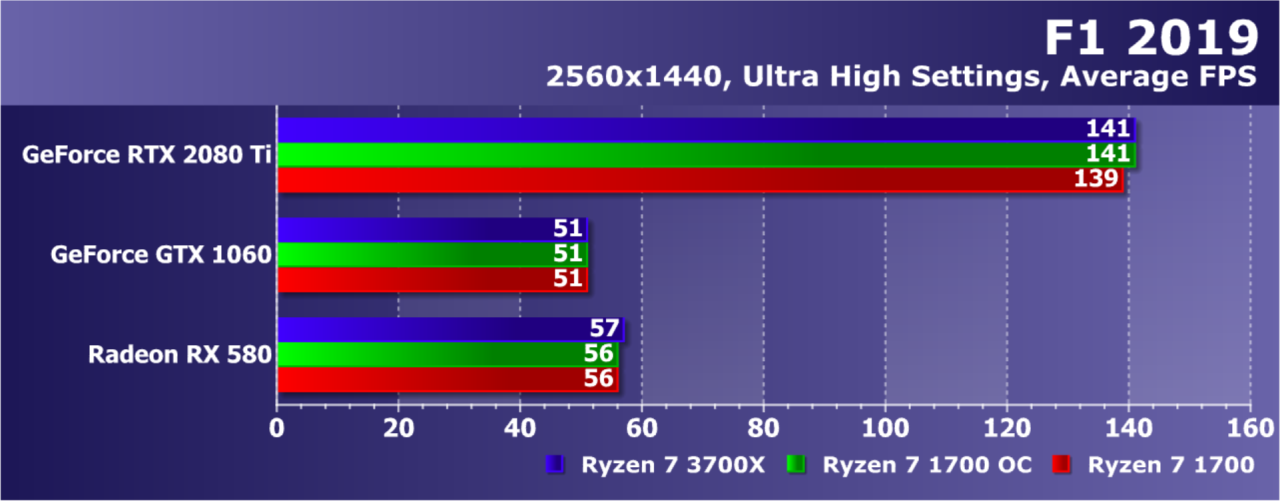 Увы, указанные выше GPU недостаточно мощны, а игра весьма ресурсоемкая для того, чтобы была видна разница даже в Full HD. А вот старшая GeForce RTX 2080 Ti показала хотя бы часть возможностей Ryzen 7 3700X: производительность при установке этой модели процессора была на 21% выше по сравнению со стоковым Ryzen 7 1700. И это при том, что разгон старого Ryzen дал лишь 5% дополнительной скорости.
