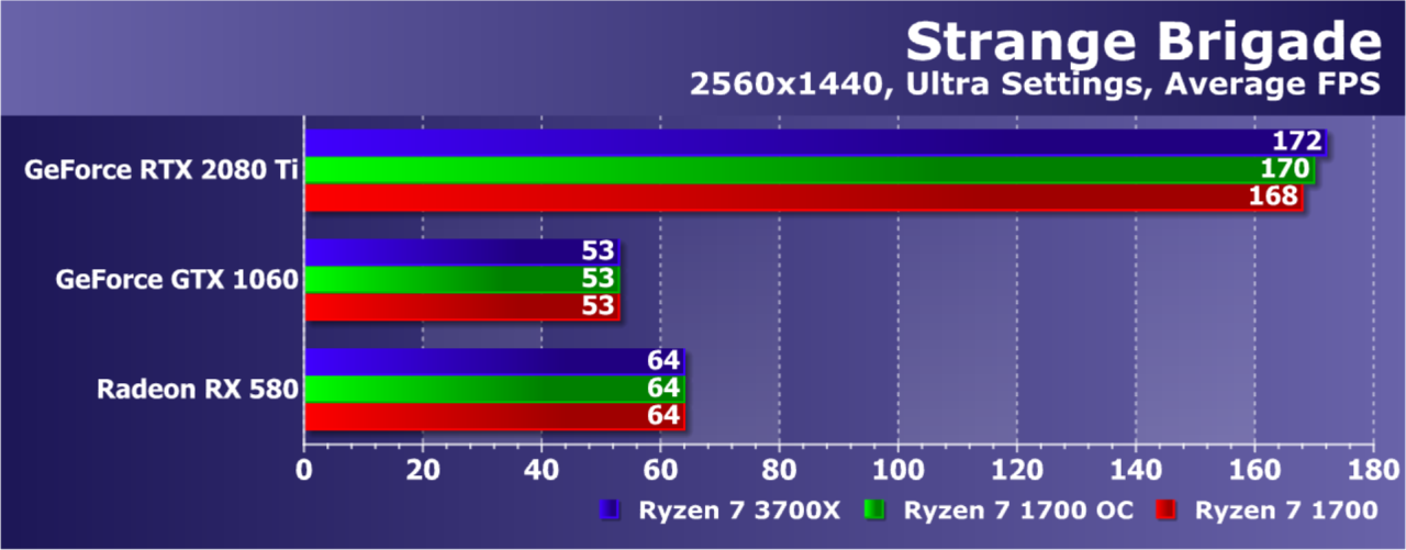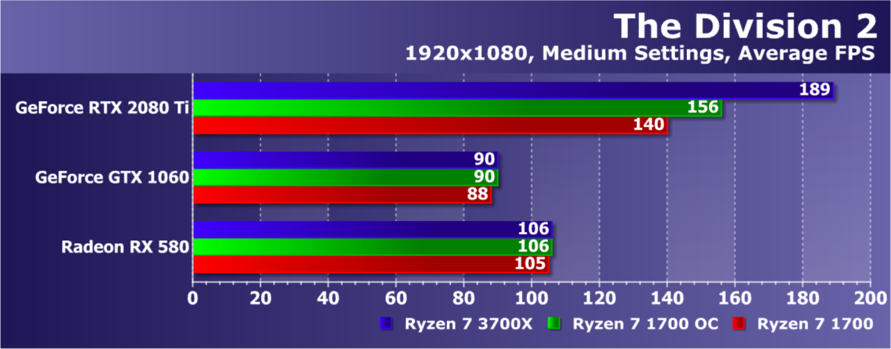 Среднеценовые Radeon RX 580 и GeForce GTX 1060 почти не показали прироста при трех разных вариантах CPU, а вот топовая карта семейства Turing снова была более чем на треть быстрее при использовании нового Ryzen 7 3700X по сравнению со старым Ryzen 7 1700. И даже разгон последнего дал лишь 10% прибавки. То есть у Zen 2 и в этой игре обнаружилось заметное преимущество.