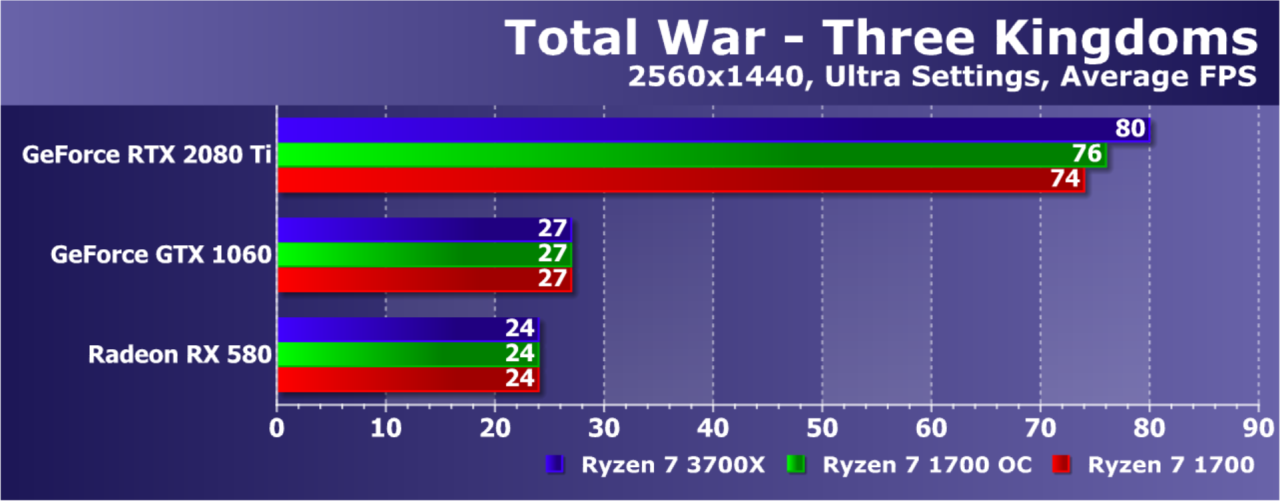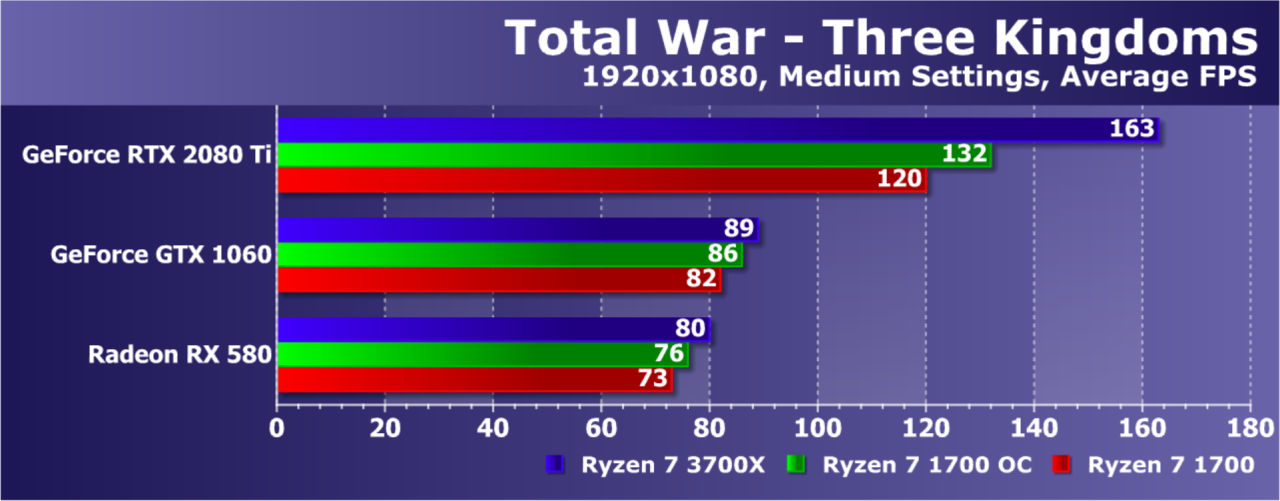 В игре Total War: Three Kingdoms режима использования Direct3D12 уже нет, хотя он был в виде бета-версии в предыдущих играх этой серии — из-за недостатка оптимизации его просто выкинули. Интересно, что некоторая разница между моделями CPU отмечена и для среднеценовых видеокарт Radeon RX 580 и GeForce GTX 1060 (до 10%), но полностью процессоры раскрывает лишь топовая видеокарта семейства GeForce RTX, показавшая весьма приличный прирост частоты кадров при установке Ryzen 7 3700X по сравнению с Ryzen 7 1700: +36%. При этом разгон старого процессора AMD дал лишь около 10%.