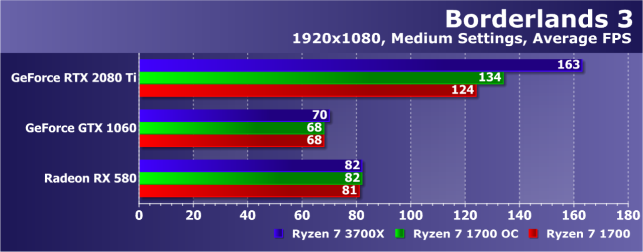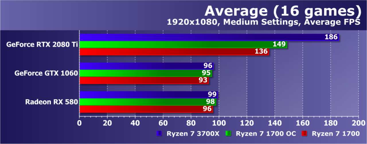 Так как прирост от использования более нового и производительного CPU, по опыту наших предыдущих игровых тестов, получается заметно бо́льшим в тех режимах, когда скорость рендеринга в целом ограничена именно его мощностью (вот это поворот!), мы протестировали представленные видеокарты в самом распространенном у пользователей разрешении 1920×1080 при средних настройках качества. Именно в таких случаях и должна наблюдаться максимально возможная отдача от апгрейда Ryzen с первого поколения на третье. Естественно, исключая еще меньшие разрешения, которые просто никто не использует в реальности (с видеокартами хотя бы среднего уровня).