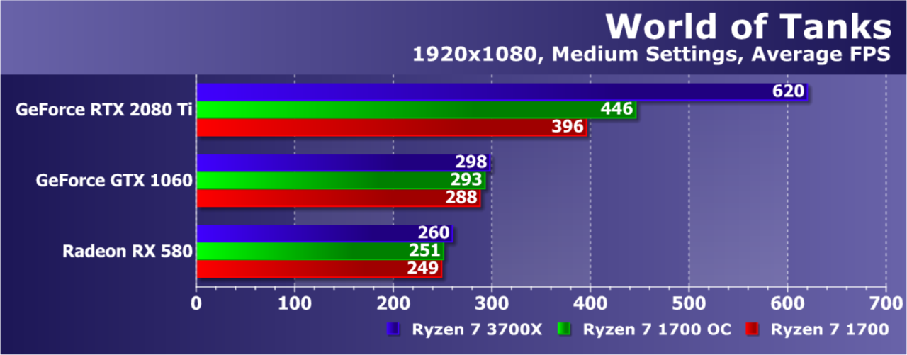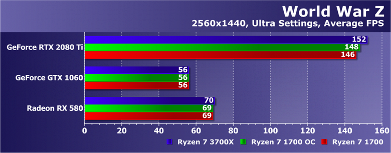 Это очень популярная сетевая многопользовательская игра, руку к которой не приложила ни Nvidia, ни AMD (только Intel, но ее мы сегодня не касаемся). Несмотря на просто огромные трехзначные цифры частоты кадров, вплоть до 300 FPS, GPU средней мощности упираются исключительно в себя, а не в CPU. Замена же Ryzen более новым и мощным CPU при наличии GeForce RTX 2080 Ti в системе дала полуторакратный прирост в средней частоте кадров! Разгон старого Ryzen 7 1700 тоже сказался, но снова всего лишь на 13%. Это самый впечатляющий результат нового процессора AMD.