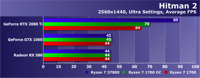 Удивительно, что в случае Hitman 2 более тяжелые условия для GPU принесли упор в графику только для среднебюджетной парочки: Radeon RX 580 и GeForce GTX 1060. А вот старшая видеокарта семейства GeForce RTX все еще получает очень большой прирост при смене процессора, все еще почти так же упираясь в мощность CPU, да еще и разницы между результатами в легком и тяжелом режимах в случае Ryzen 7 3700X нет. Явный упор в центральный процессор, и только новая модель смогла раскрыть возможности топовой карты, да и то еще не все, похоже.