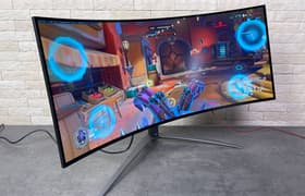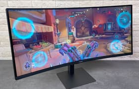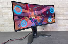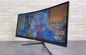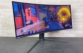 Это игровой монитор высокого класса, к его особенностям относятся большой изогнутый с радиусом 1,5 м сверхширокоформатный экран с разрешением WQHD, многоцветная подсветка на задней панели и нейтральный дизайн. Есть поддержка частоты обновления до 180 Гц включительно, AMD FreeSync Premium и Nvidia G-Sync Compatible. Монитор отлично подходит для любых игр и, например, для просмотра кино и для работы с большим количеством информации. Неширокие углы обзора как по снижению яркости, так и по изменению цветов частично компенсируются тем, что экран изогнутый.