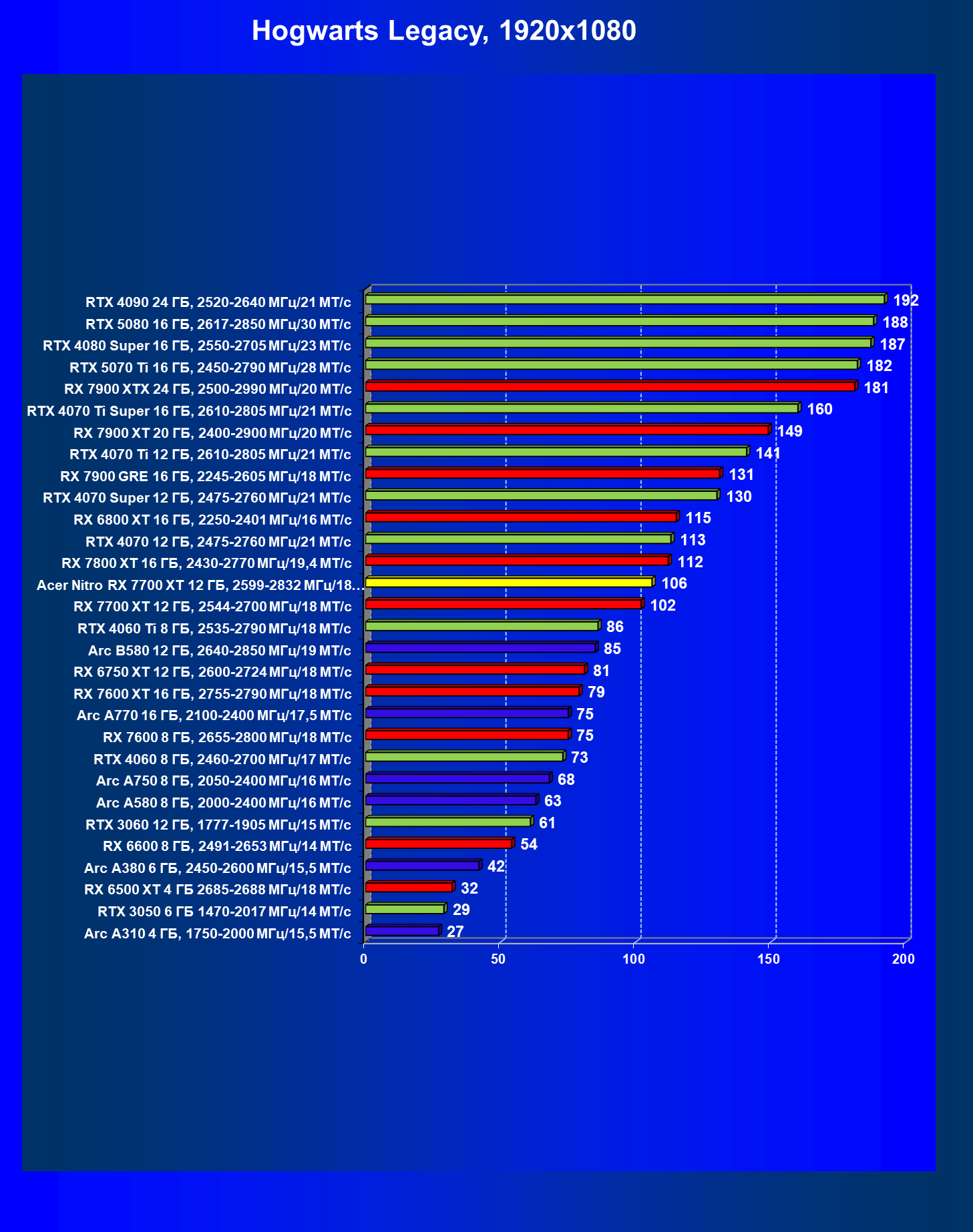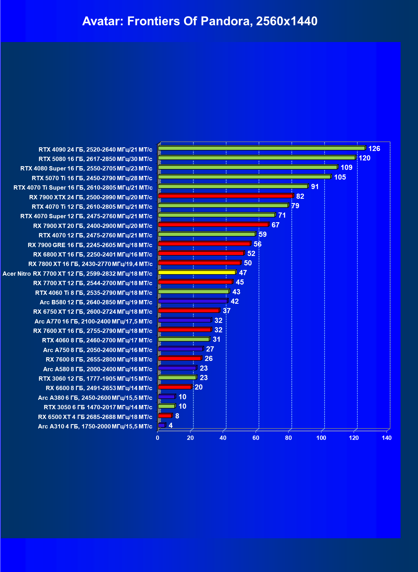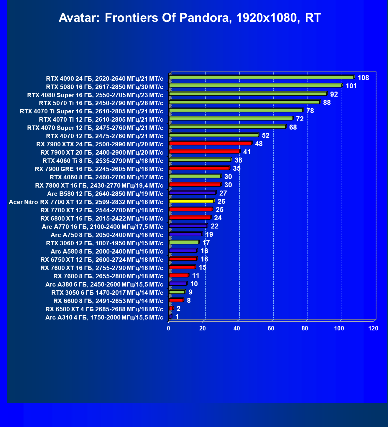 | 03 | Acer Nitro RX 7700 XT 12 ГБ, 2599—2832 МГц/18 МТ/с | 208 | 1103 | 53 000 |