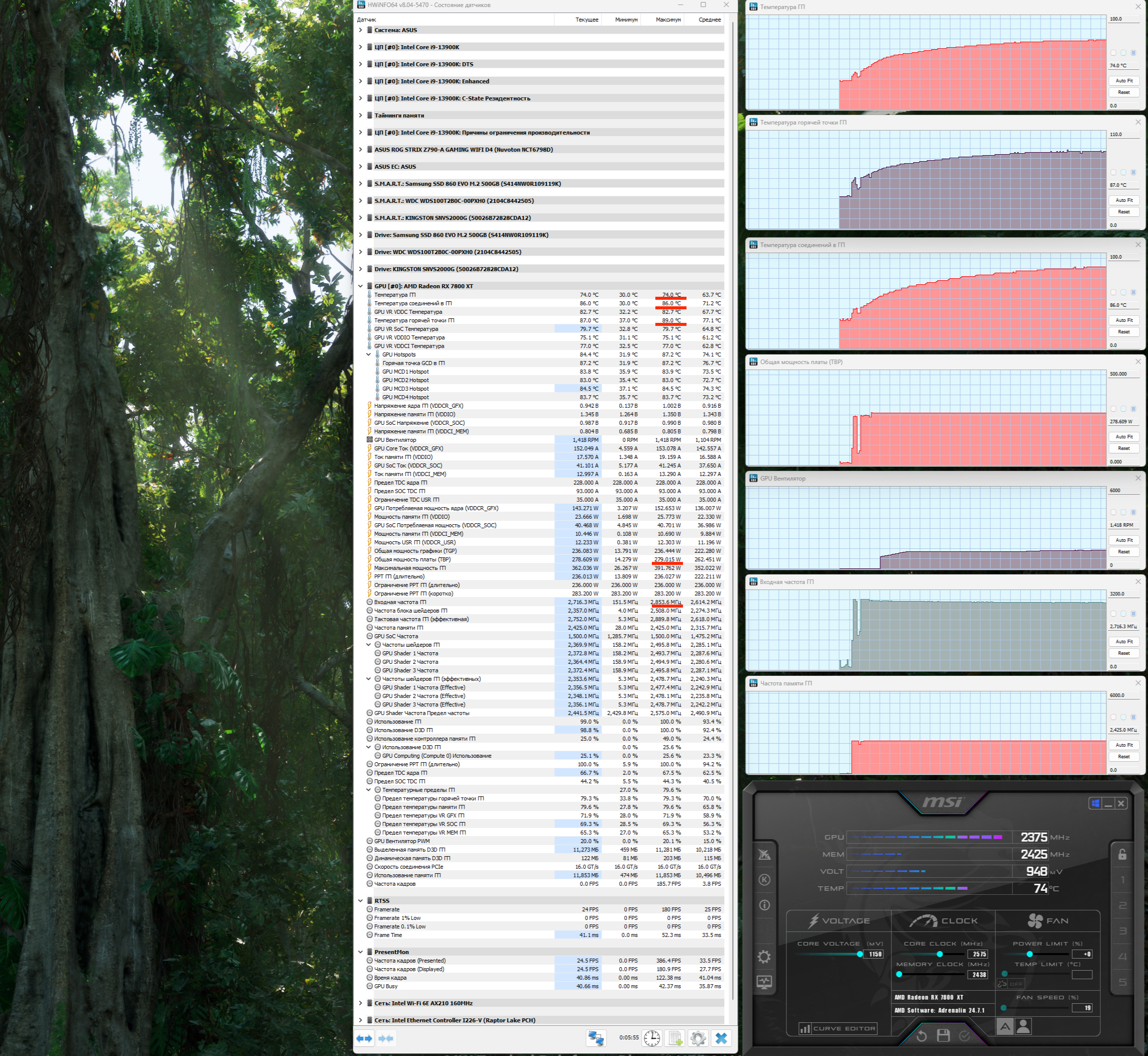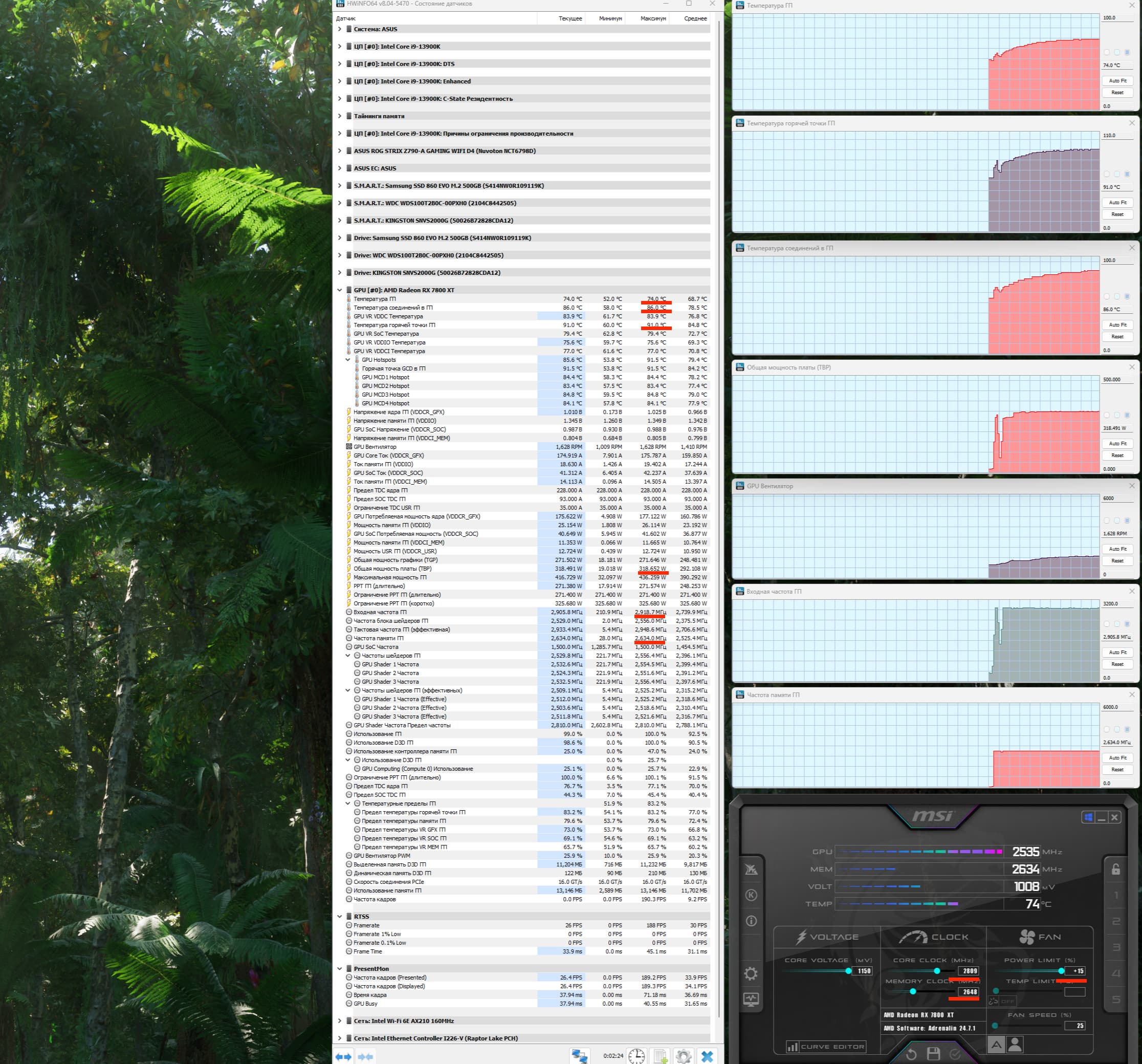 При ручном разгоне параметры нагрева менялись мало (74/86 °С), но максимальное потребление выросло до 318 Вт, прибавилось 5% производительности, при этом температура самой горячей точки ГП (hot spot) составляла 91 °C.