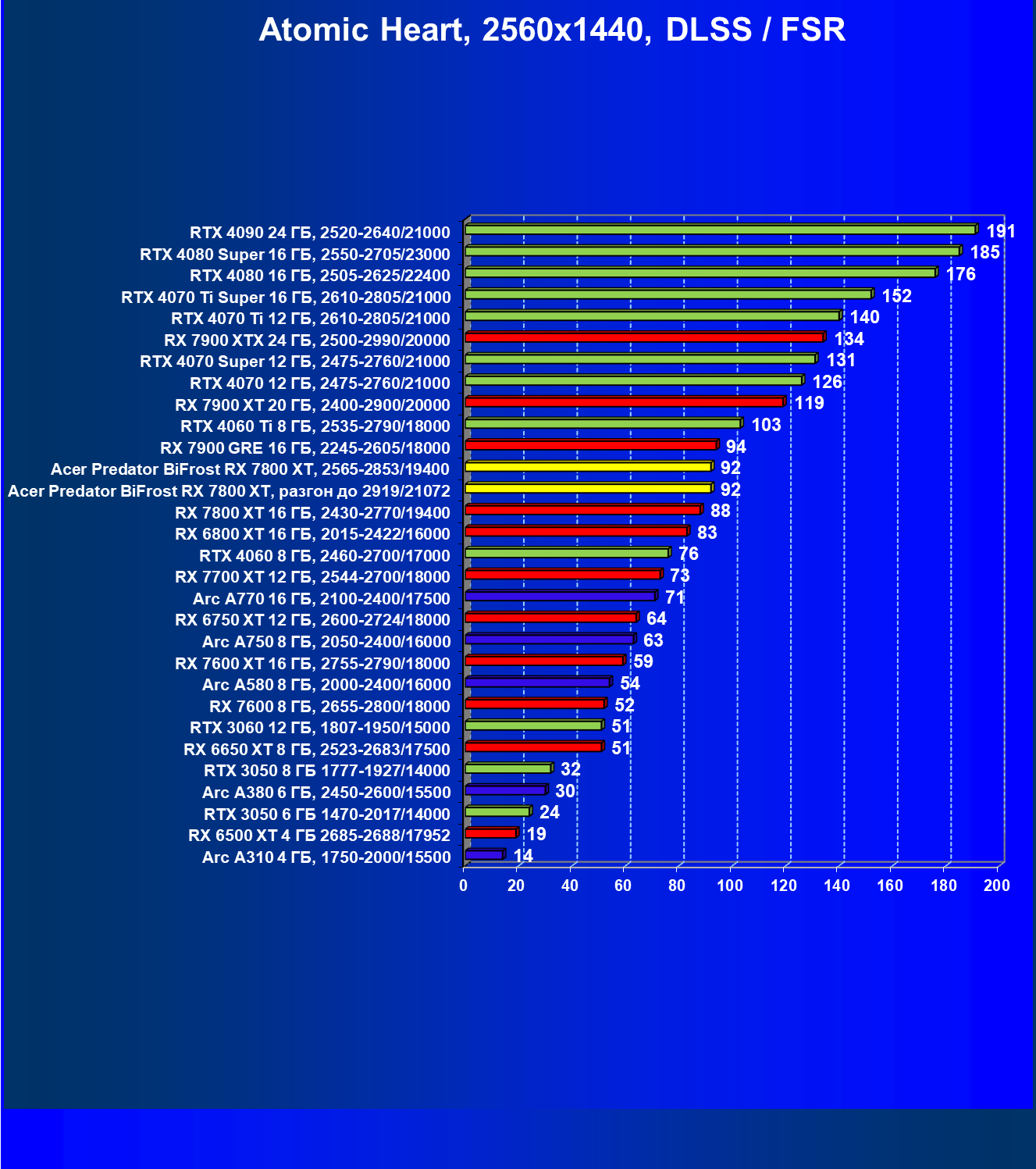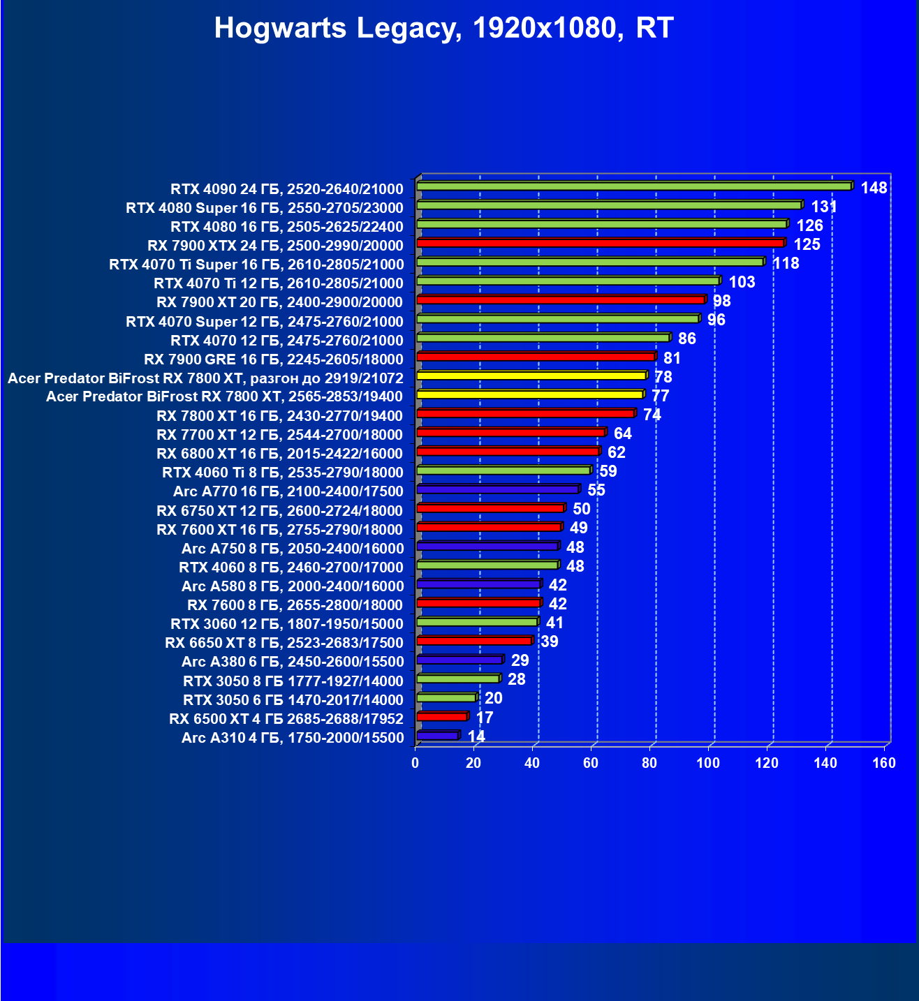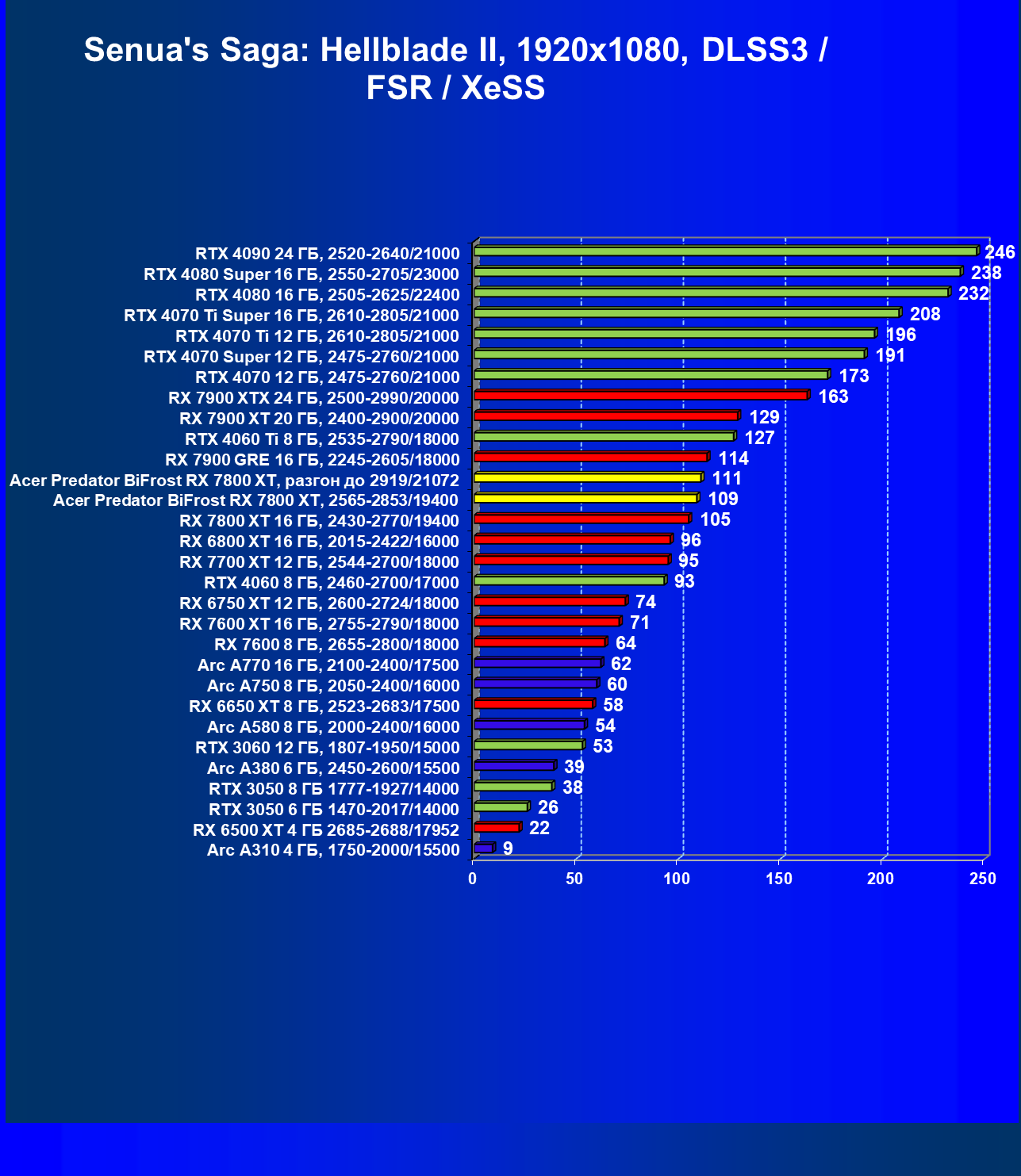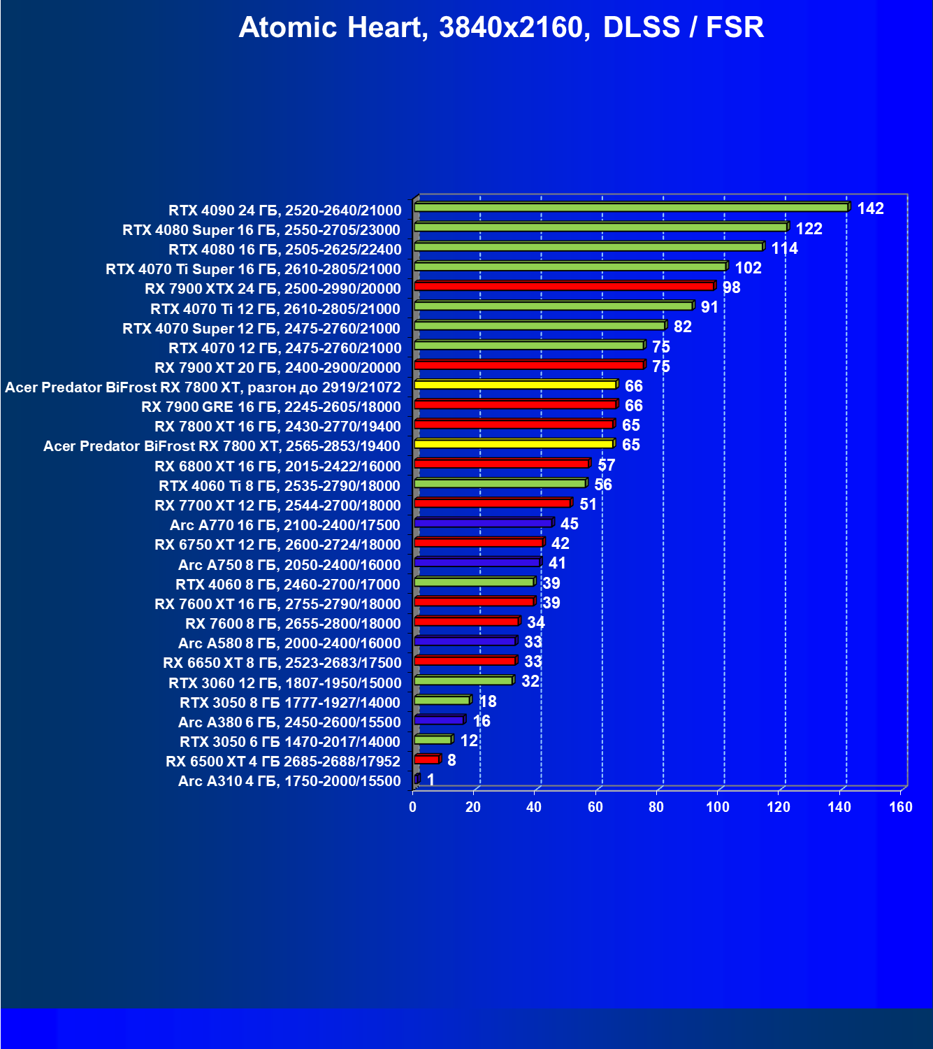 | 11 | Acer Predator BiFrost RX 7800 XT, 2565—2853/19400 | 1288 | 226 | 57 000 |