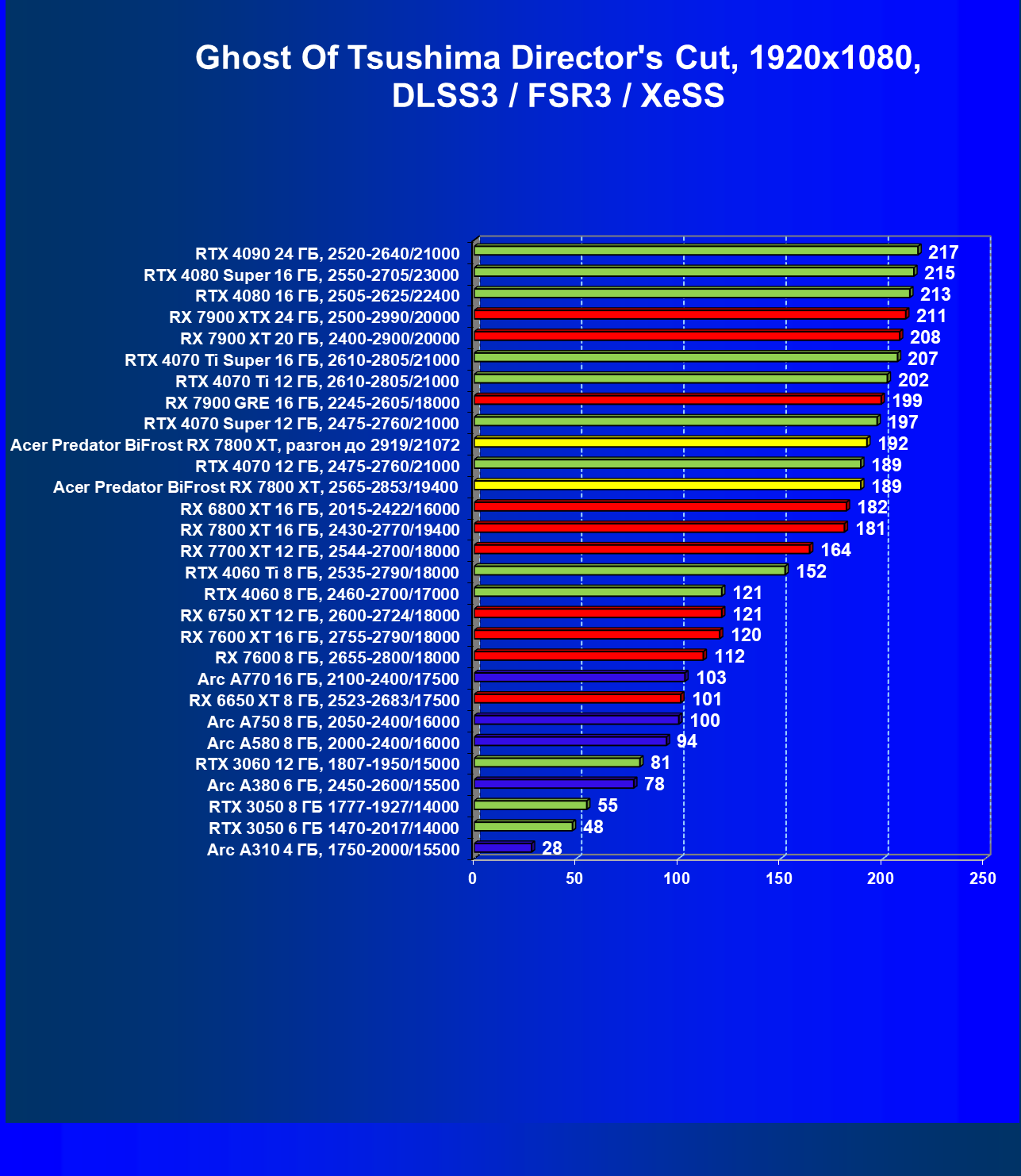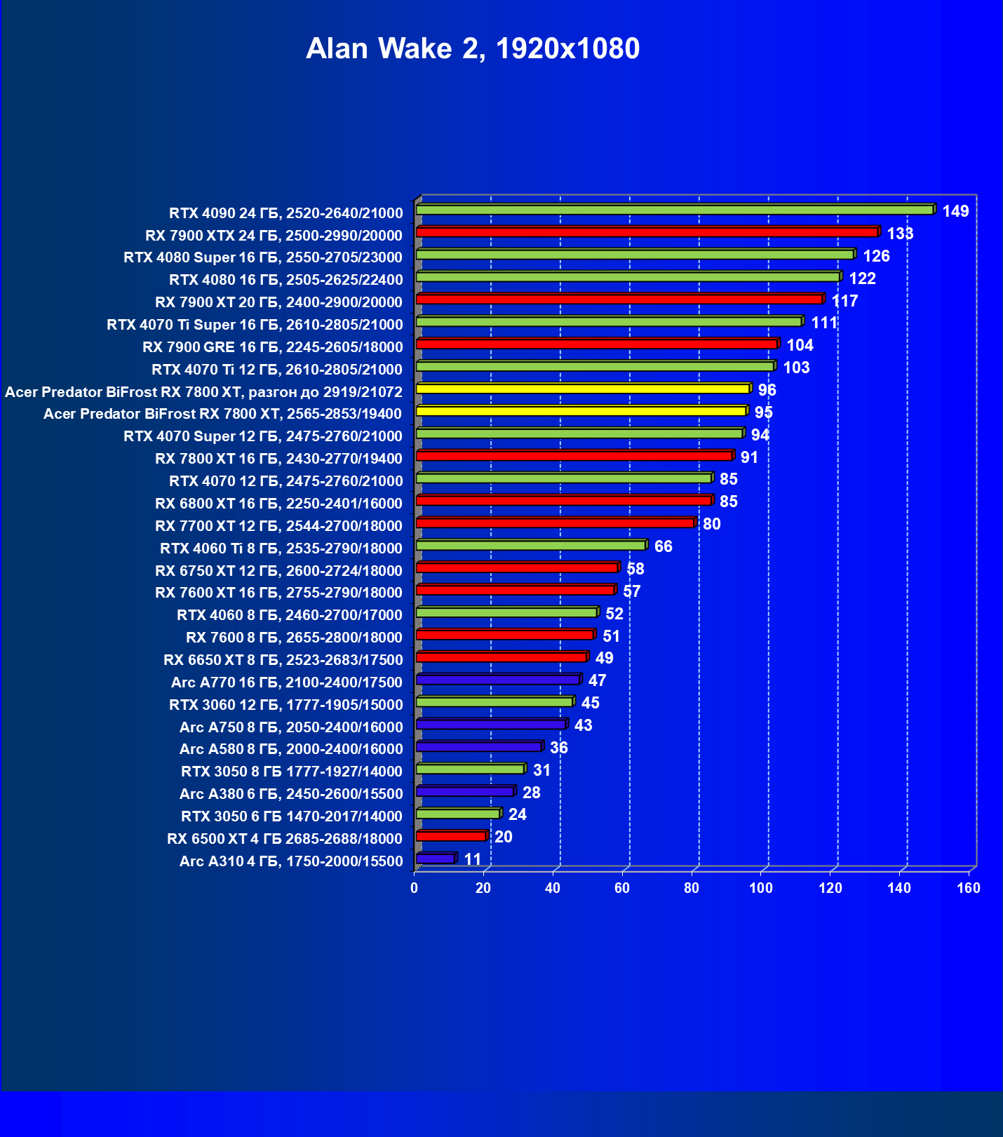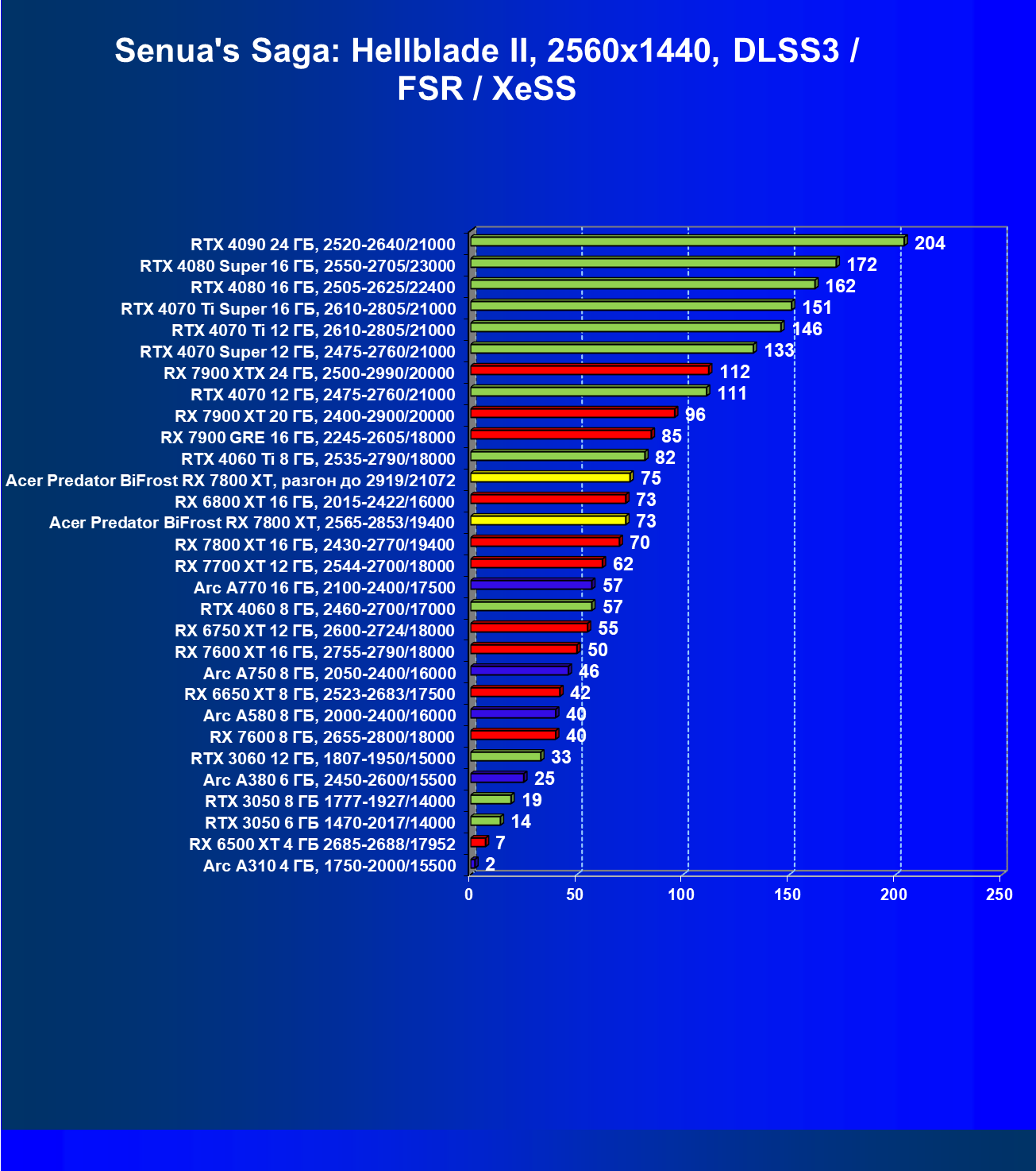 | 11 | Acer Predator BiFrost RX 7800 XT, 2565—2853/19400 | 1288 | 226 | 57 000 |