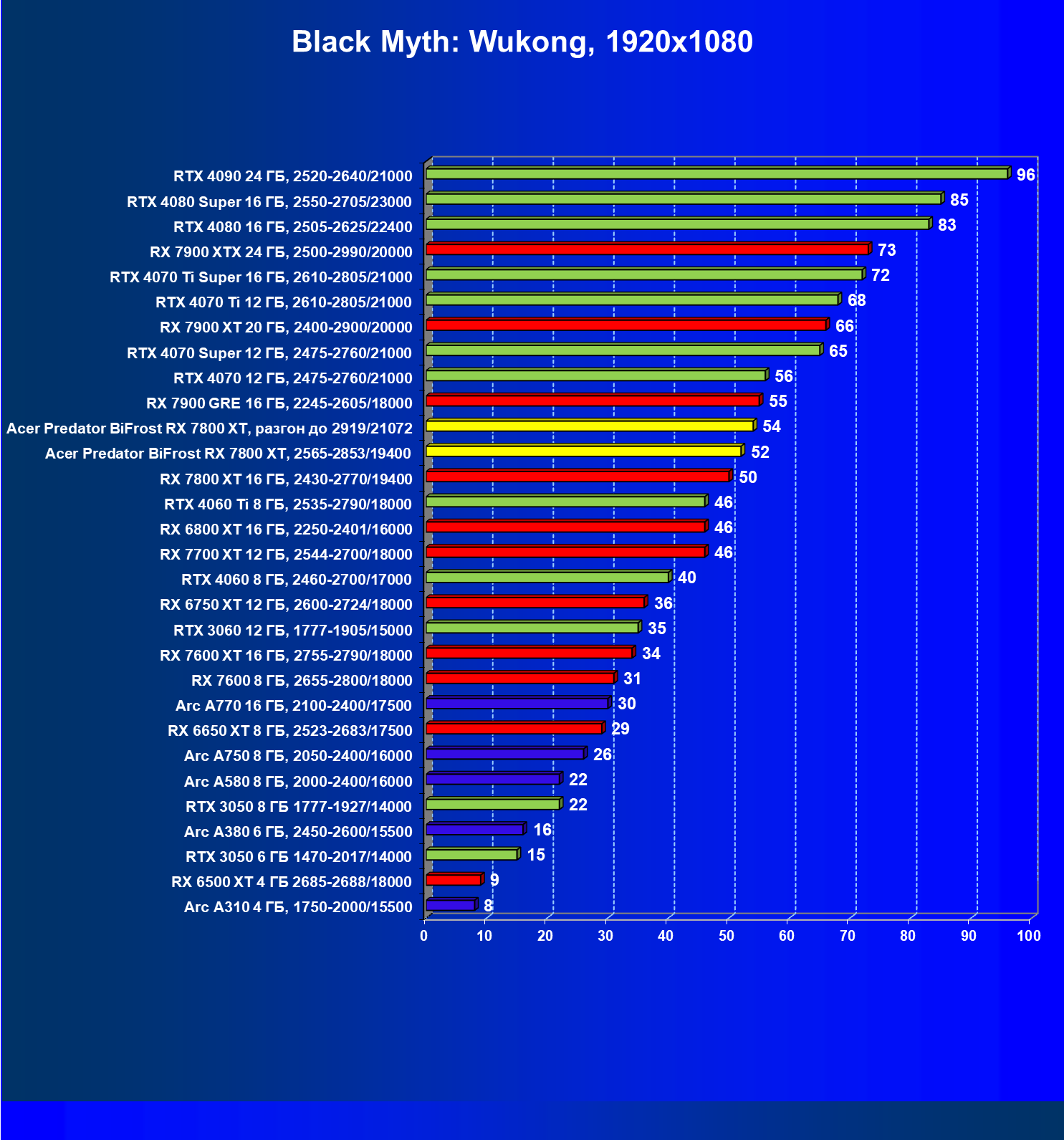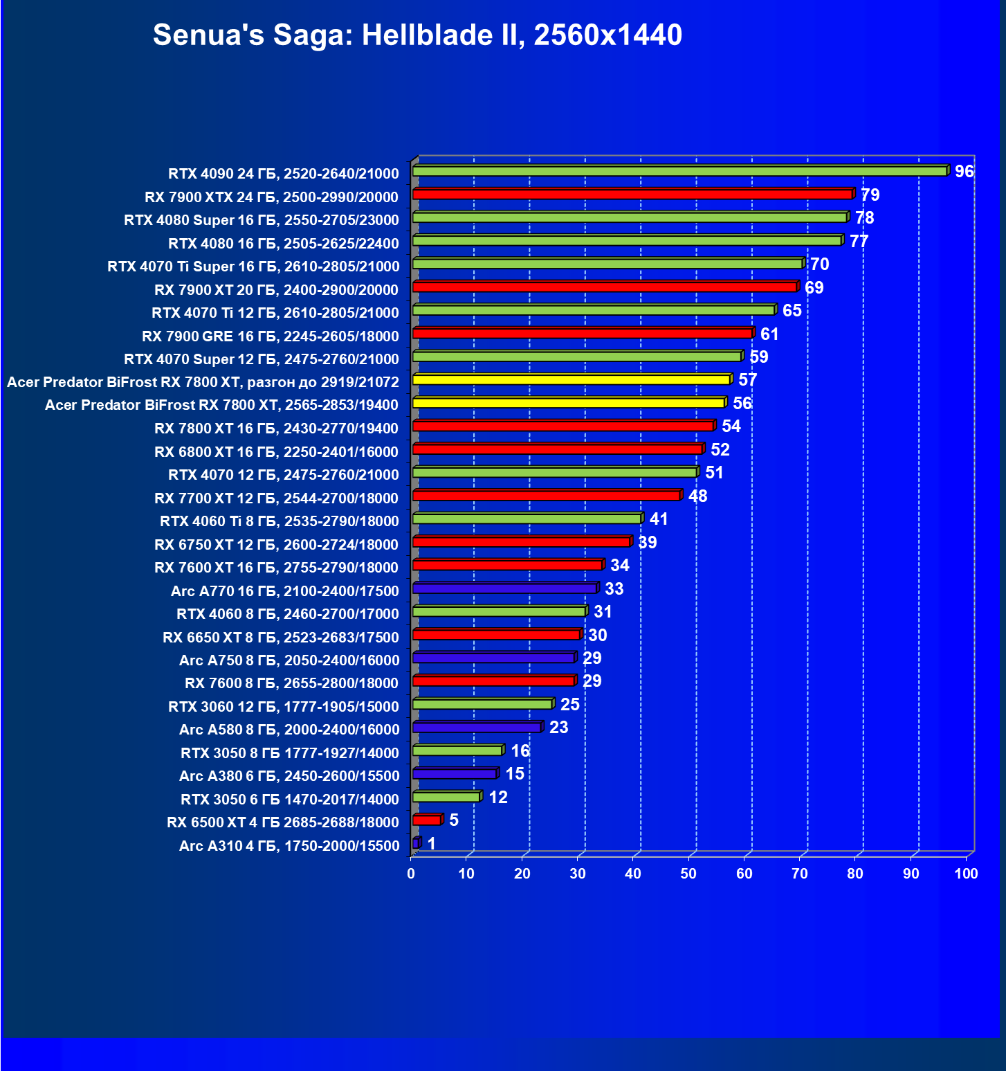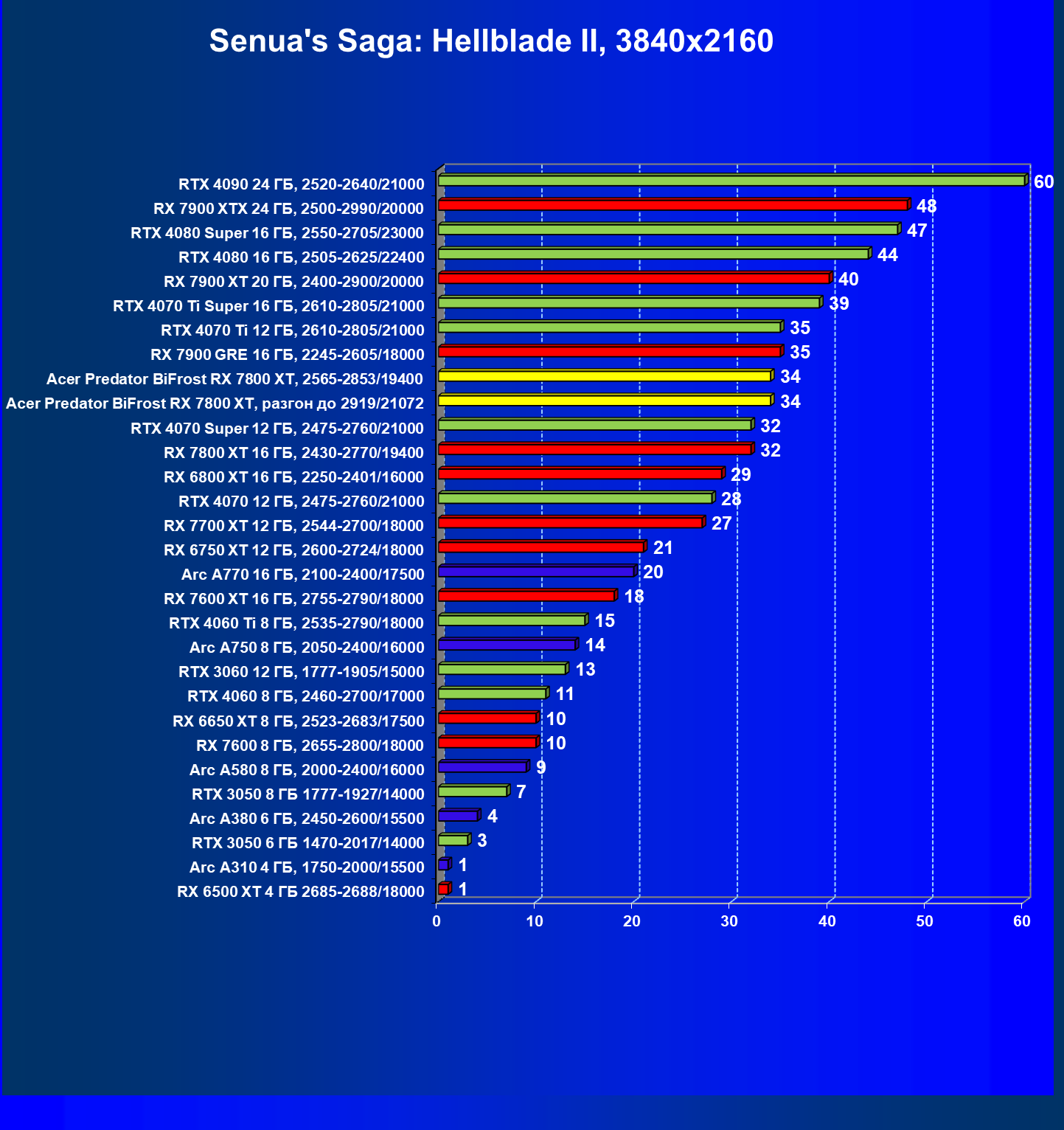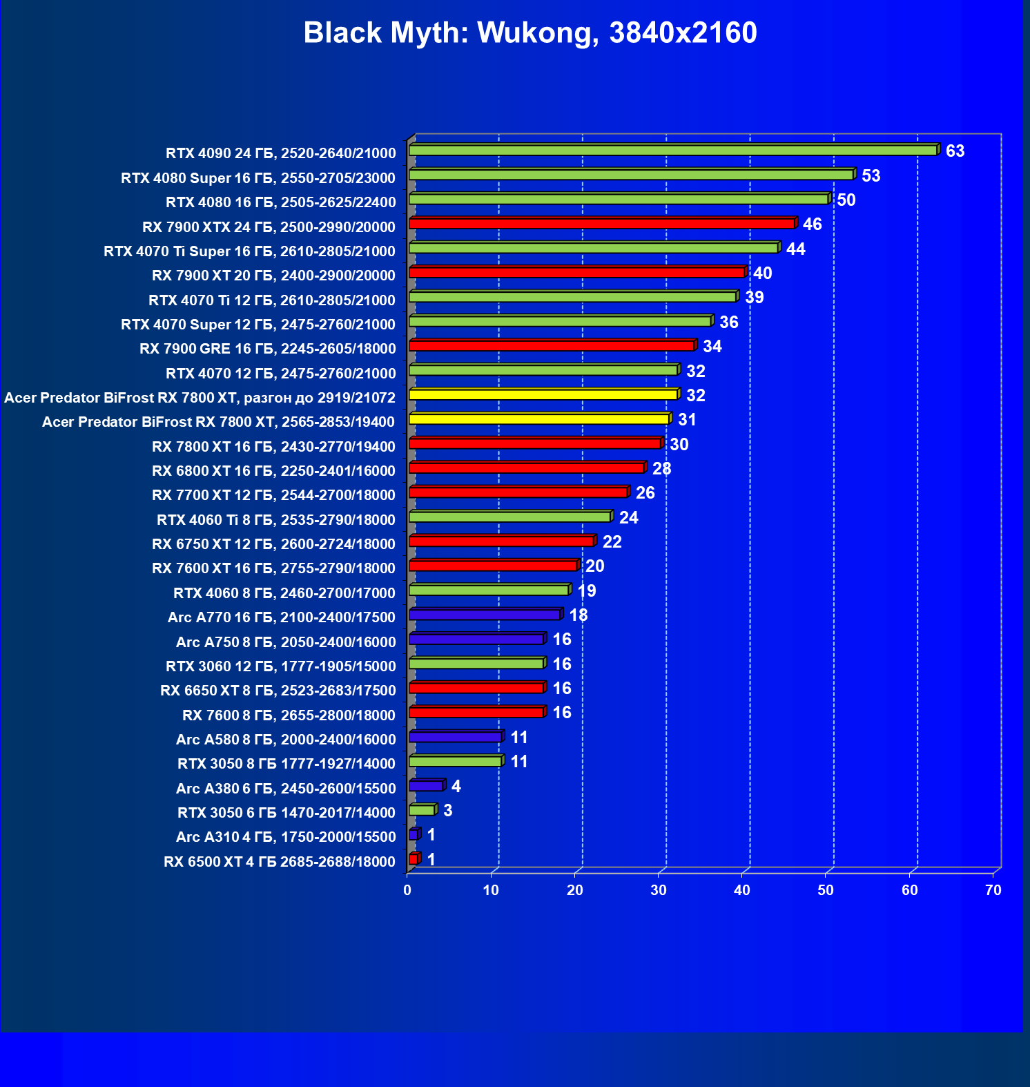 | 11 | Acer Predator BiFrost RX 7800 XT, 2565—2853/19400 | 1288 | 226 | 57 000 |