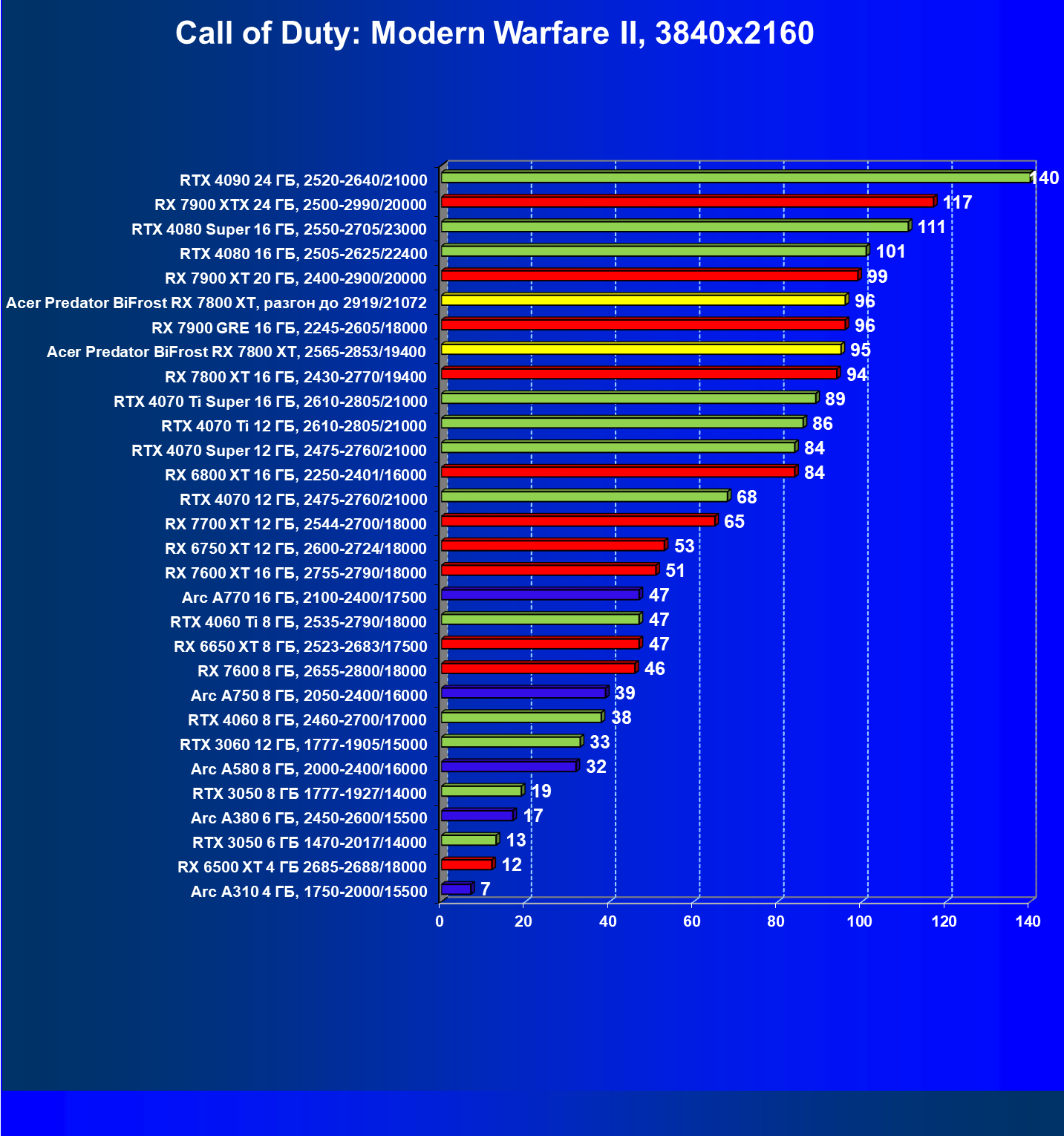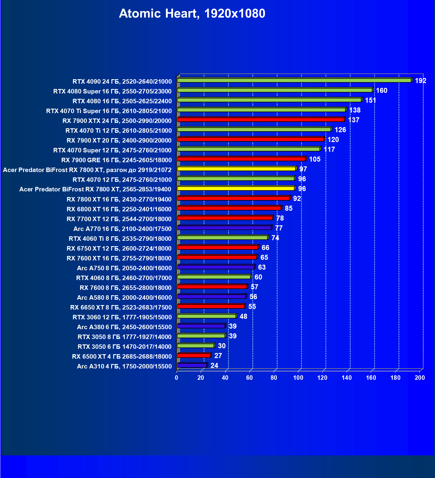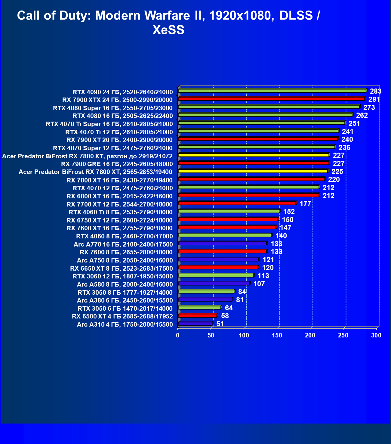 | 12 | Acer Predator BiFrost RX 7800 XT, 2565—2853/19400 | 1717 | 301 | 57 000 |