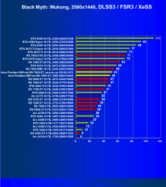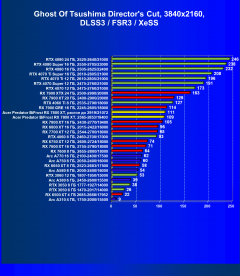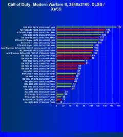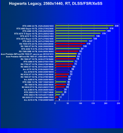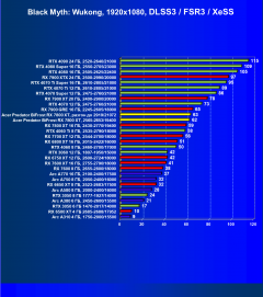 Рейтинг составлен по 10 тестам, в которых используется технология трассировки лучей и одновременно технология Nvidia DLSS, AMD FSR или Intel XeSS. Этот рейтинг нормирован по самому слабому ускорителю — Arc A310 (то есть сочетание скорости и функций Arc A310 приняты за 100%).