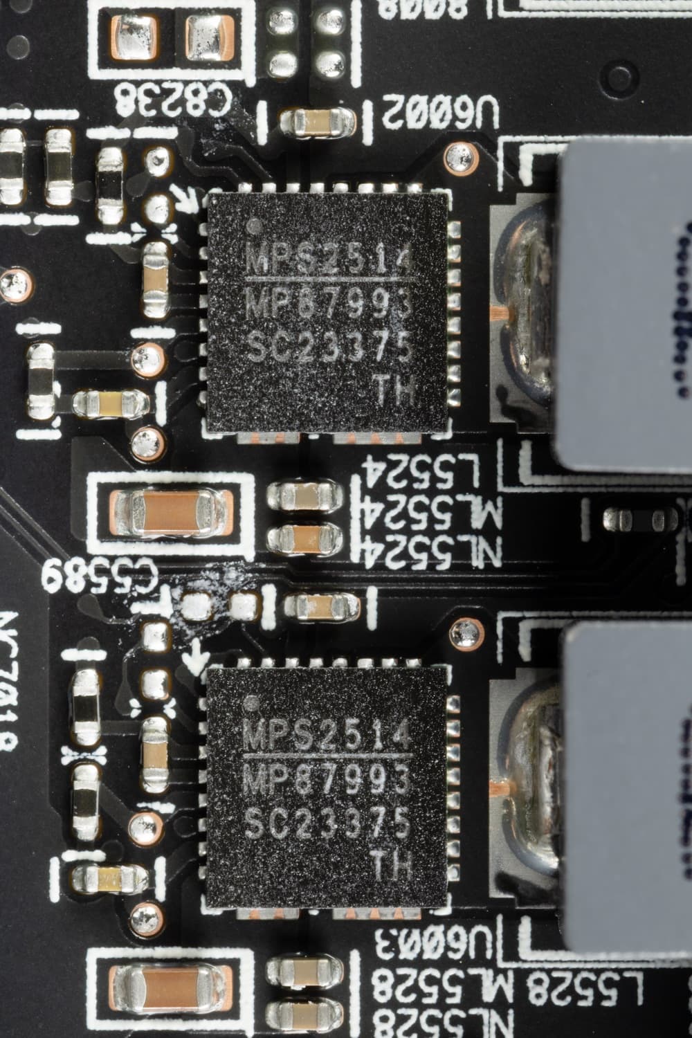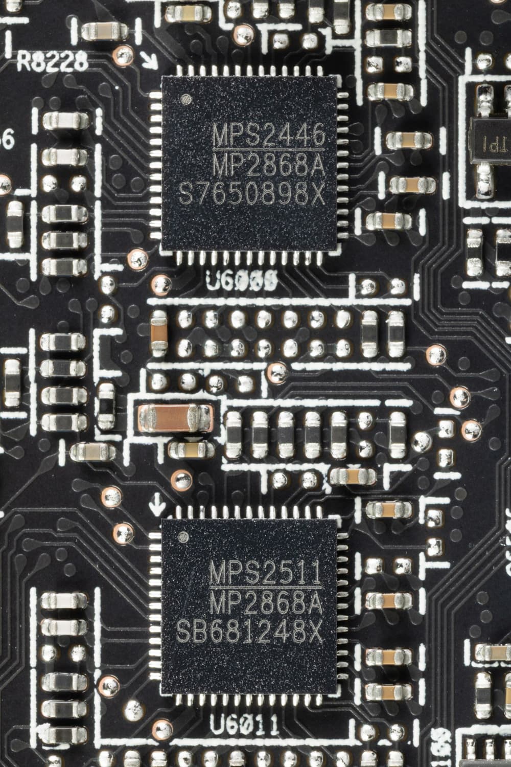 У карты имеется два ШИМ-контроллера Monolithic Power Systems MP2868, они работают в паре и управляют обеими схемами питания.