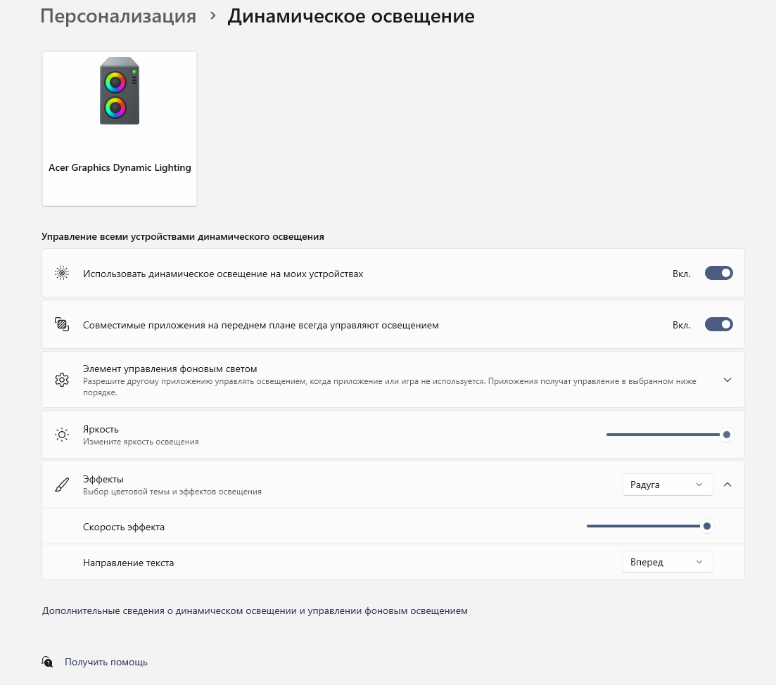 Для управления подсветкой требуется установить вышеобозначенную утилиту Predator BiFrost, однако в ней самой контроля подсветкой нет, он отдан Windows через раздел персонализации в параметрах.