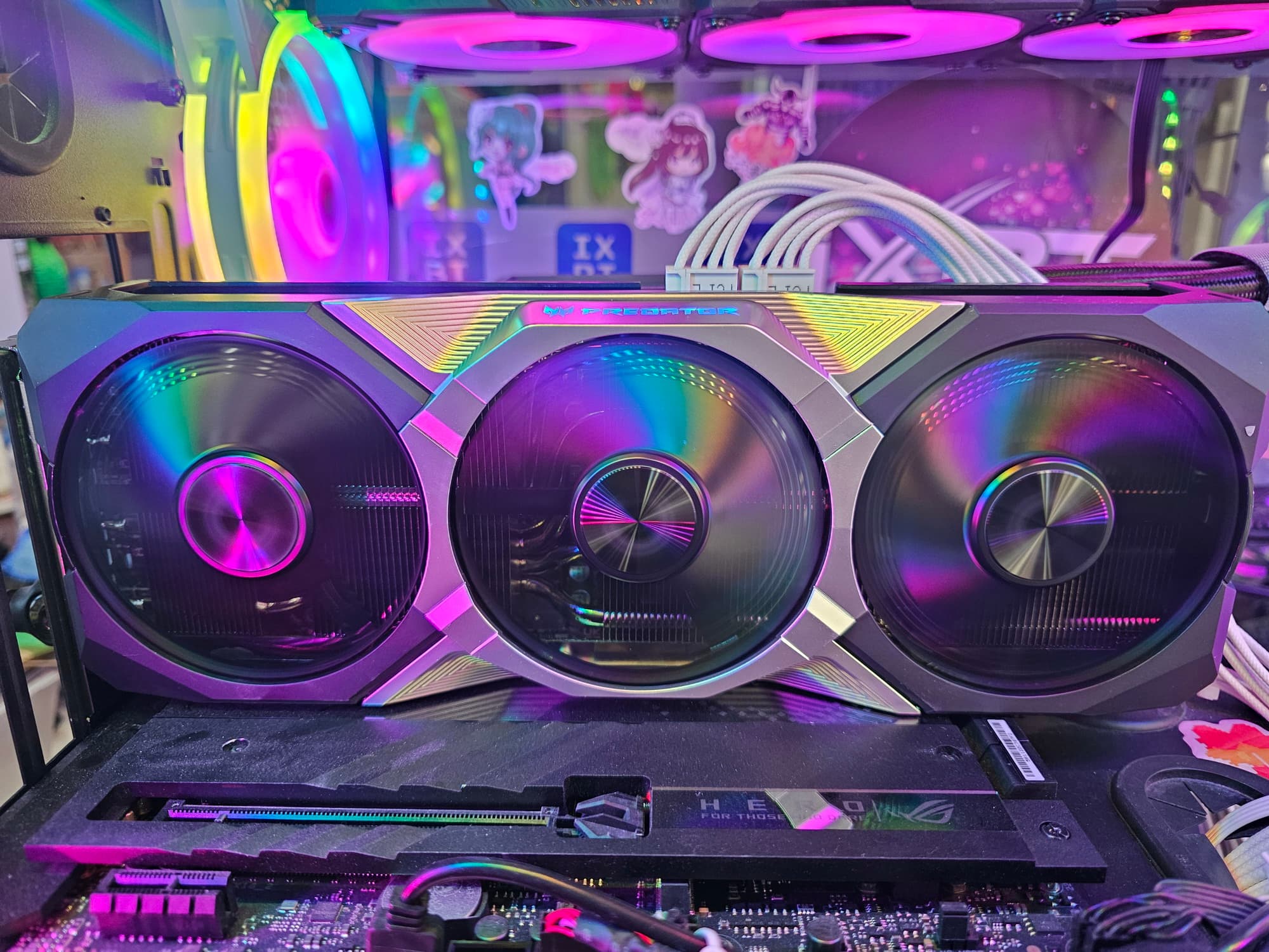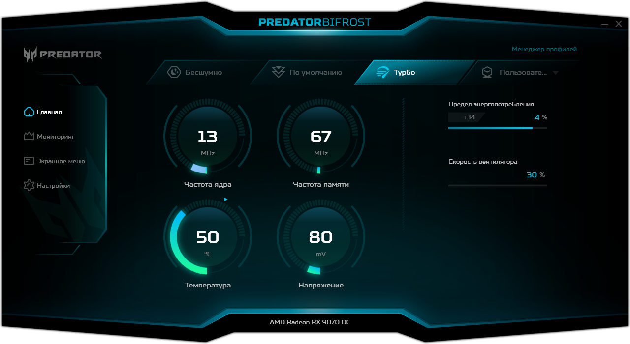 Для управления работой карт серии Predator производитель поставляет фирменную утилиту. Можно управлять вентиляторами, частотами работы и вольтажами, а также выбирать из трех заранее запрограммированных предустановок. Кроме того, программа выдает мониторинг состояния карты, а также можно настраивать работу OSD (в играх).