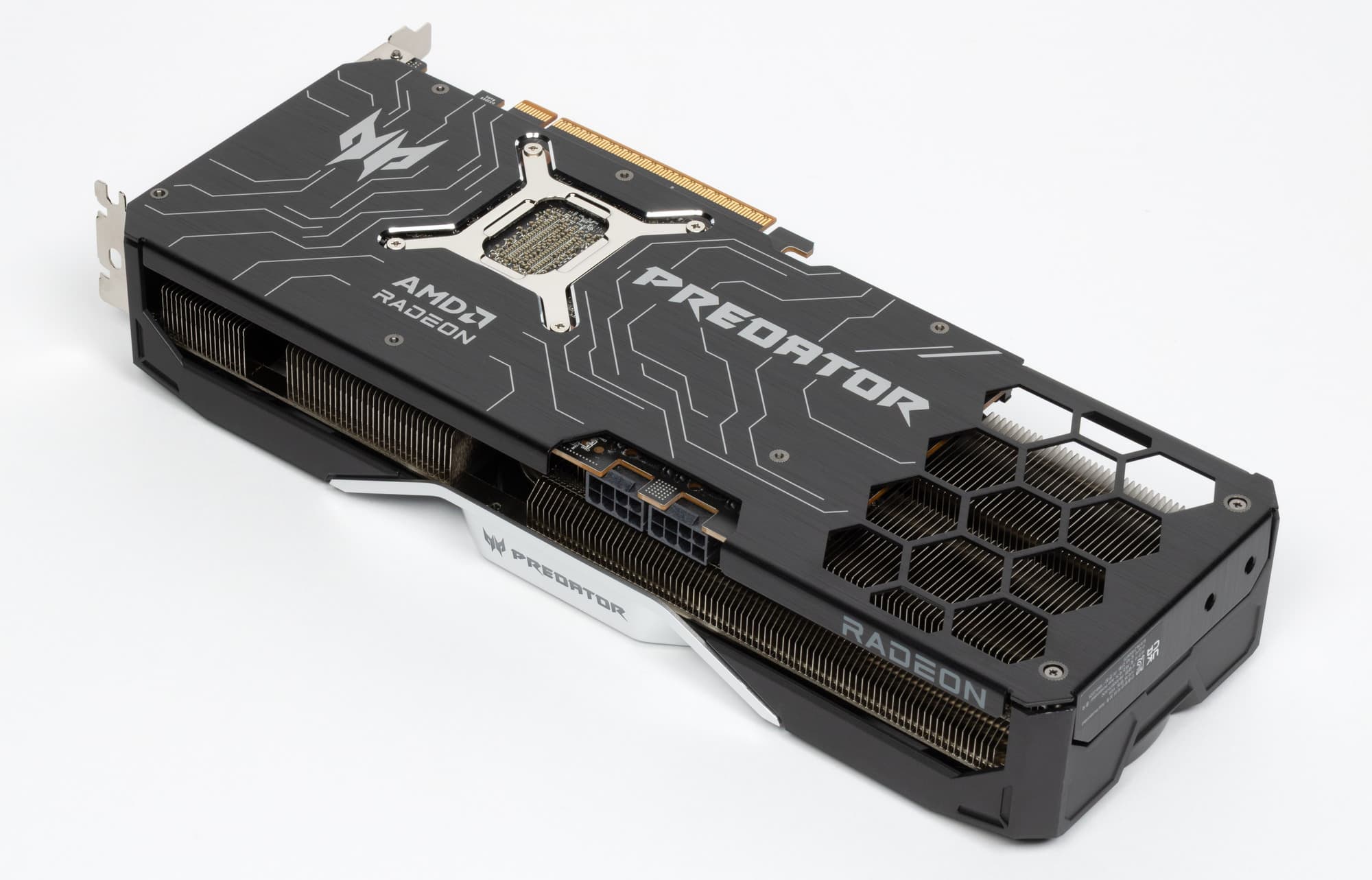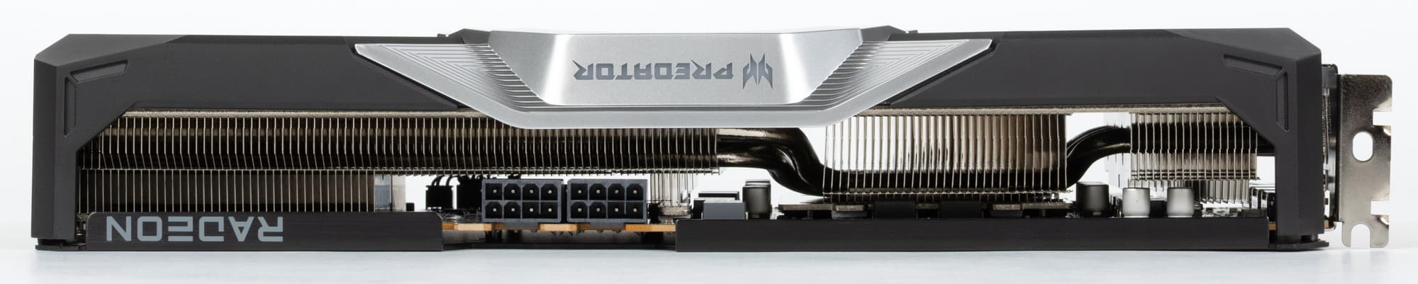7 трубок припаяны к большой пластине, которая охлаждает ядро и микросхемы памяти. Для охлаждения преобразователей питания VRM имеются свои подошвы на радиаторе. Задняя пластина служит только элементом защиты PCB, не участвуя в охлаждении тыльной стороны PCB.
