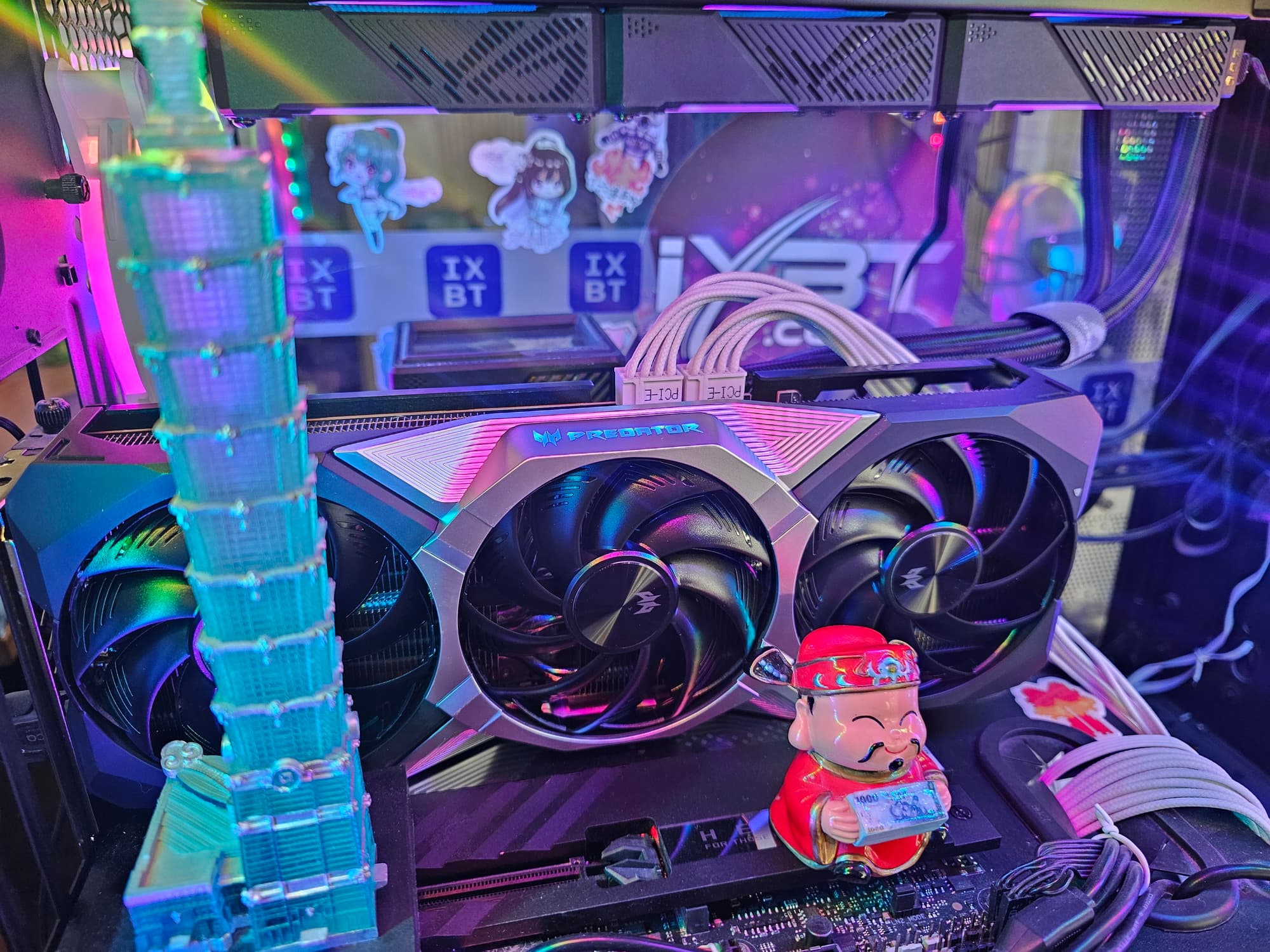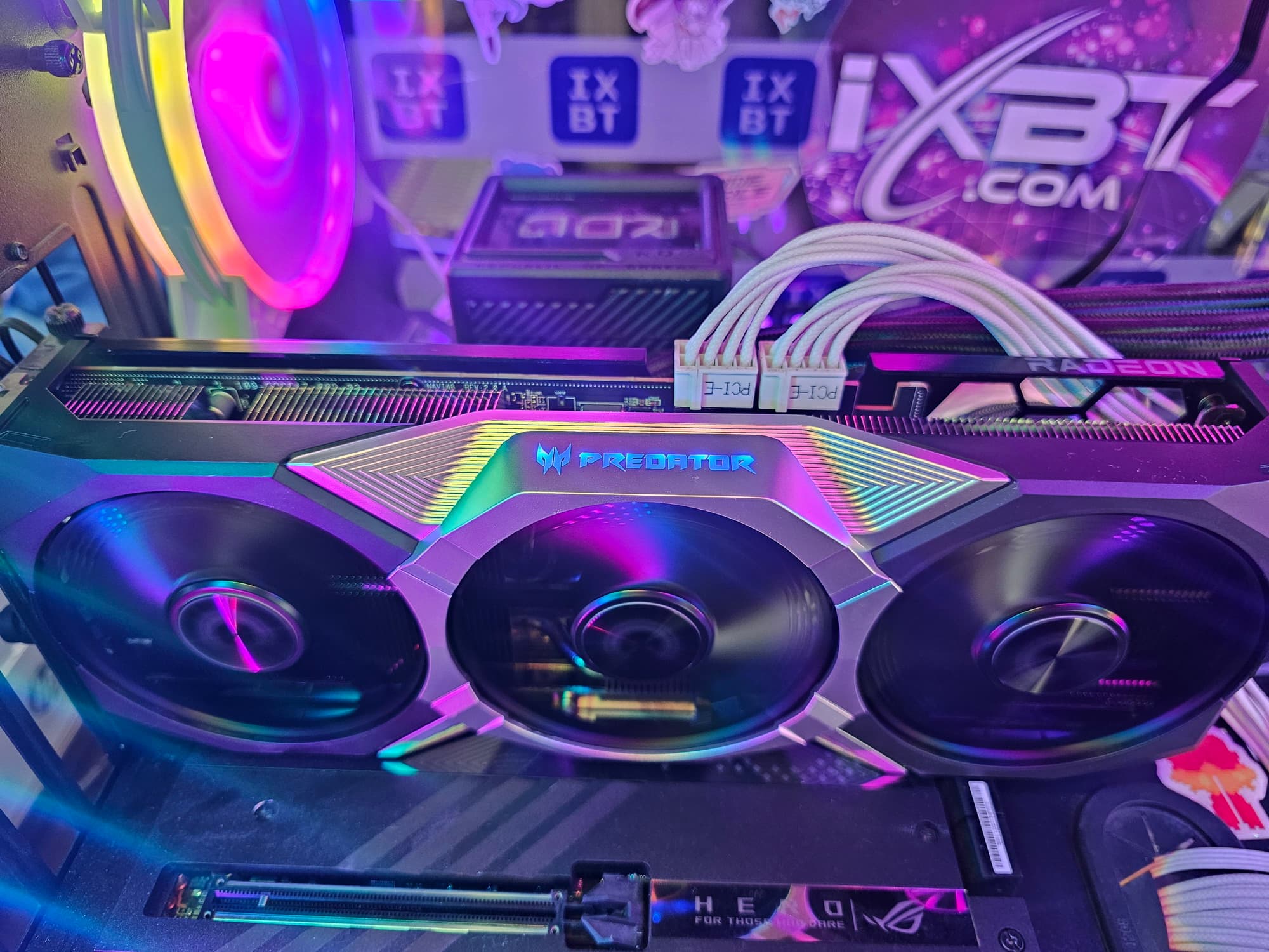 Видеокарта Acer Predator BiFrost Radeon RX 9070 OC (16 ГБ) основана на предфлагманском ускорителе AMD последнего поколения. Она имеет стандартные размеры (29,5 см в длину, де-факто 3 слота по толщине) и видеовыходы 3 DP 2.1b и 1 HDMI 2.1b. Максимальная потребляемая мощность составляет 247 Вт, питание осуществляется через два 8-контактных разъема версии PCIe 2.0, кулер тихий, нагрев сравнительно низкий. У карты яркая подсветка на верхнем торце.