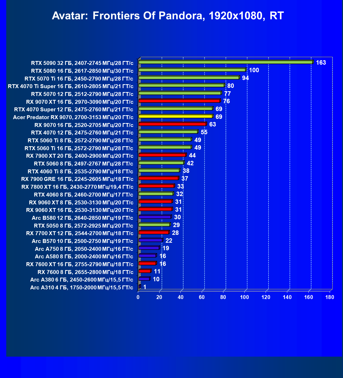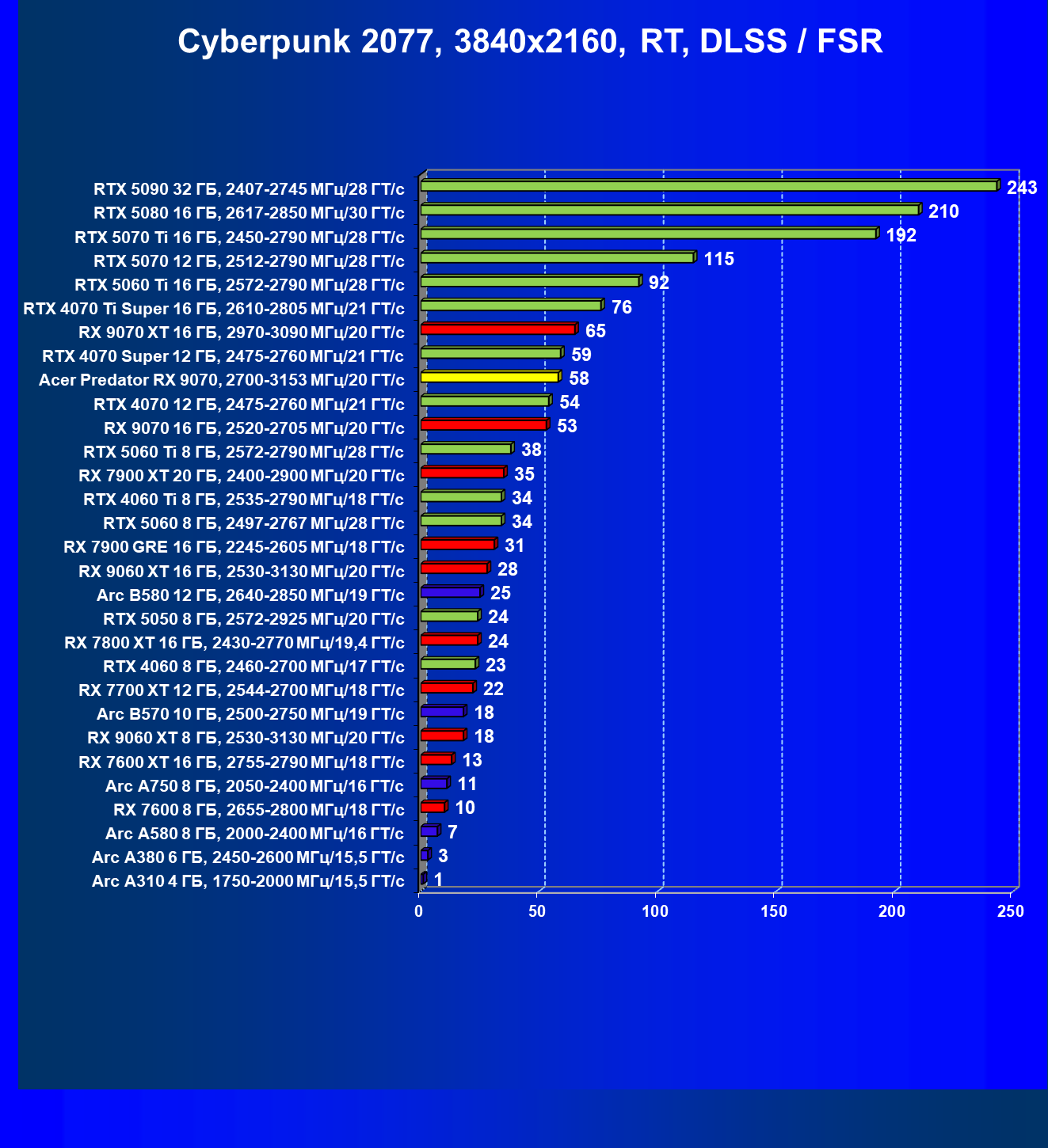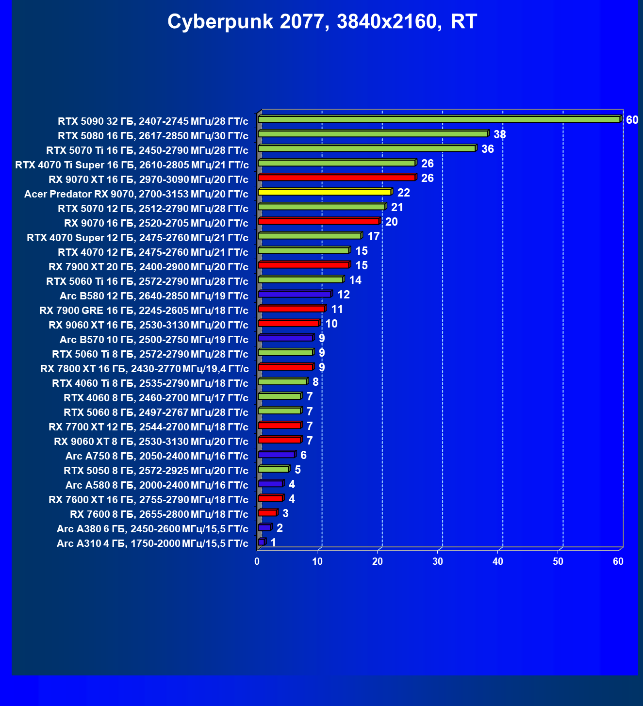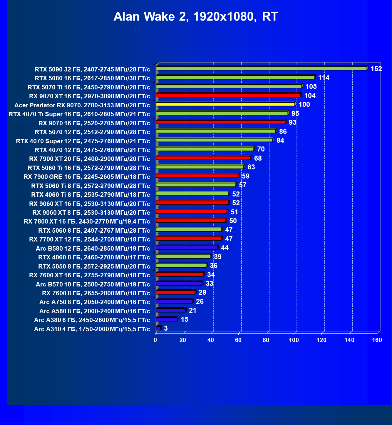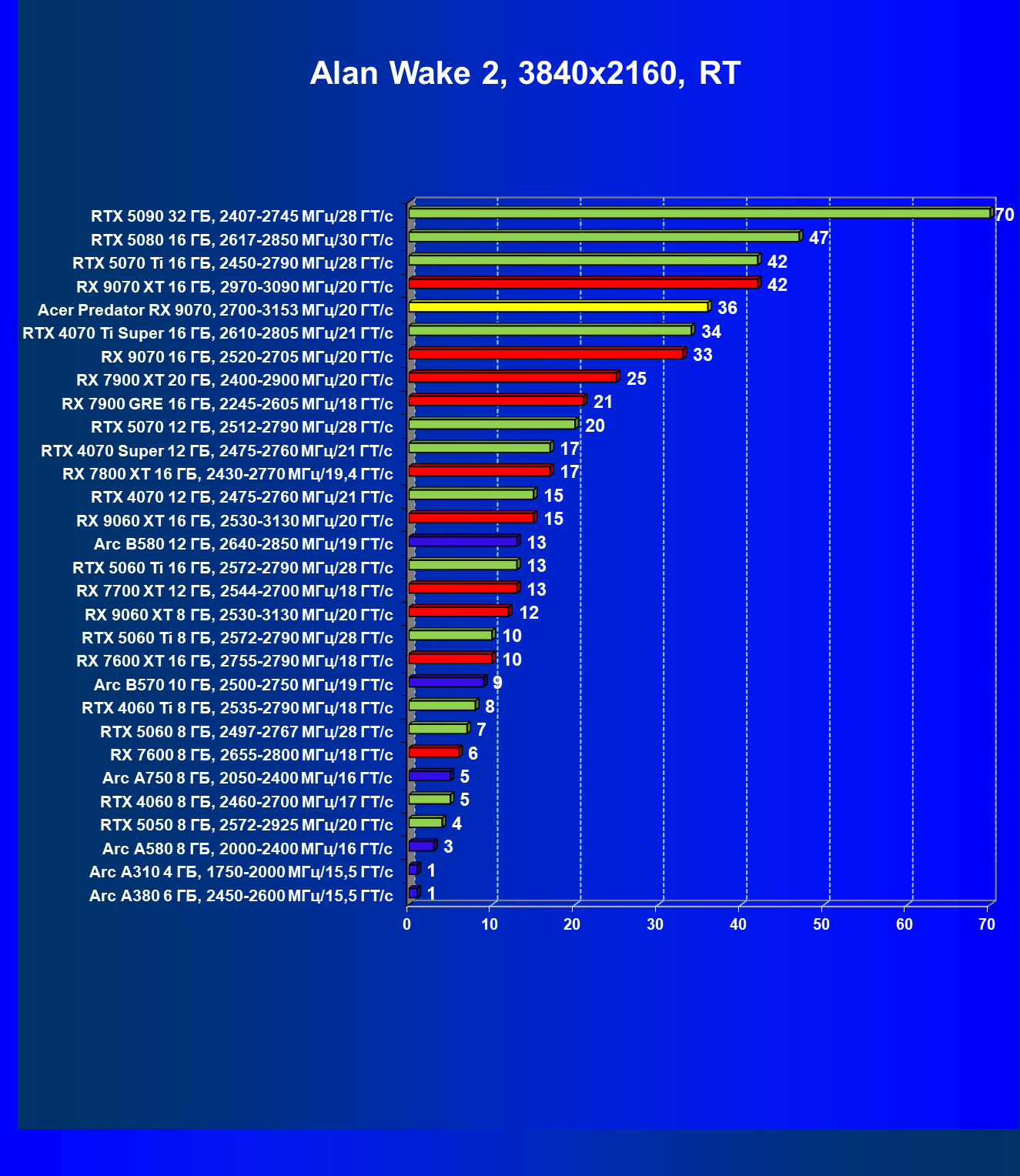 | 05 | Acer Predator RX 9070, 2700—3153 МГц/20 ГТ/с | 2504 | 358 | 70 000 |