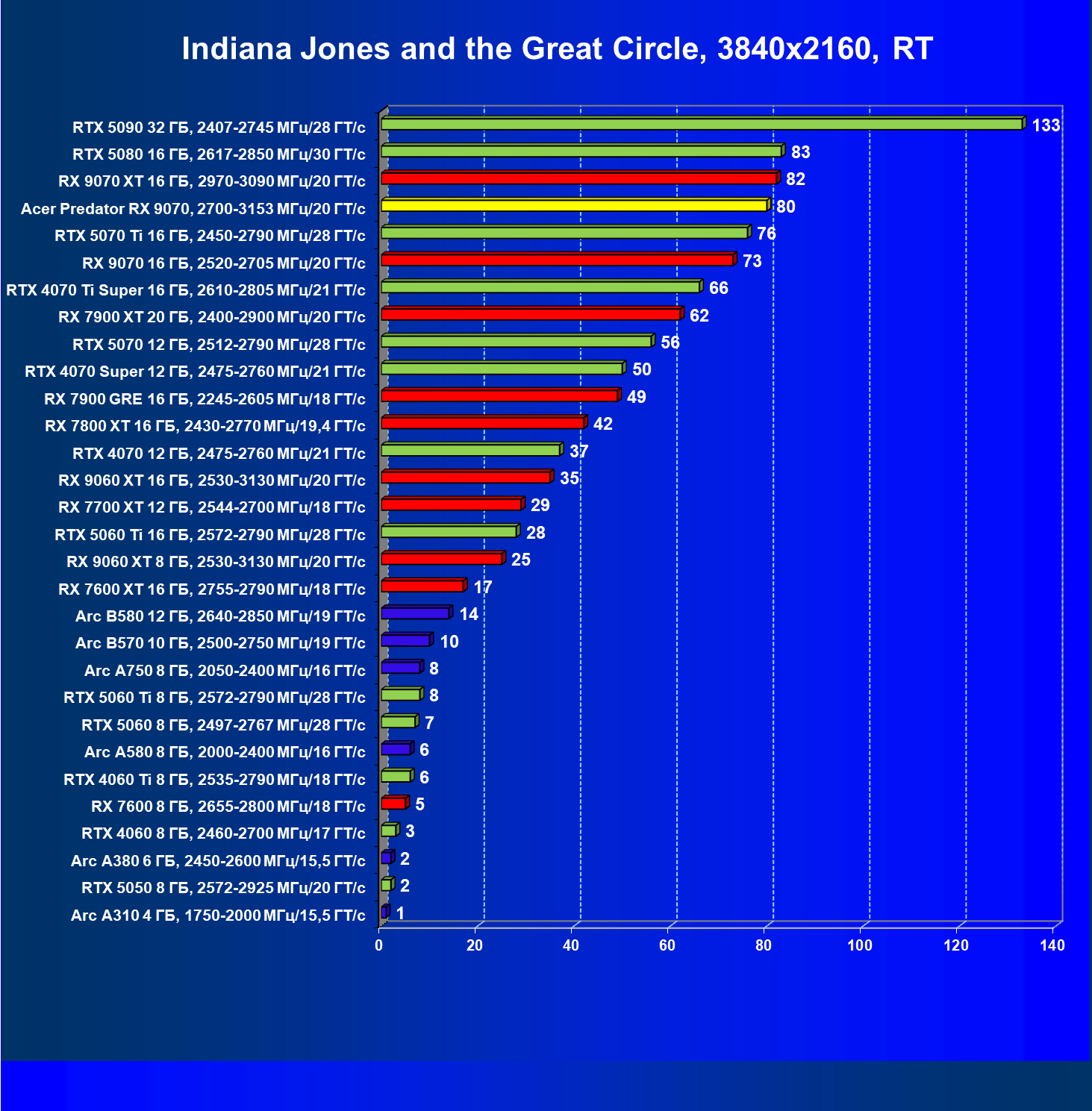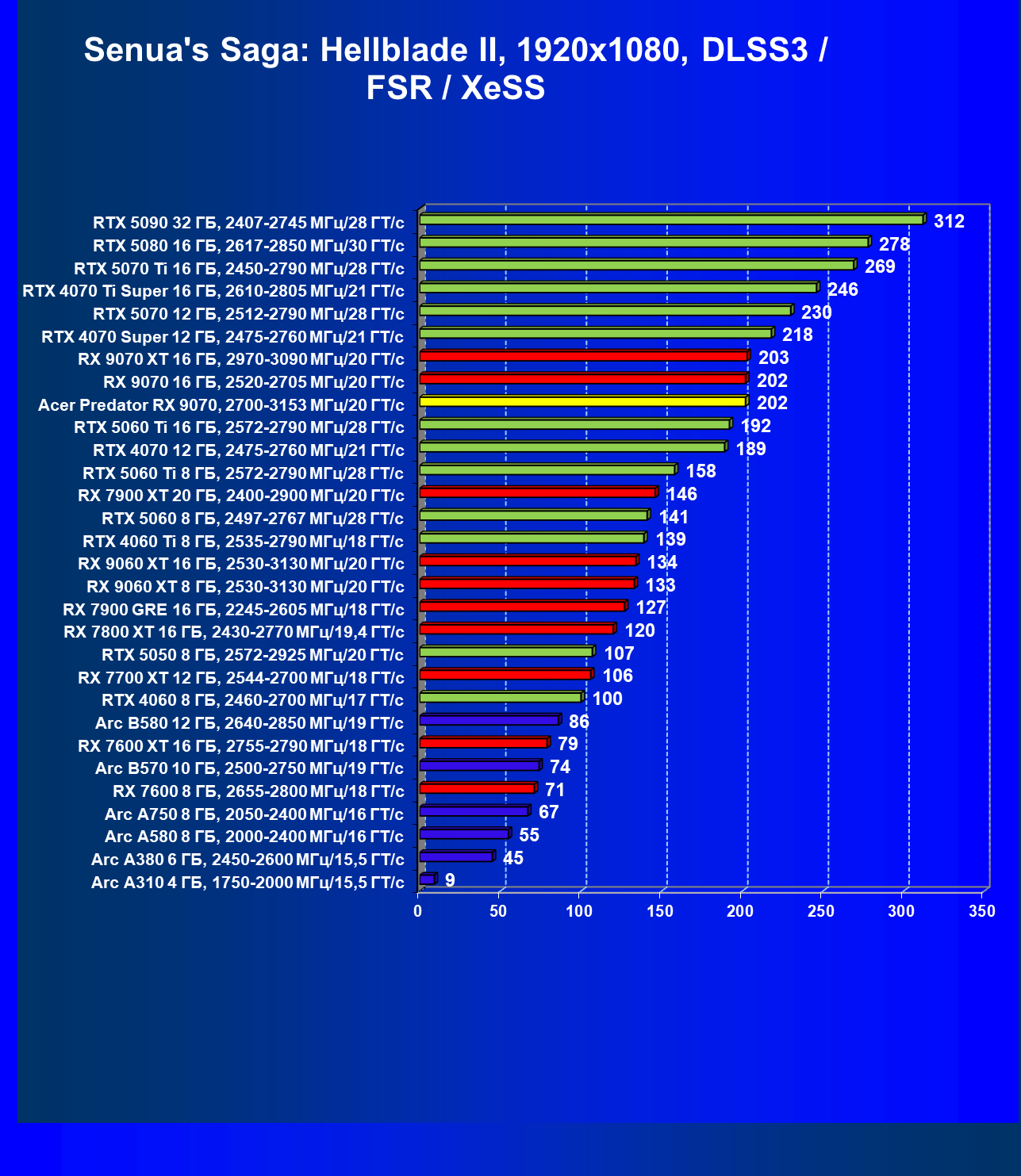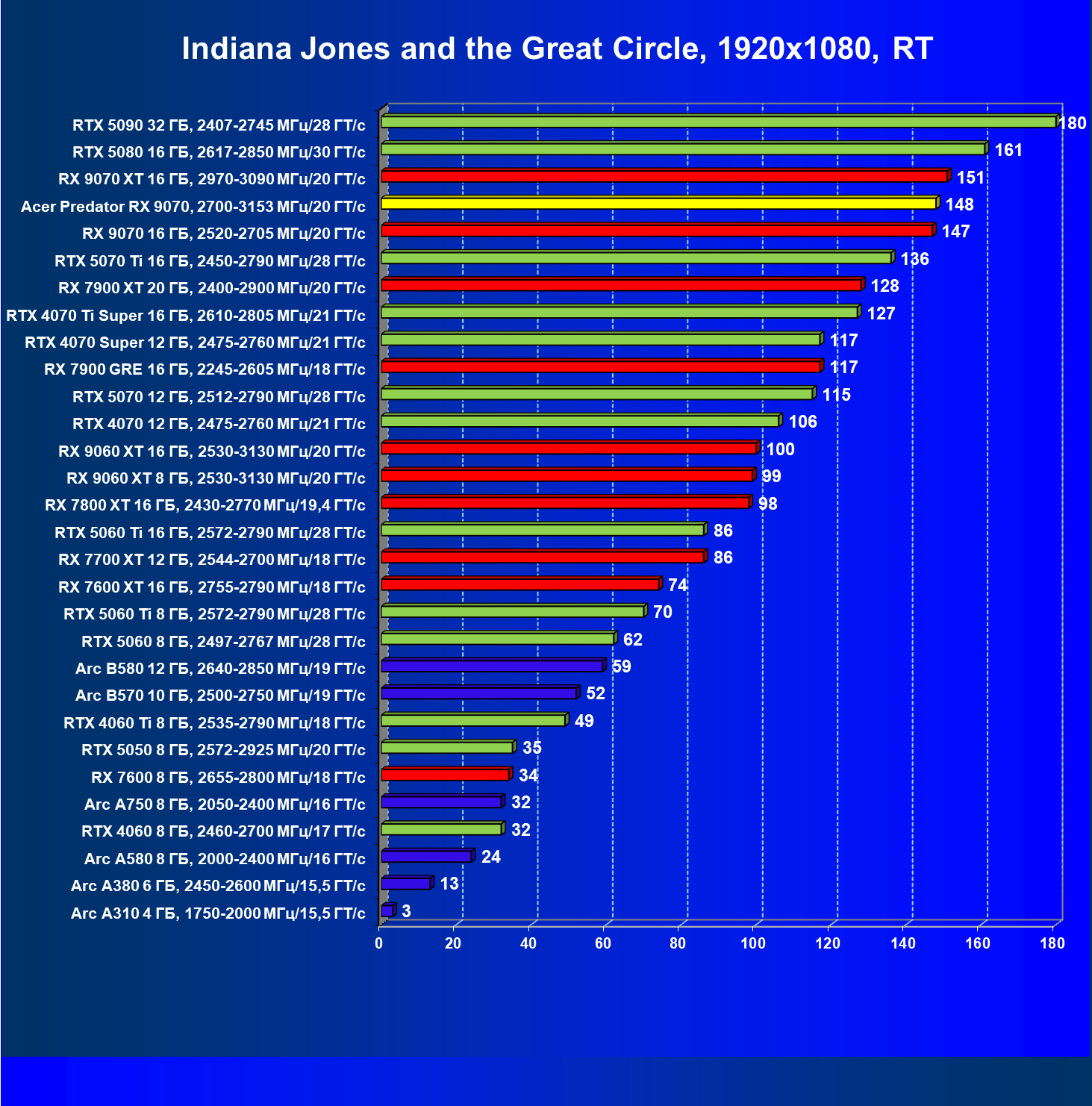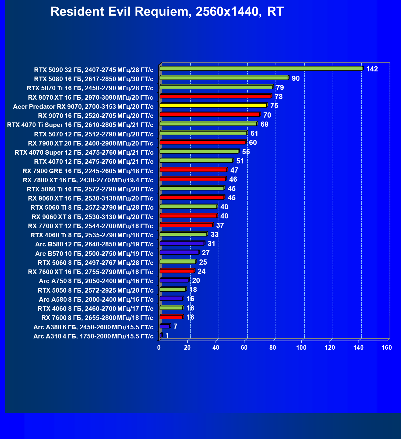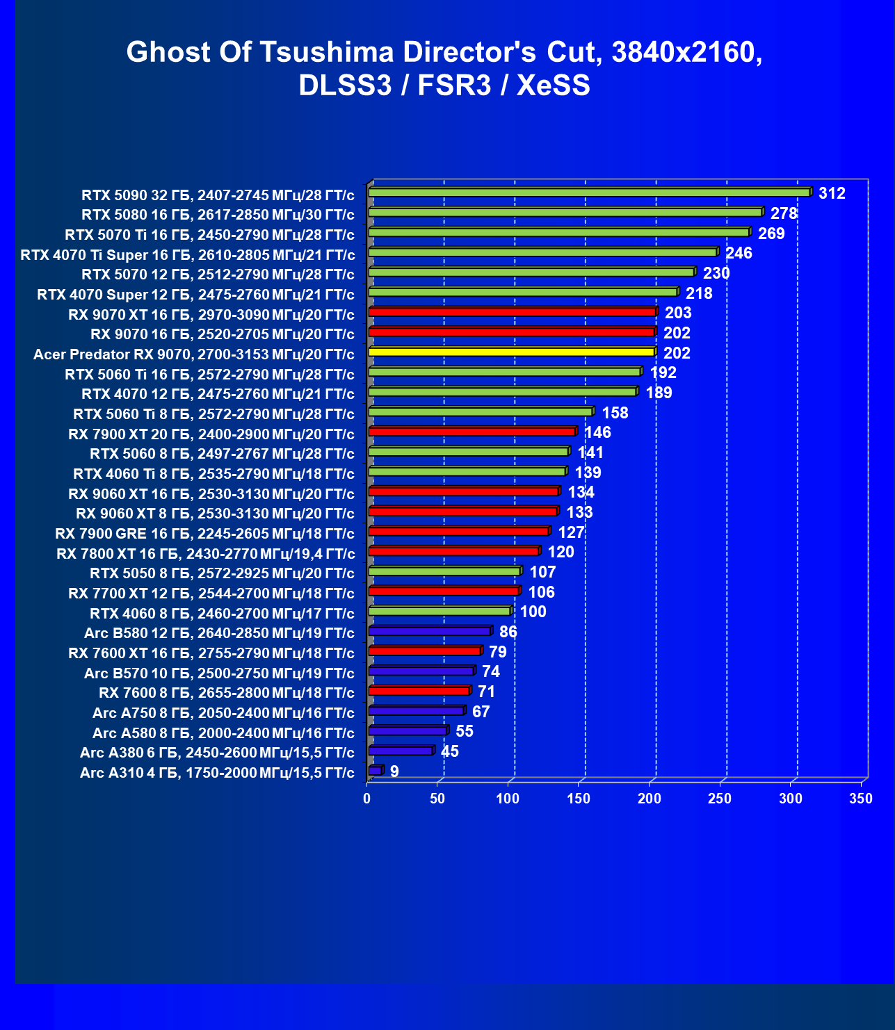 | 05 | Acer Predator RX 9070, 2700—3153 МГц/20 ГТ/с | 2504 | 358 | 70 000 |
