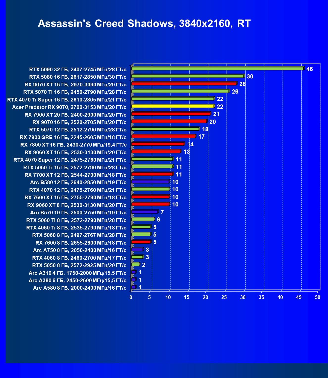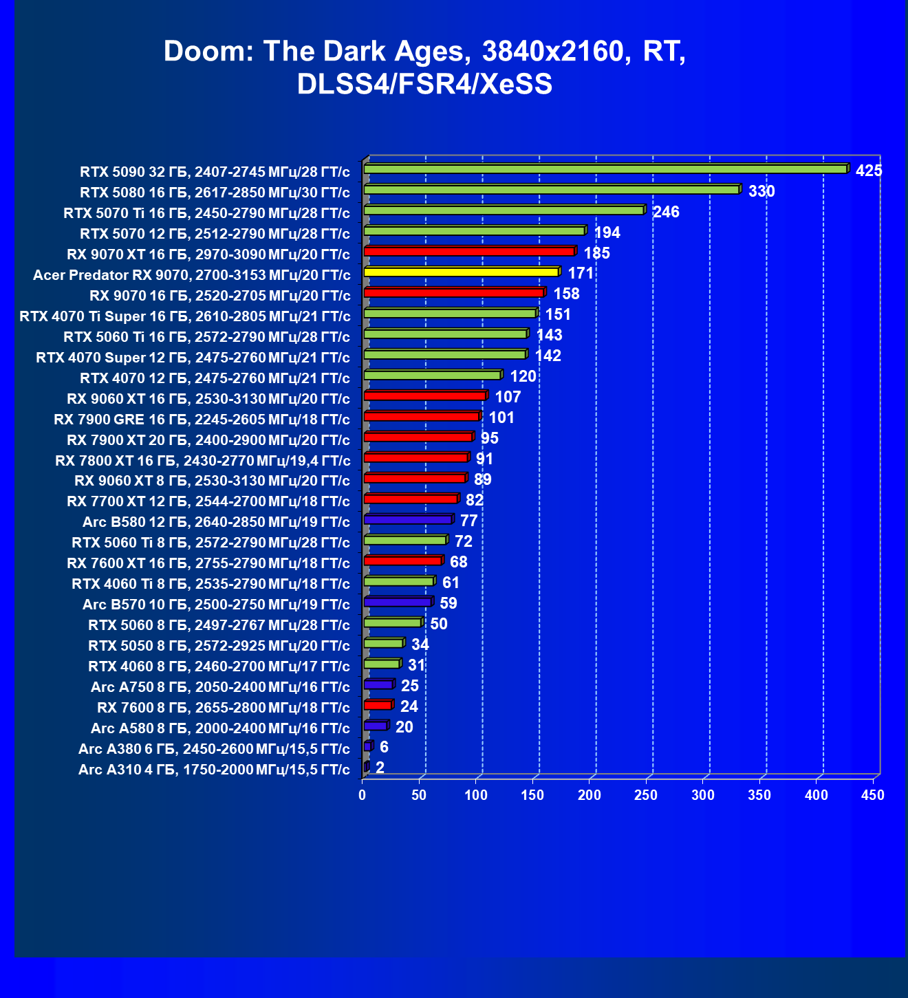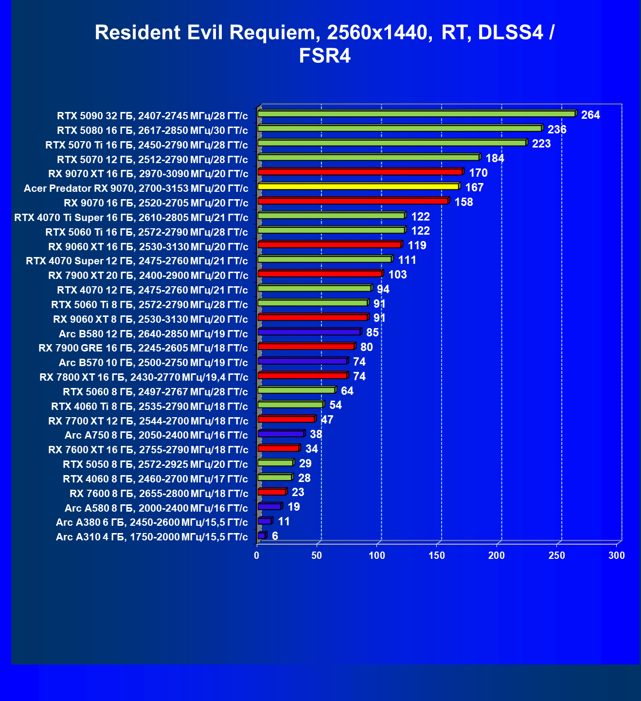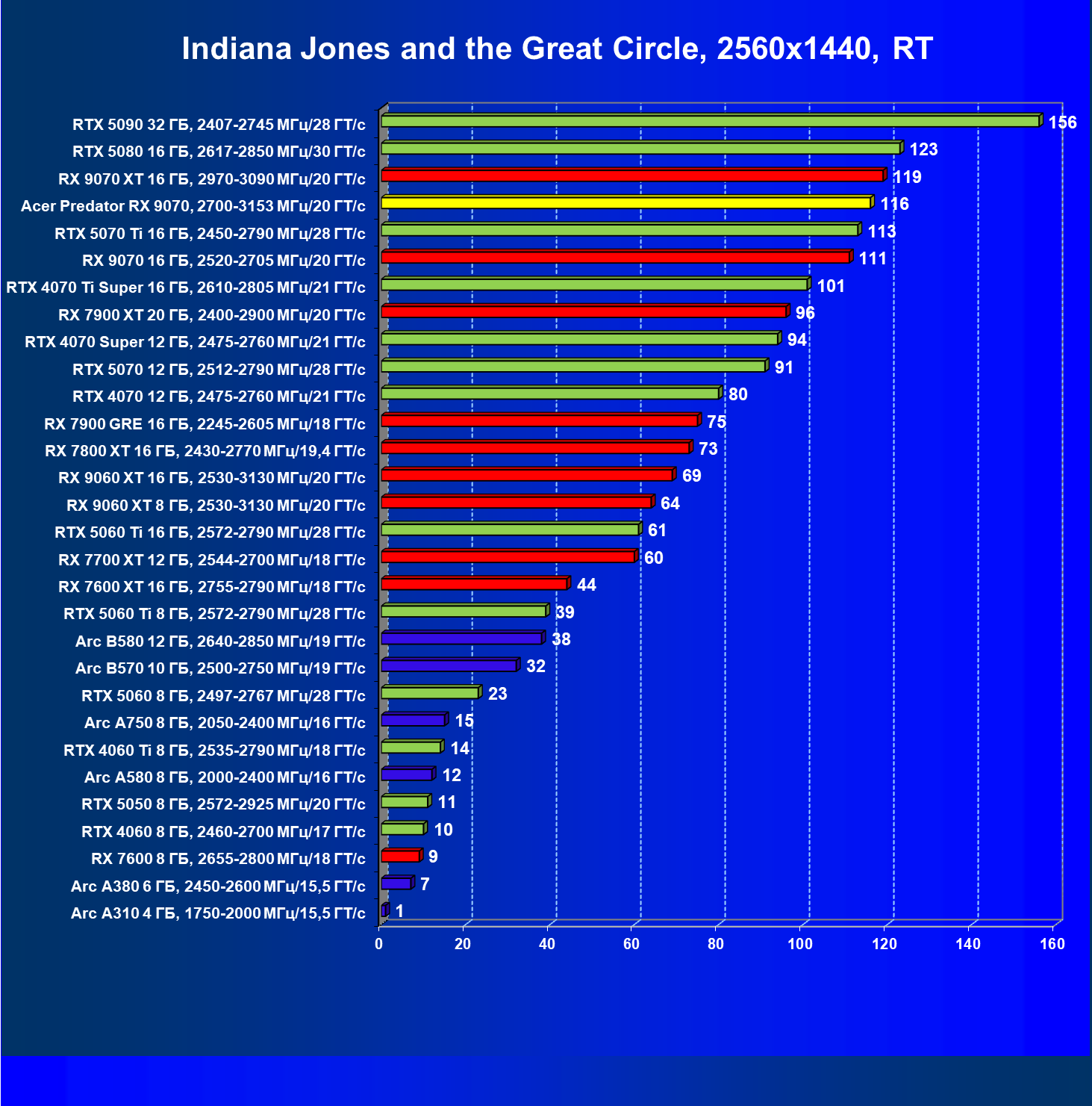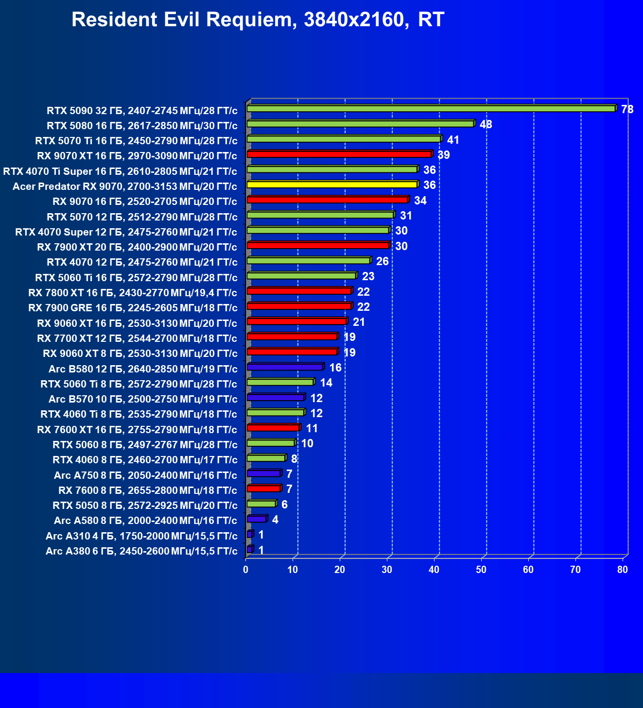 | 05 | Acer Predator RX 9070, 2700—3153 МГц/20 ГТ/с | 2504 | 358 | 70 000 |
