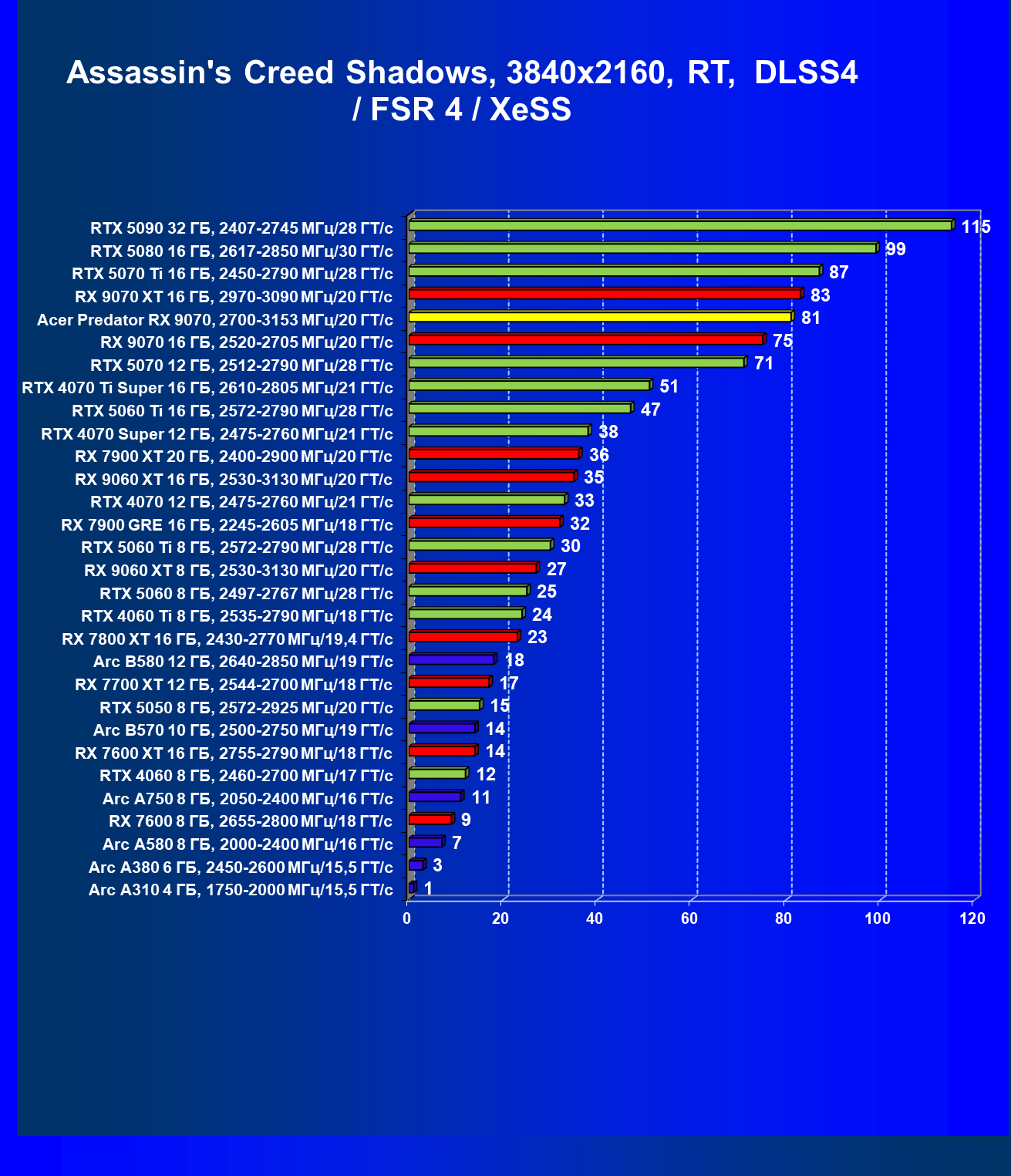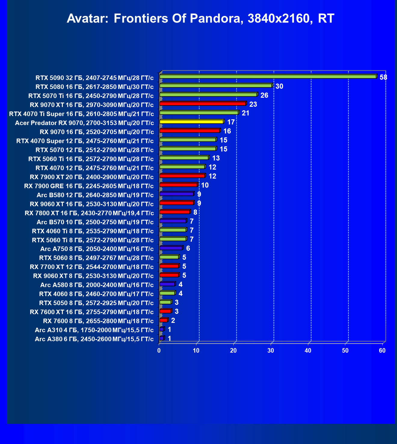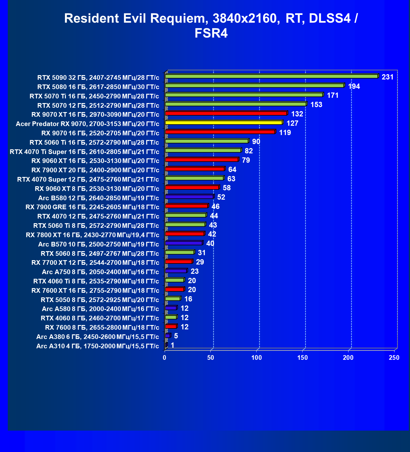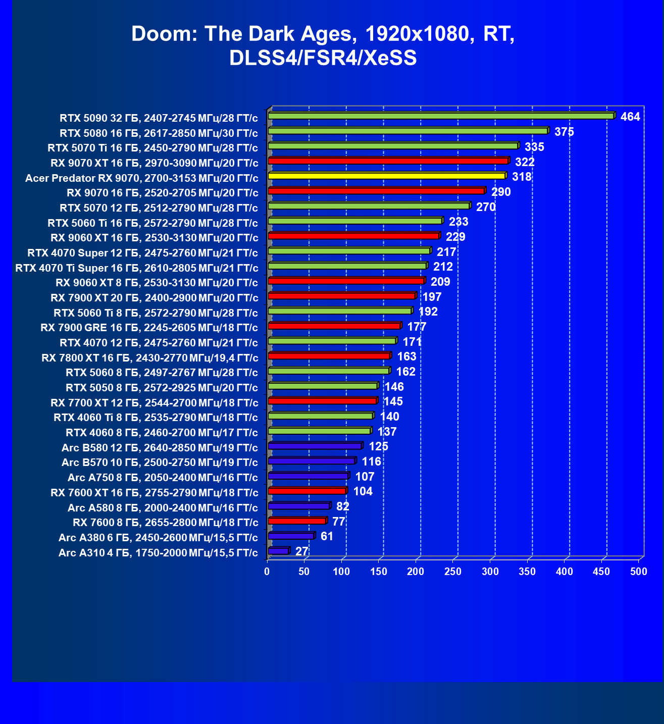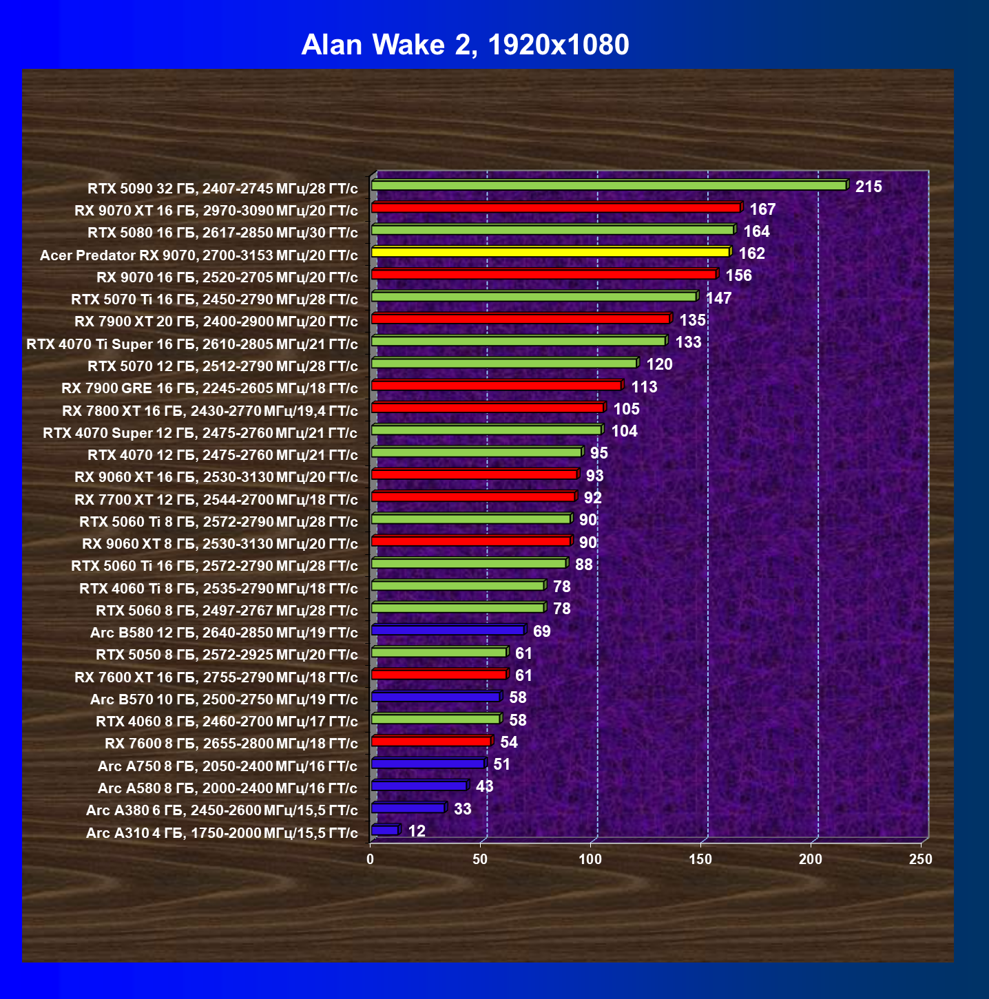| 05 | Acer Predator RX 9070, 2700—3153 МГц/20 ГТ/с | 2504 | 358 | 70 000 |