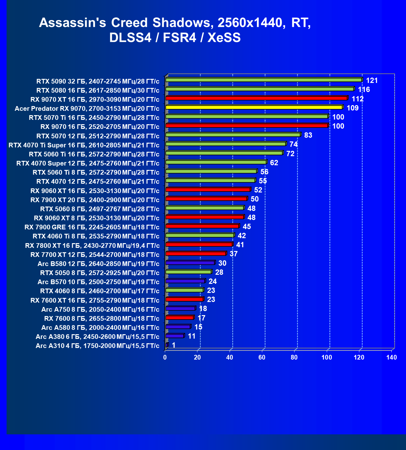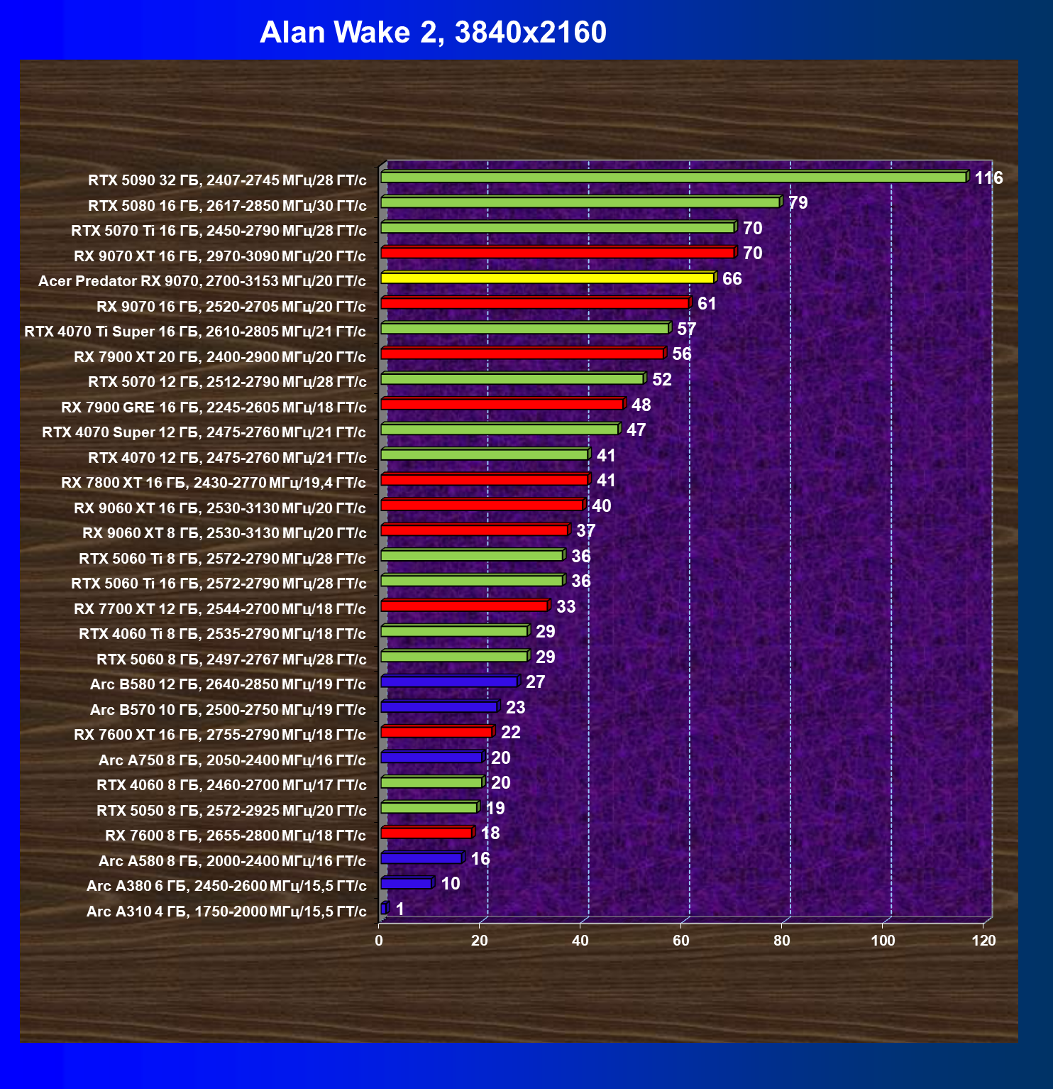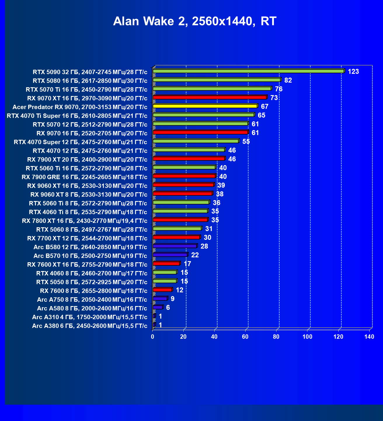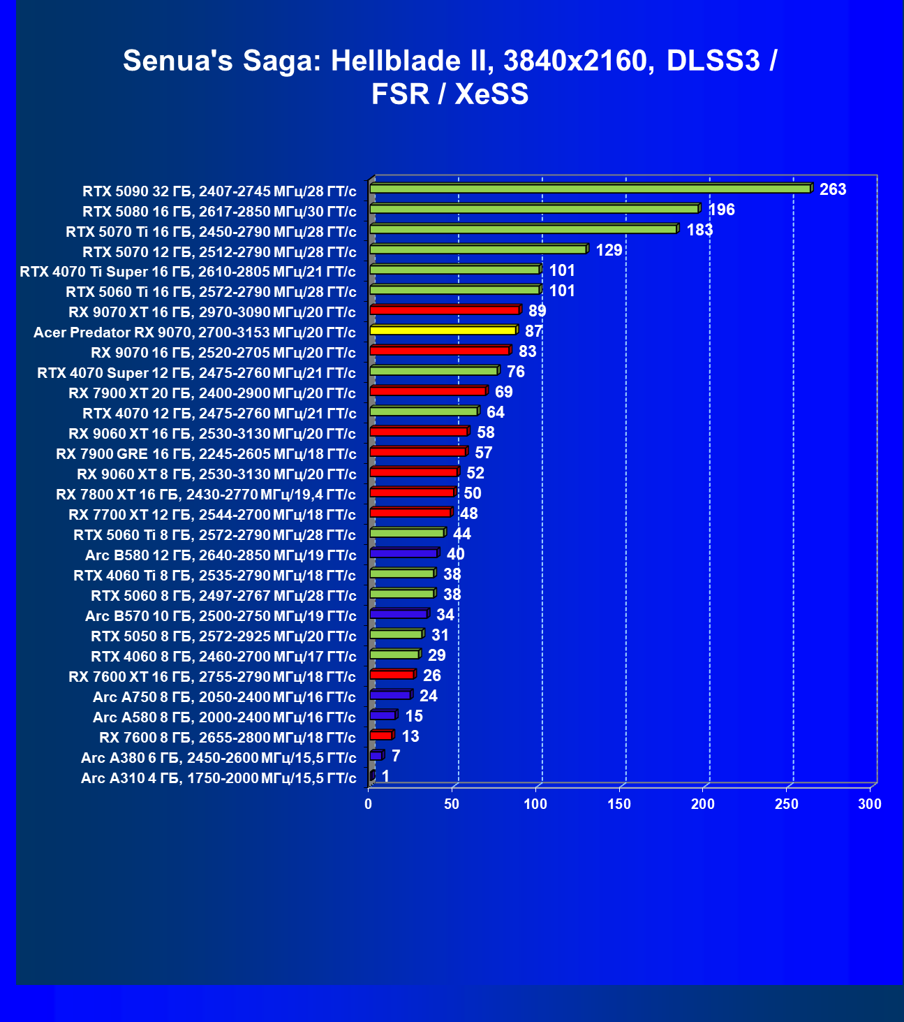 | 05 | Acer Predator RX 9070, 2700—3153 МГц/20 ГТ/с | 2504 | 358 | 70 000 |
