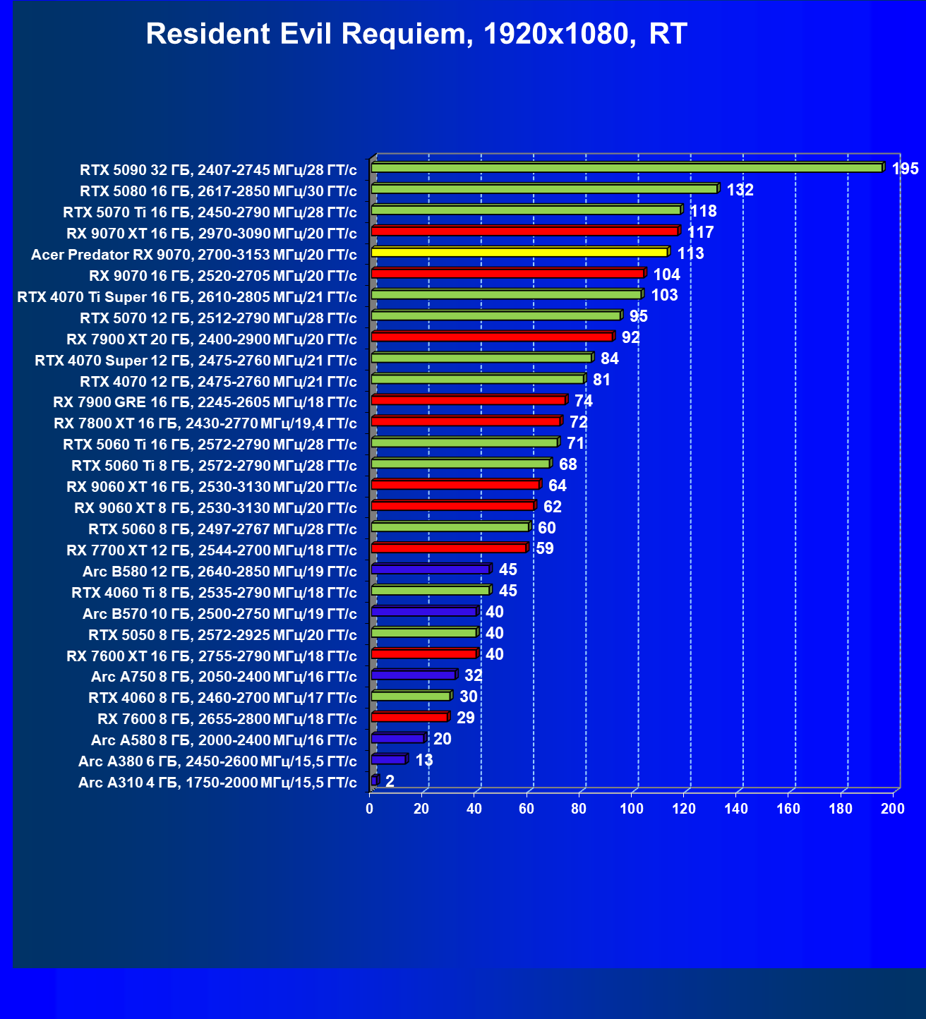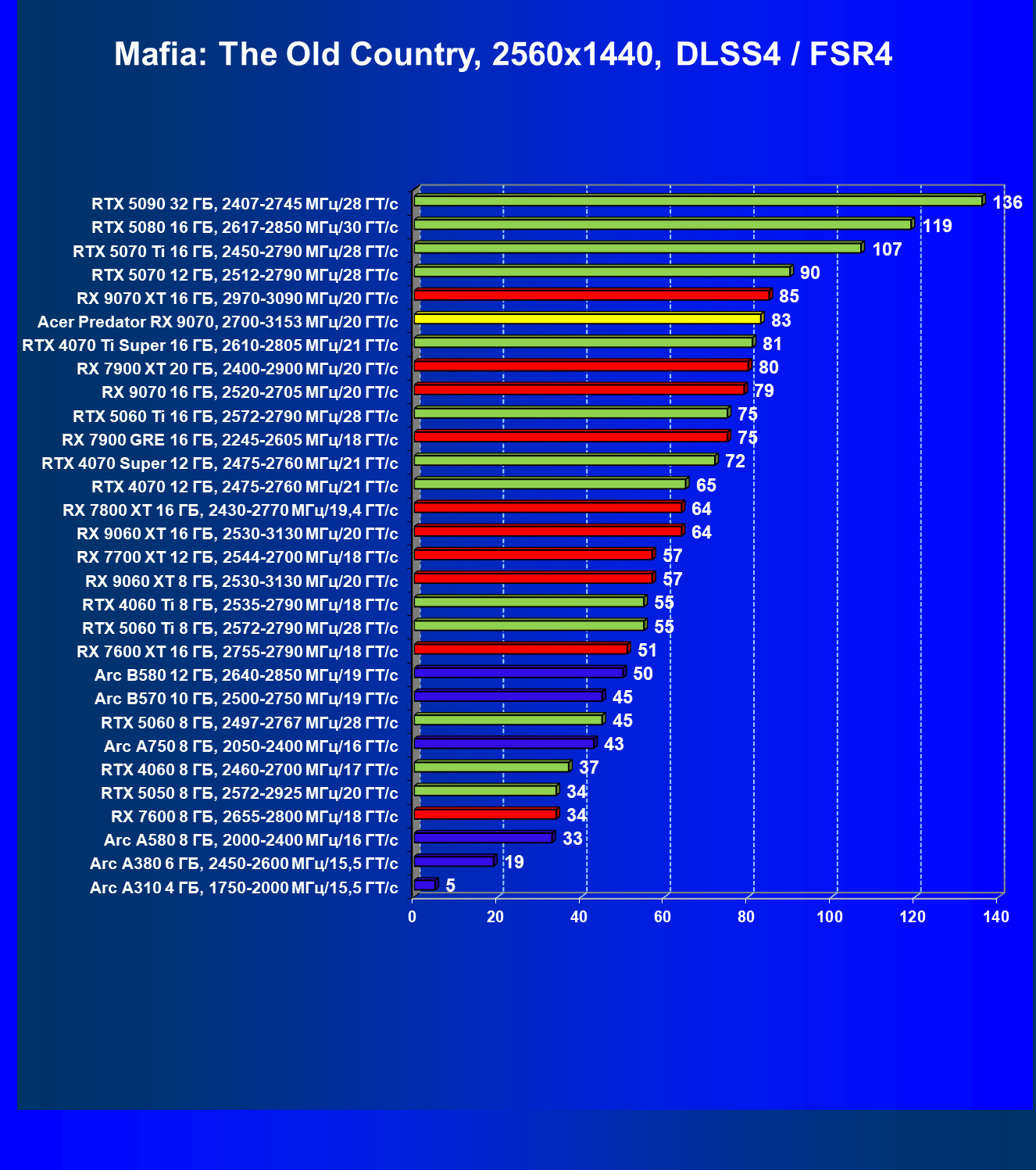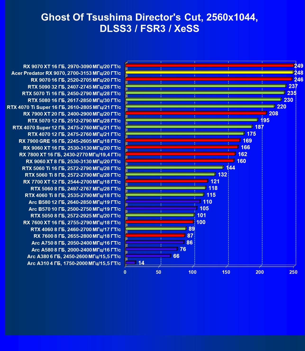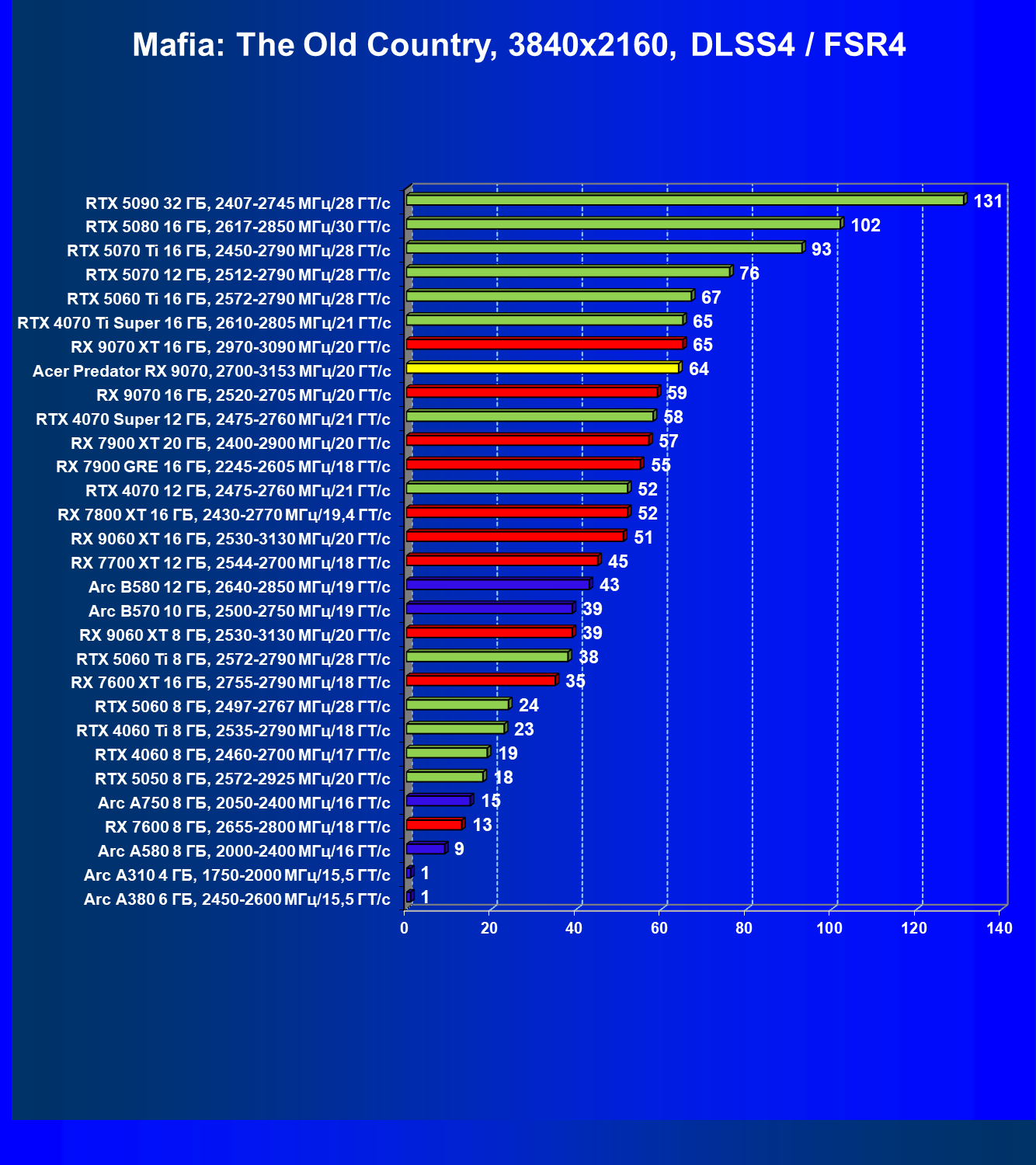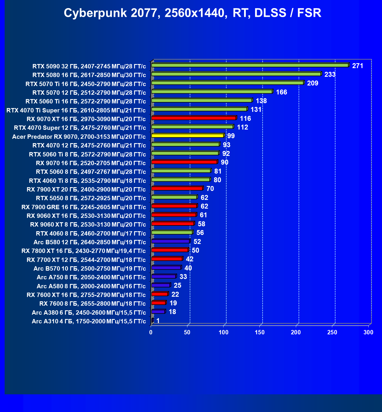 | 05 | Acer Predator RX 9070, 2700—3153 МГц/20 ГТ/с | 2504 | 358 | 70 000 |