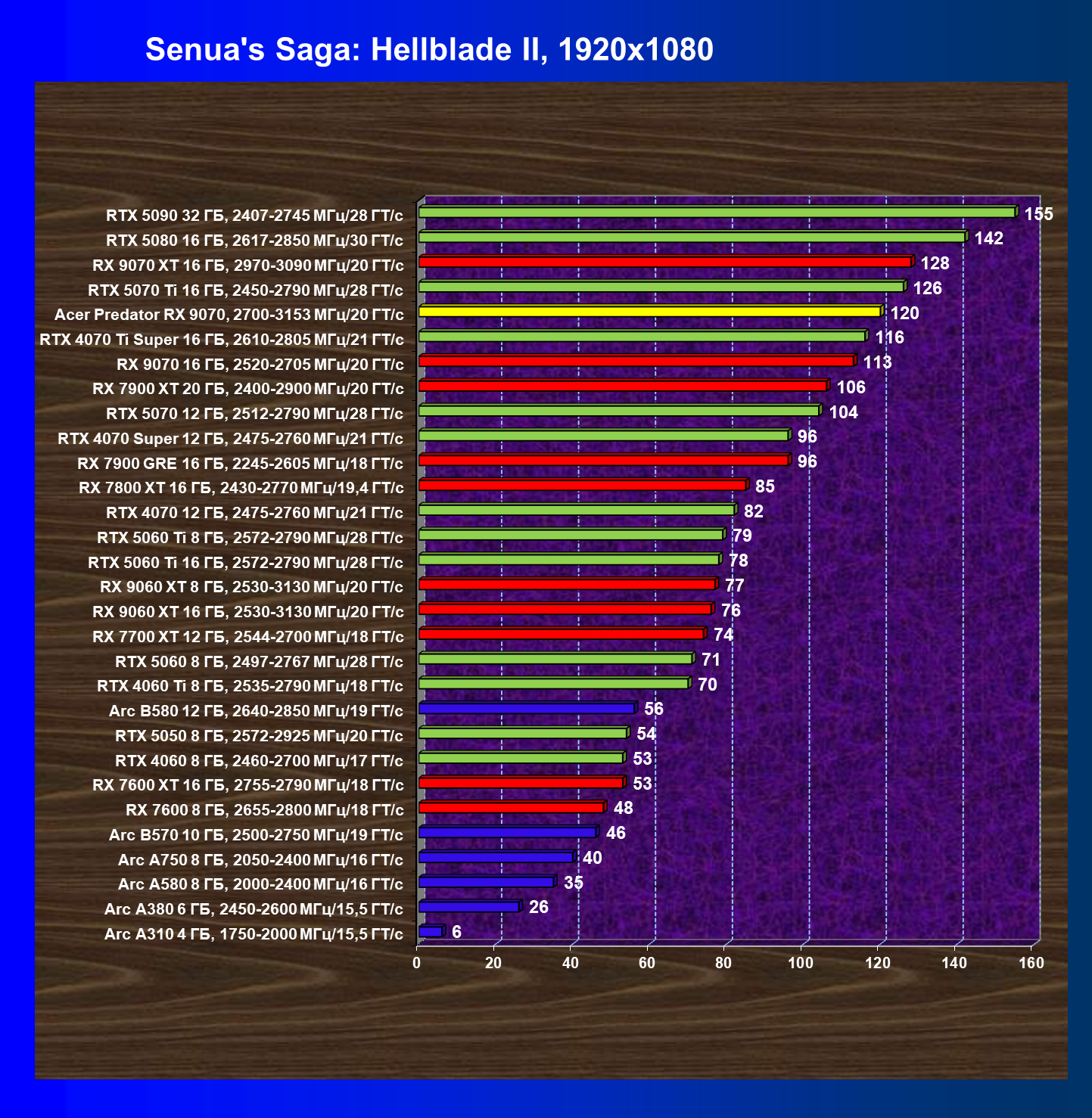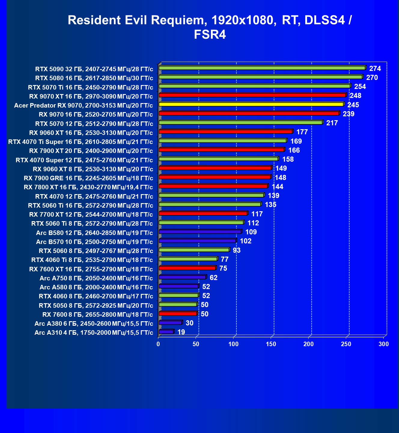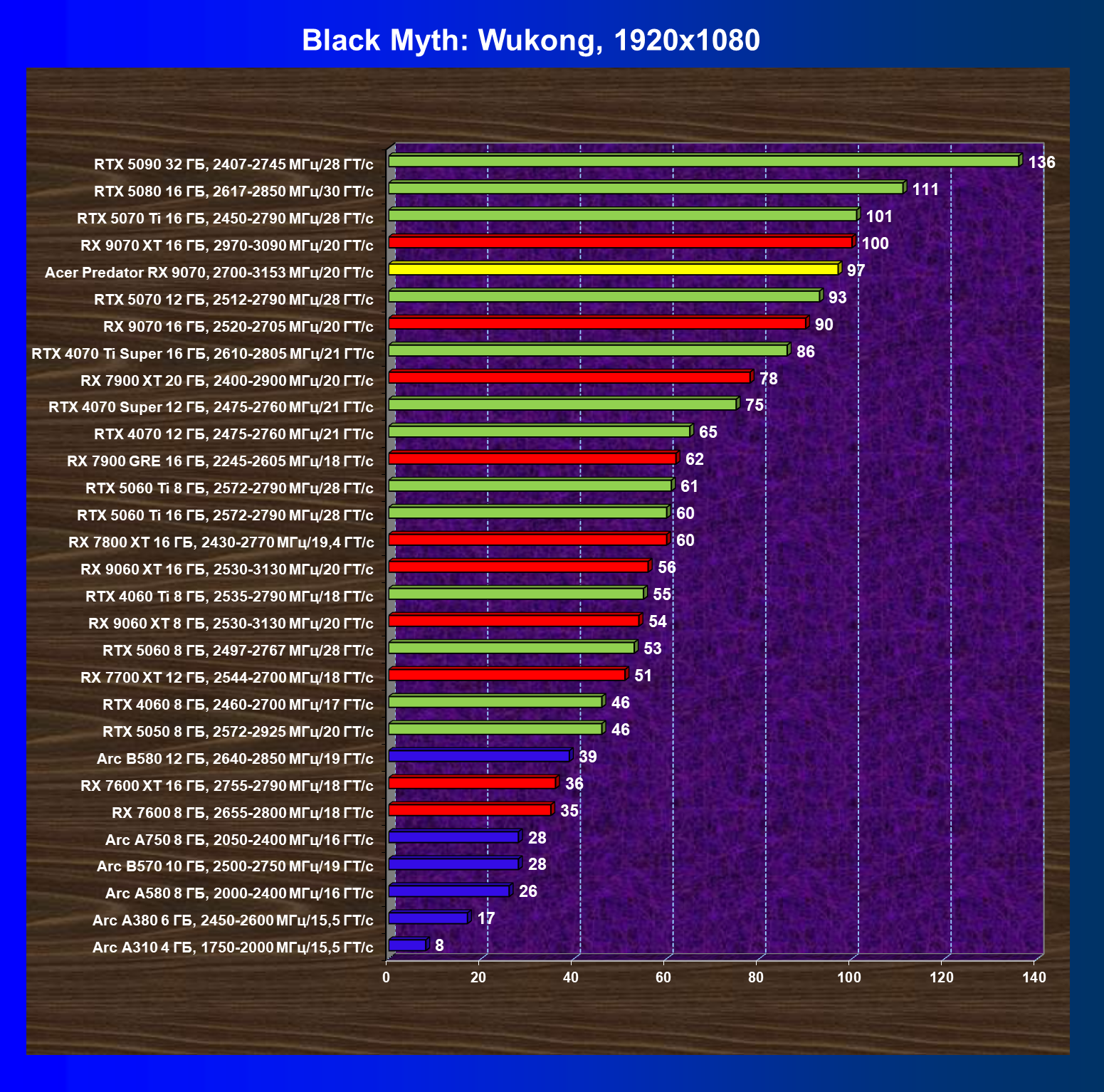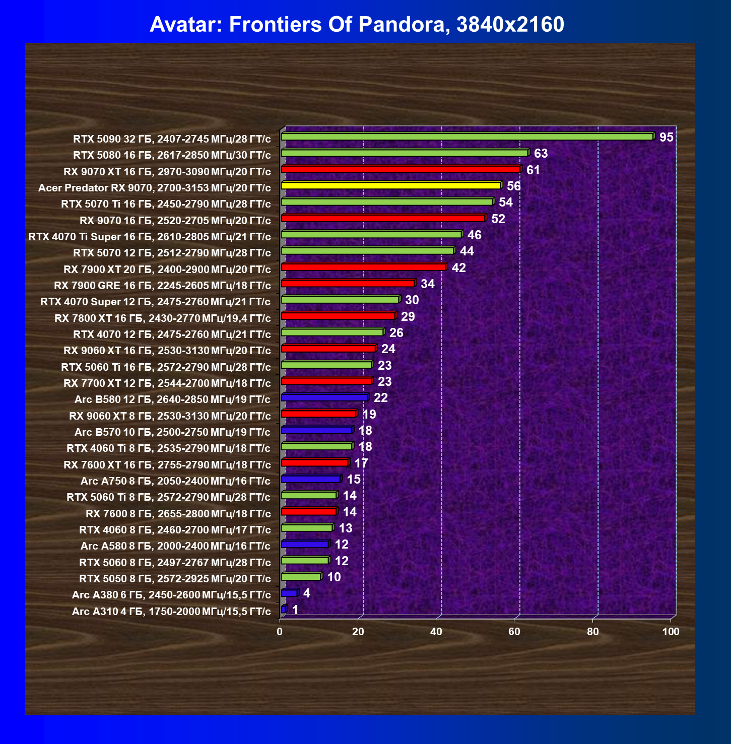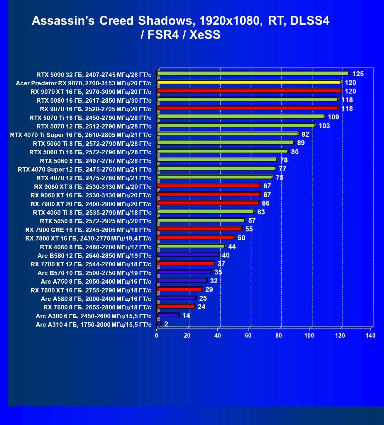 | 05 | Acer Predator RX 9070, 2700—3153 МГц/20 ГТ/с | 2504 | 358 | 70 000 |