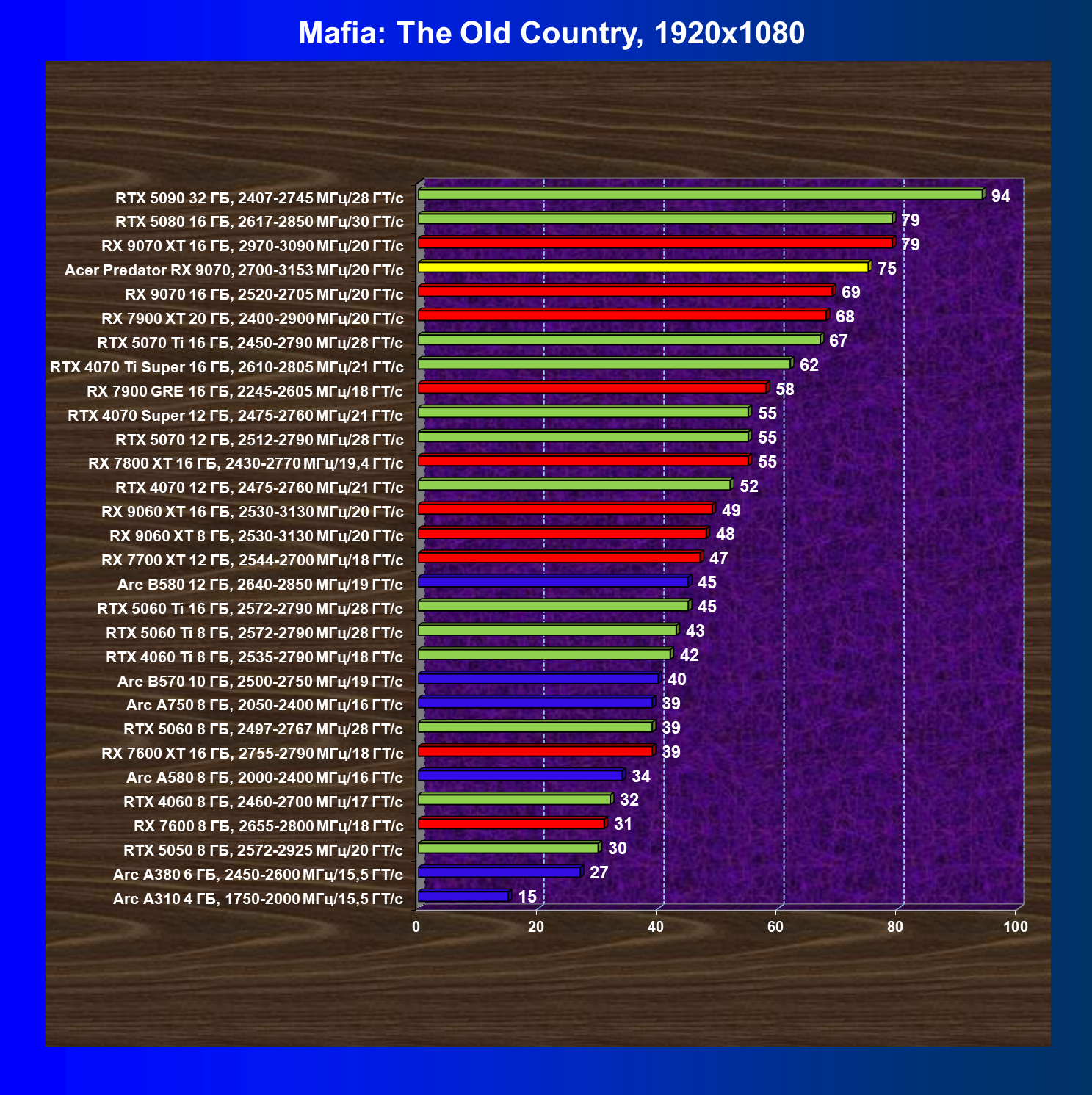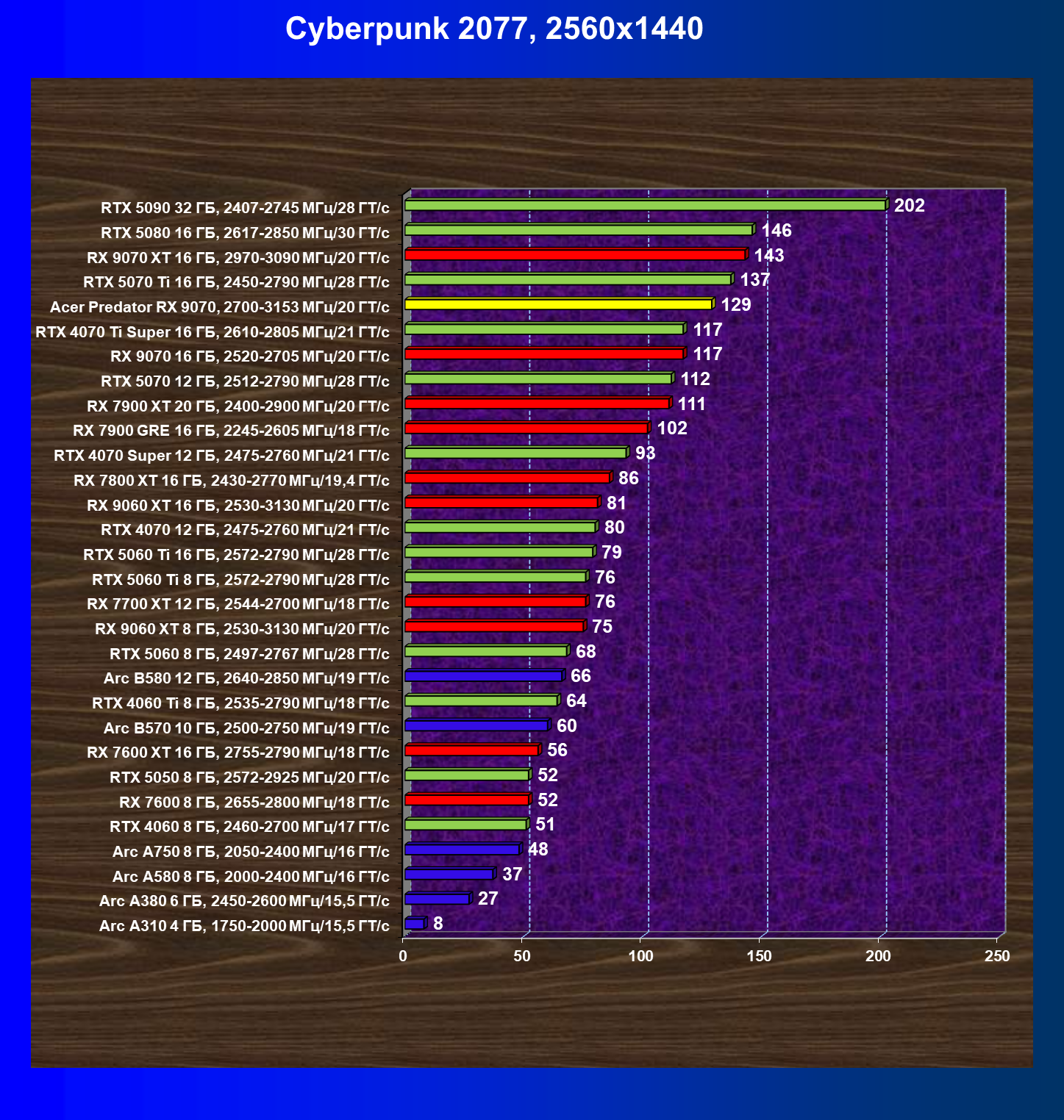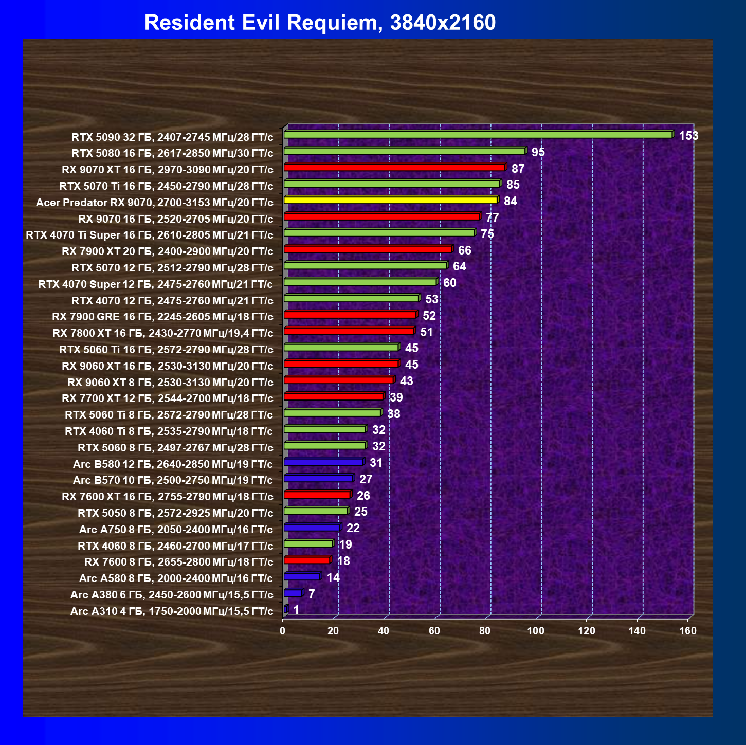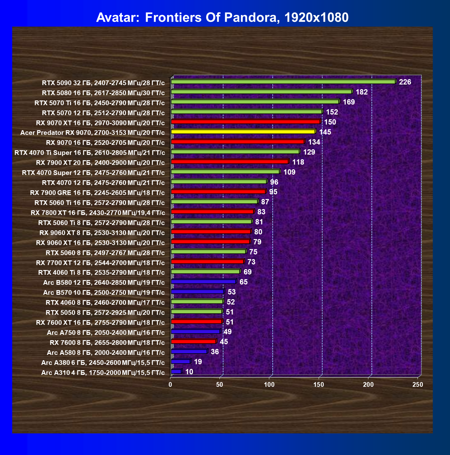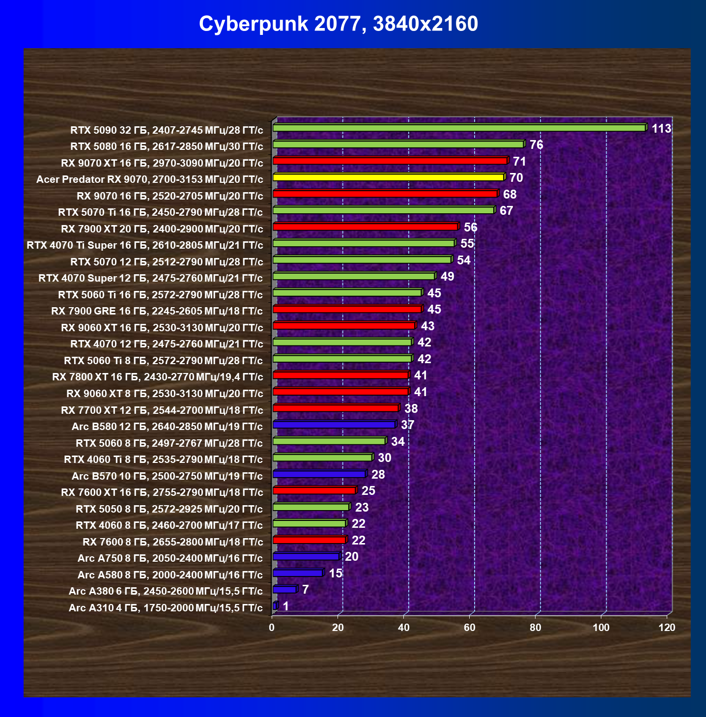 | 05 | Acer Predator RX 9070, 2700—3153 МГц/20 ГТ/с | 2504 | 358 | 70 000 |