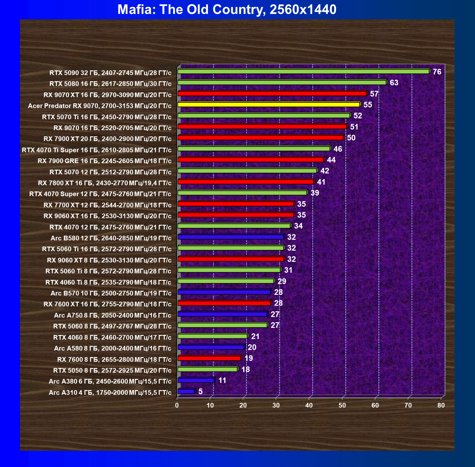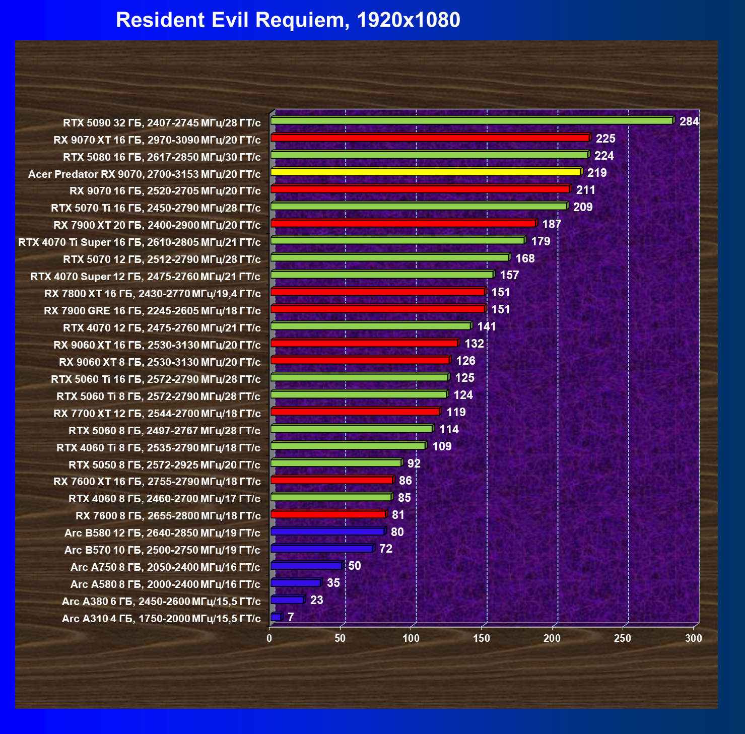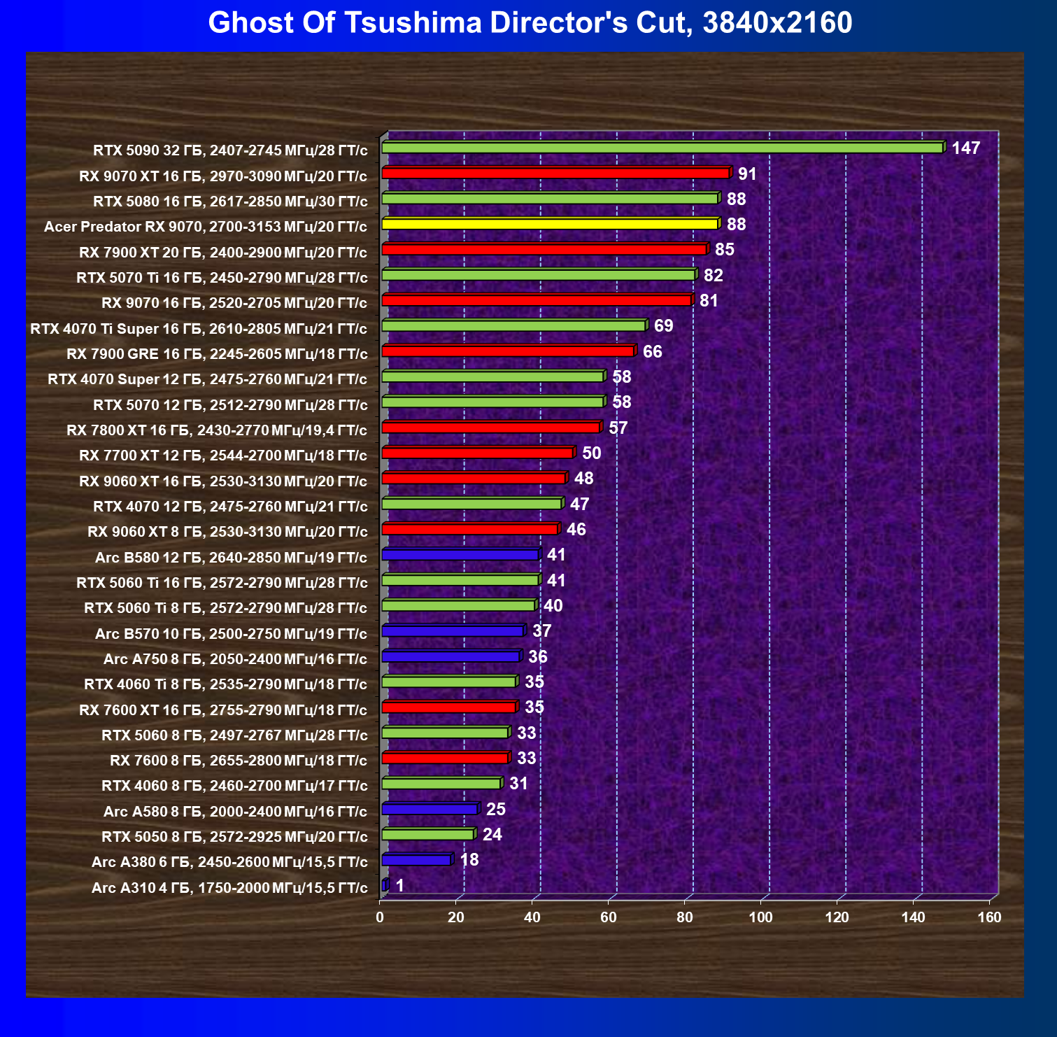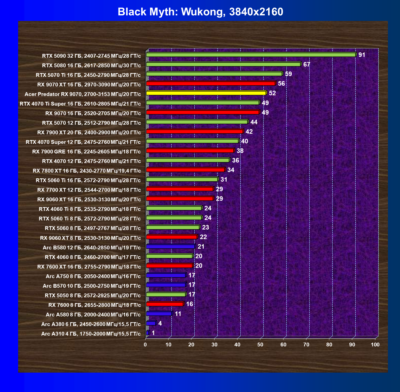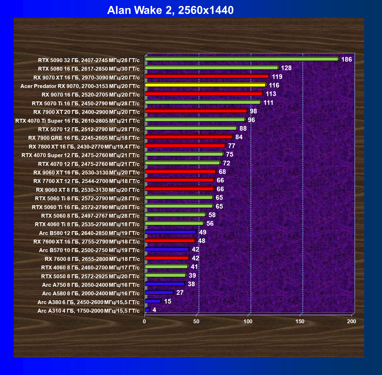 | 05 | Acer Predator RX 9070, 2700—3153 МГц/20 ГТ/с | 2504 | 358 | 70 000 |