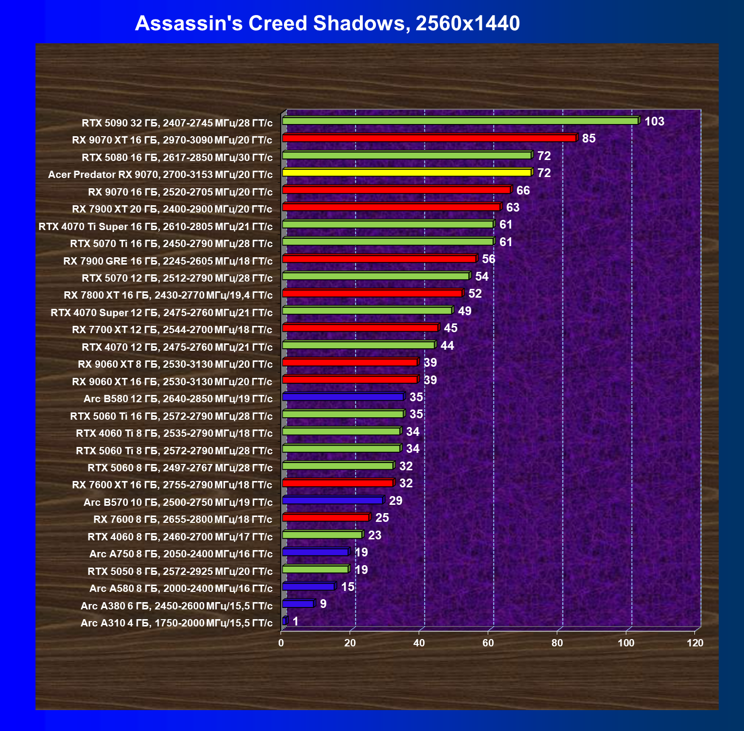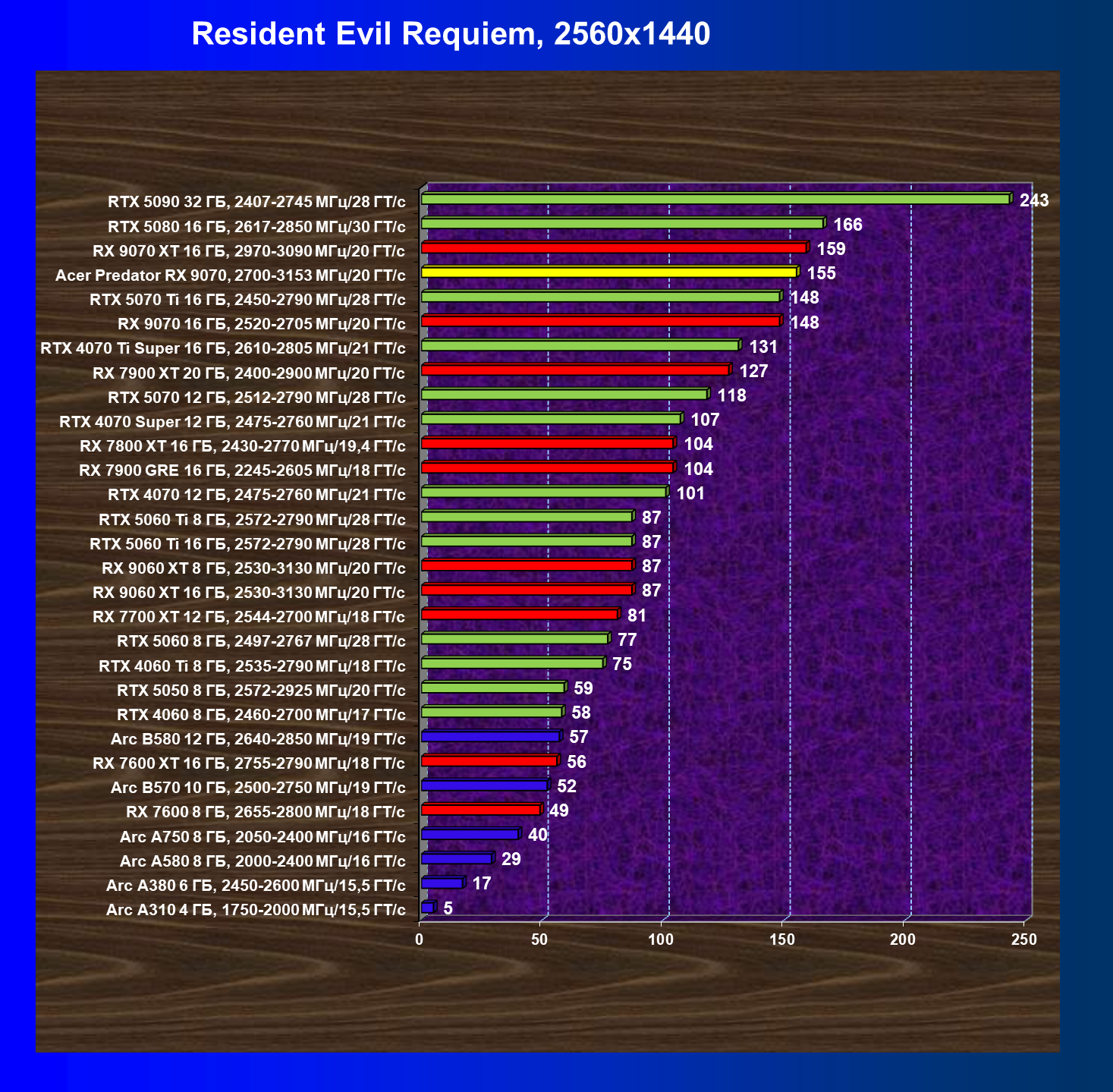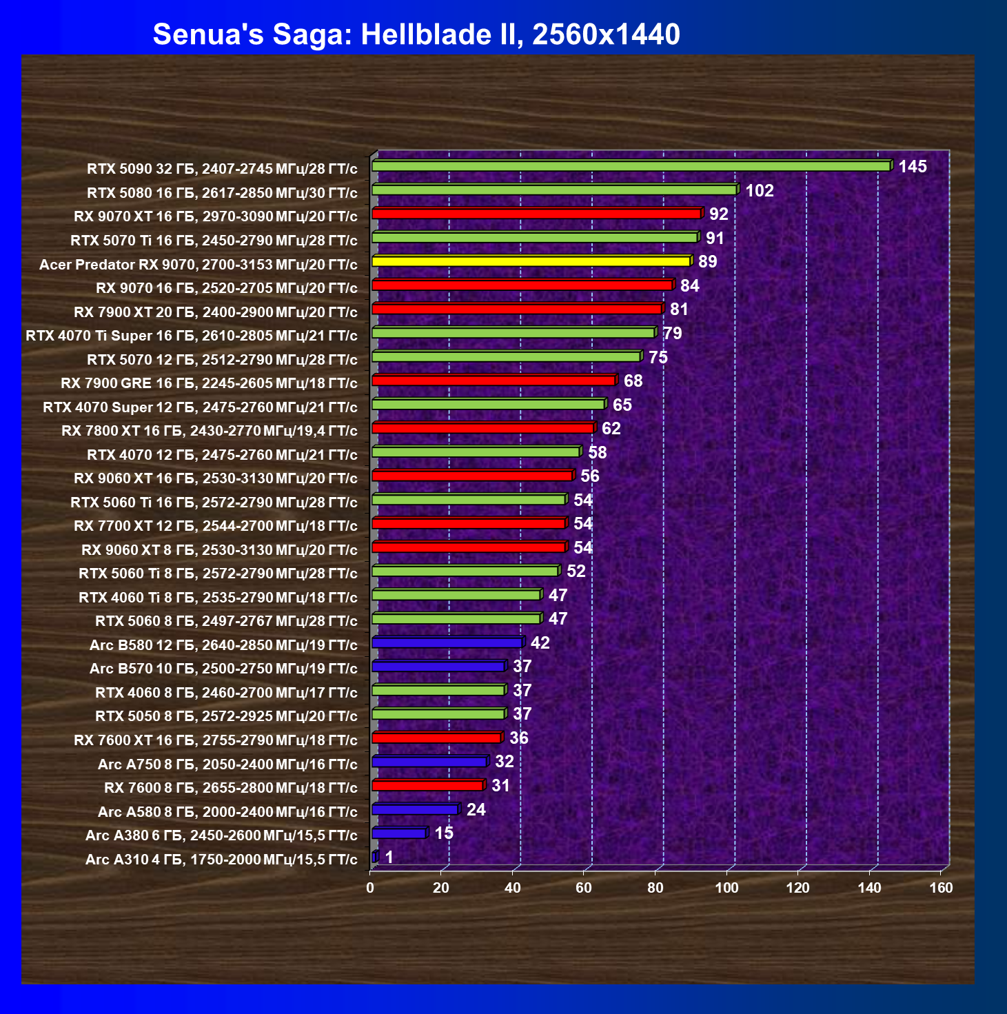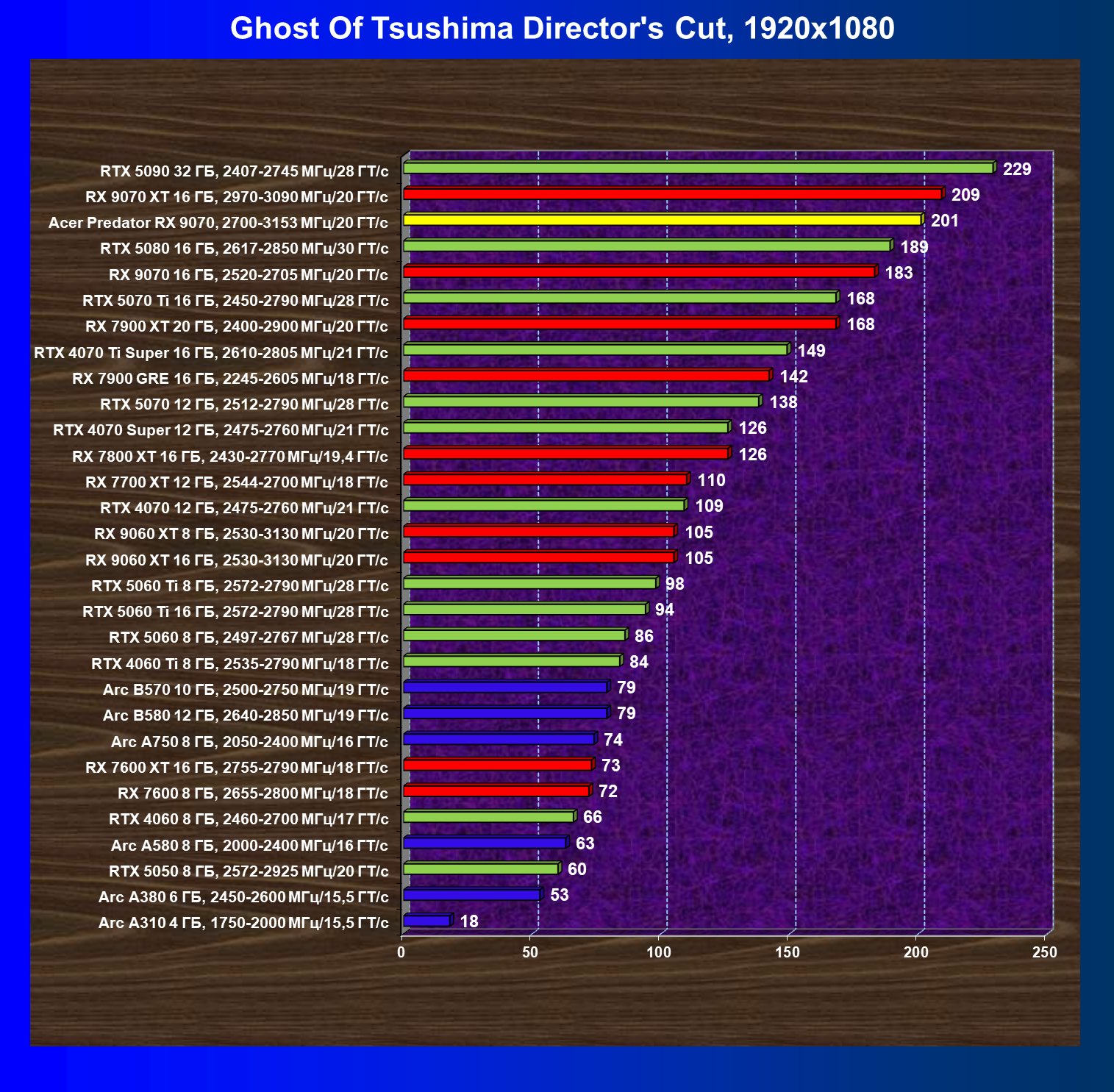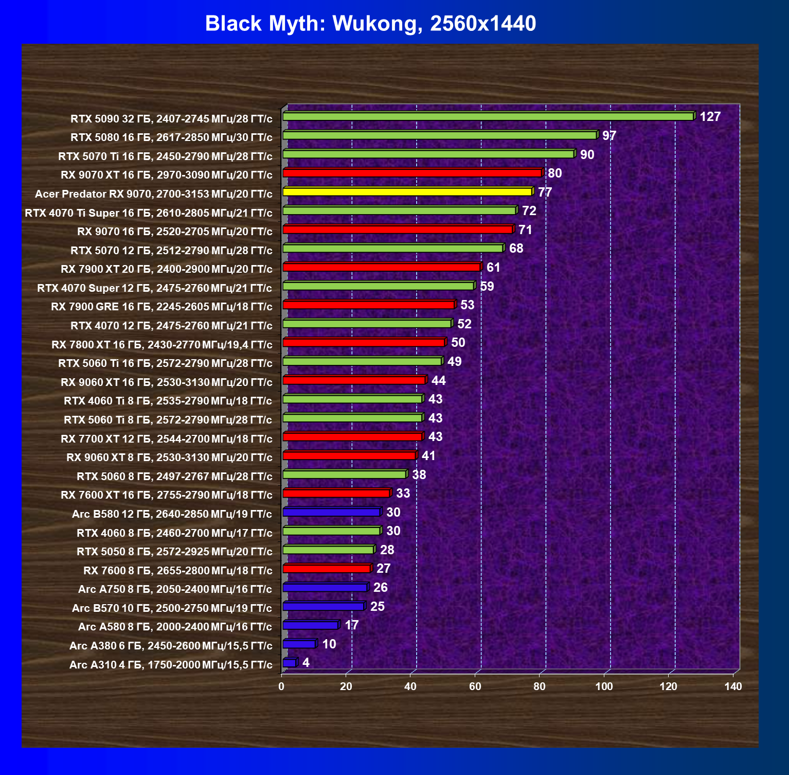 | 05 | Acer Predator RX 9070, 2700—3153 МГц/20 ГТ/с | 2504 | 358 | 70 000 |