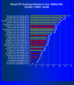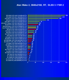 Рейтинг составлен по 10 тестам, в которых используется технология трассировки лучей и одновременно технология Nvidia DLSS, AMD FSR или Intel XeSS. Этот рейтинг нормирован по самому слабому ускорителю в данной группе — Arc A310 (то есть сочетание скорости и функций Arc A310 приняты за 100%).