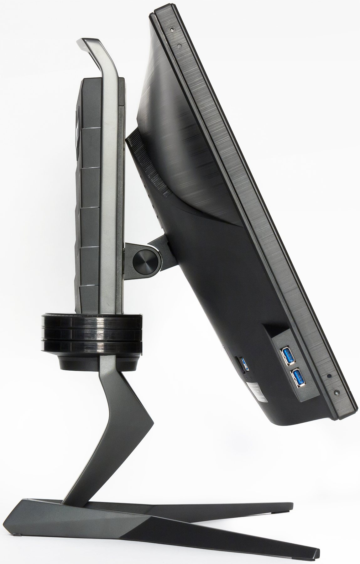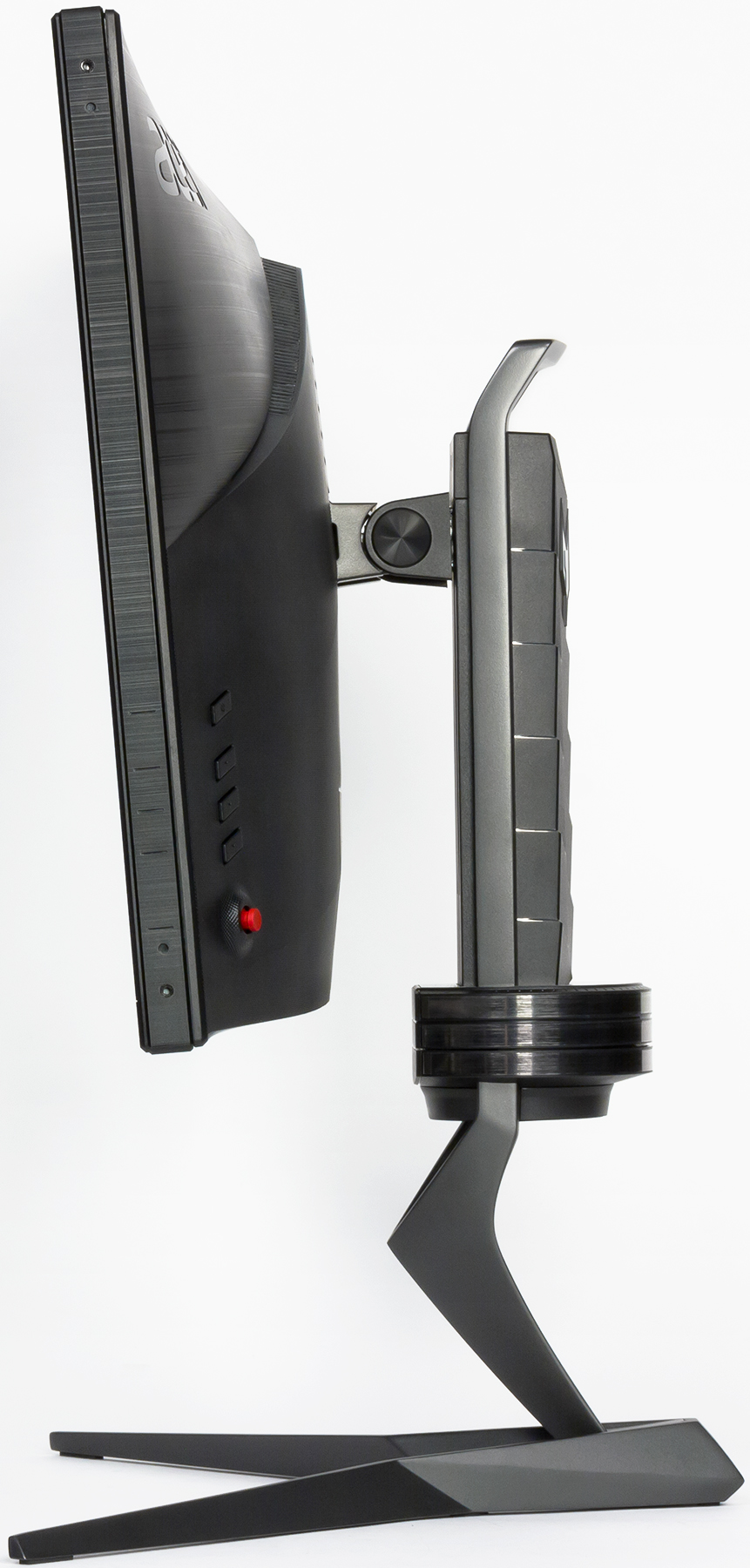 Нижняя опорная часть подставки, нижняя и верхняя П-образная части стойки изготовлены из алюминиевого сплава и имеют стойкое матовое черное покрытие. Центральная часть стойки закрыта кожухом из черного пластика с матовой поверхностью. На нем есть логотип из пластика с серебристым покрытием, прикрытый прозрачным пластиком. Лучи подставки расходятся широко в стороны, что обеспечивает монитору хорошую устойчивость, при этом рабочая площадь стола под монитором уменьшается несущественно. Резиновые накладки снизу на опорных плоскостях основания подставки защищают поверхность стола от царапин и предотвращают скольжение монитора на гладких поверхностях. Сверху на стойке есть скоба, за которую можно ухватиться во время переноски или перестановки монитора. Под скобой можно закрепить крюк для наушников.