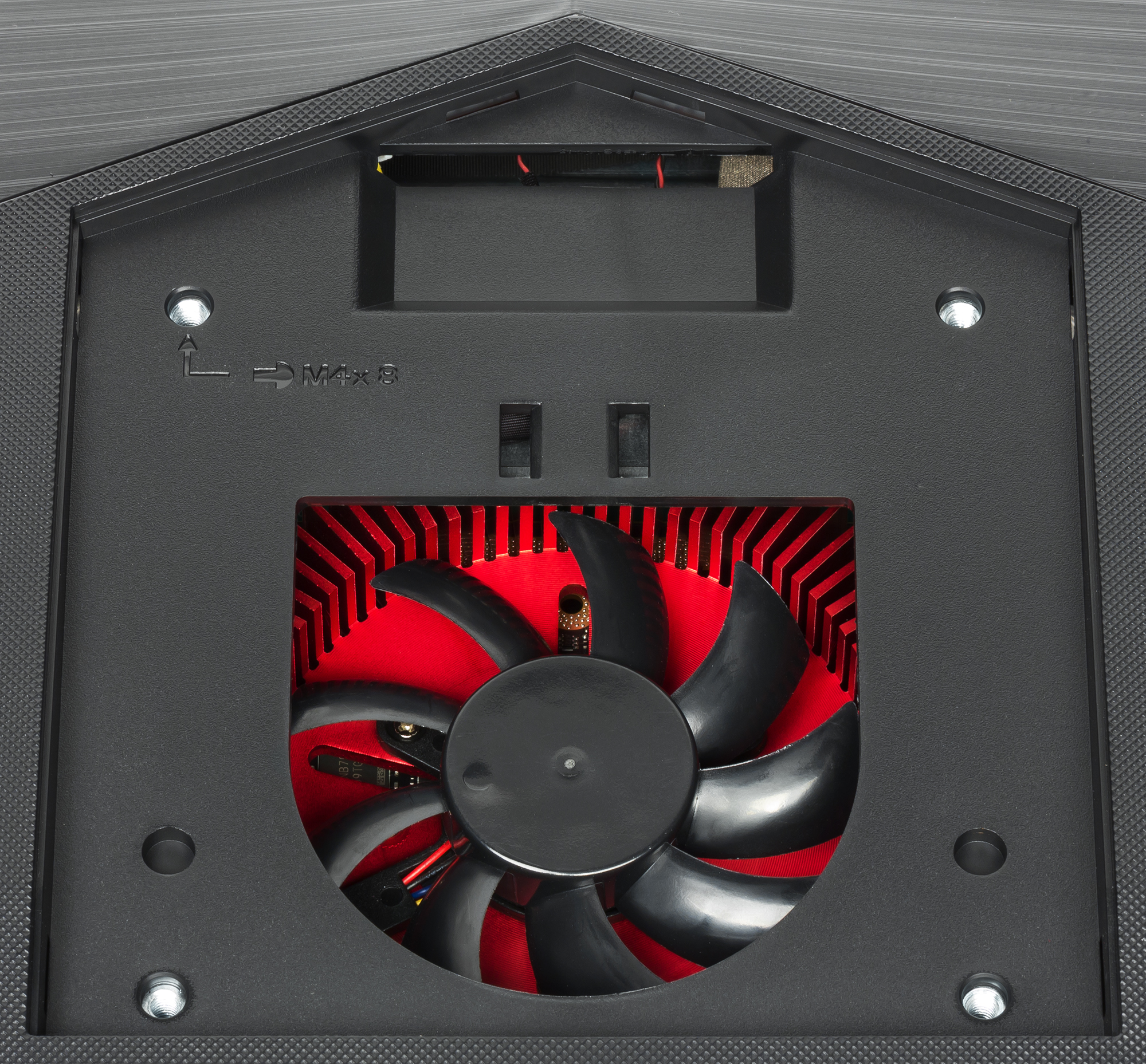 Под крепежной пластиной подставки спрятан еще один вентилятор, установленный на красном радиаторе.