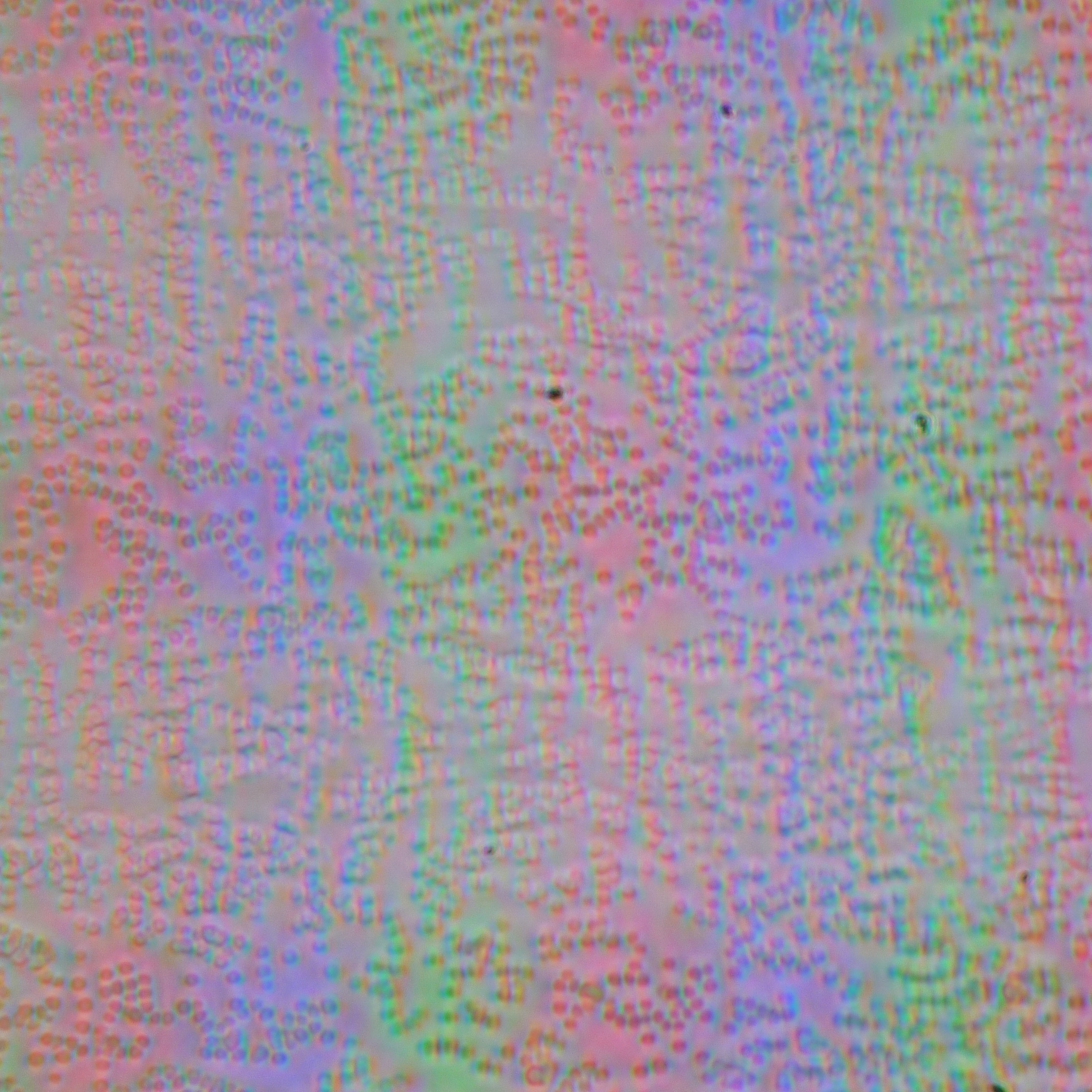 Зерно этих дефектов в несколько раз меньше размеров субпикселей (масштаб этих двух фотографий одинаковый), поэтому фокусировка на микродефектах и «перескок» фокуса по субпикселям при изменении угла зрения выражены слабо, из-за этого нет и «кристаллического» эффекта.