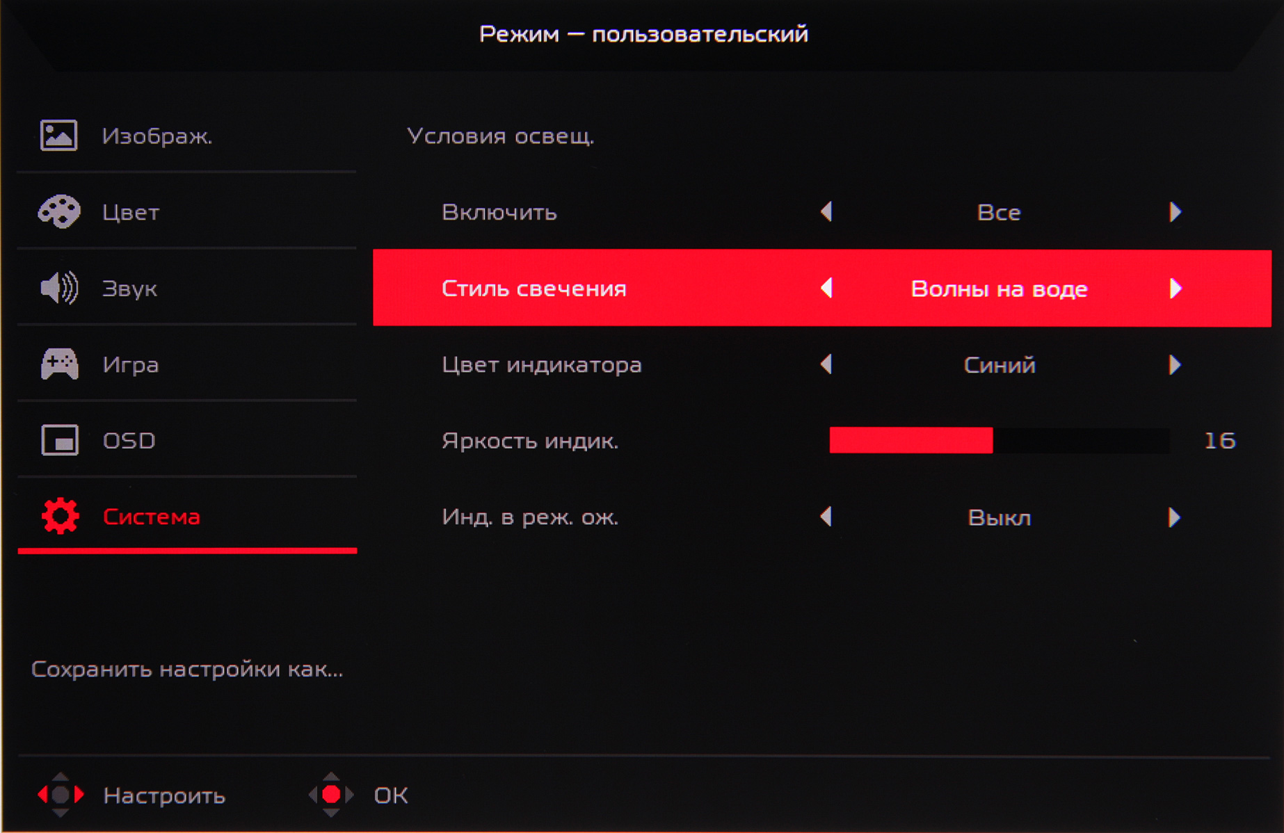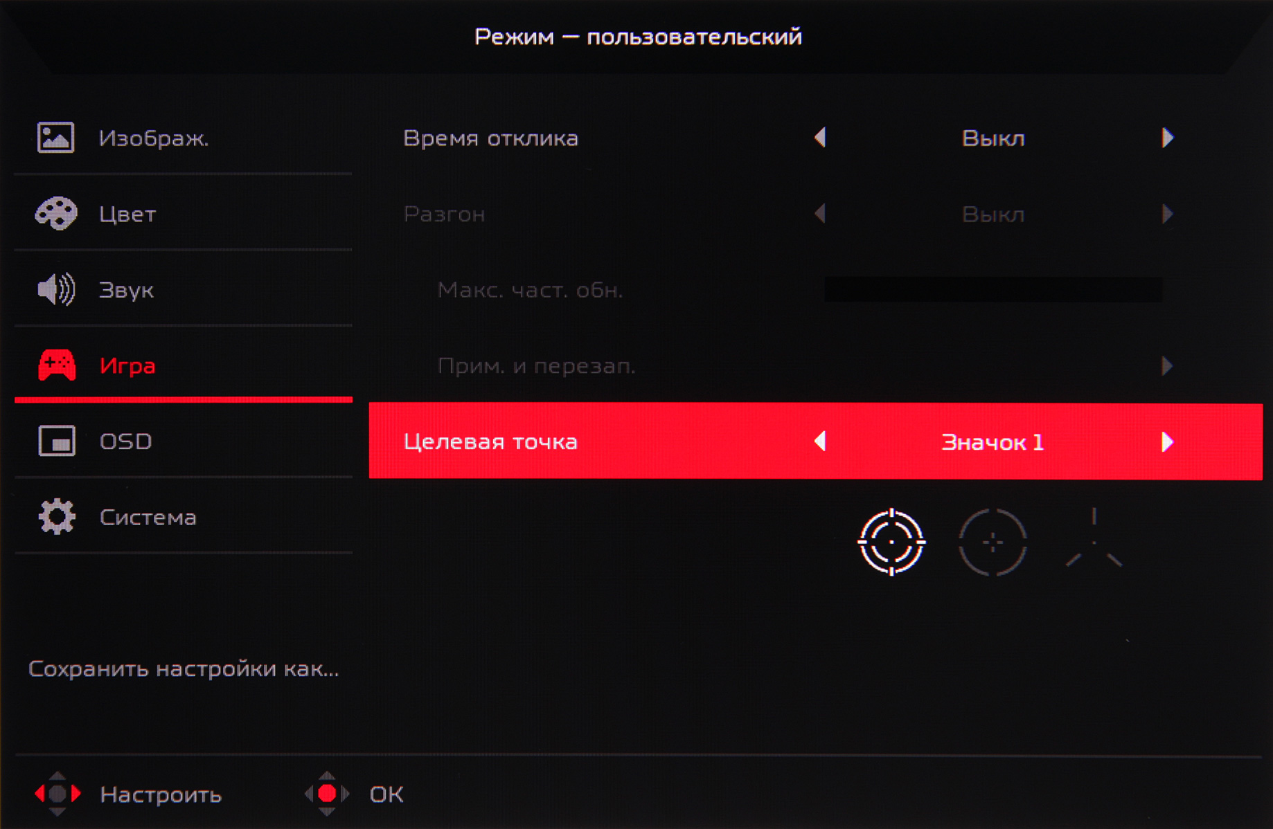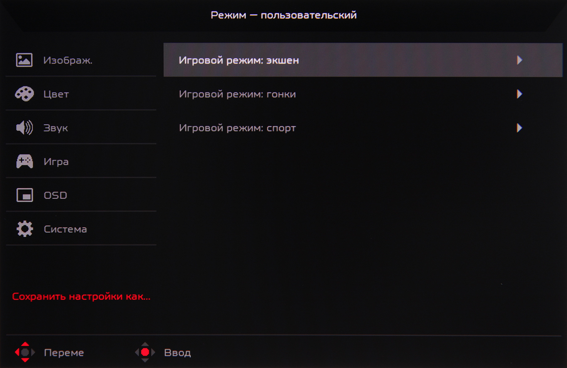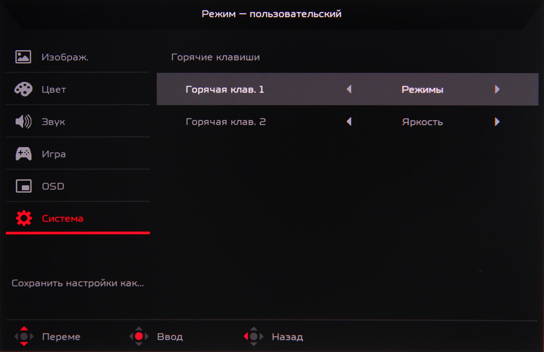 Три набора значений настроек можно сохранить в трех игровых профилях: