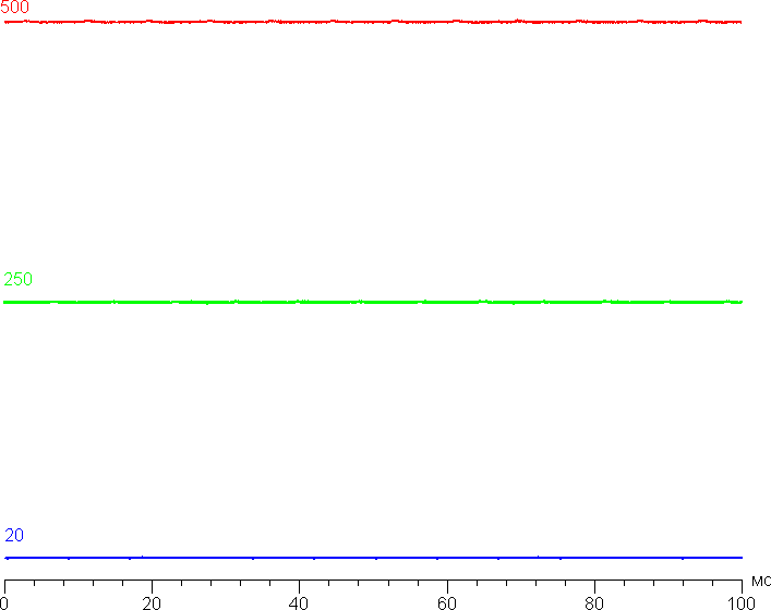 Яркость монитора меняется именно яркостью подсветки, то есть без ущерба для качества изображения (сохраняется контрастность и количество различимых градаций) яркость монитора можно менять в очень широких пределах, что позволяет с комфортом работать и смотреть фильмы как в освещенном, так и в темном помещении. На любом уровне яркости модуляция подсветки отсутствует, что исключает видимое мерцание экрана. В доказательство приведем графики зависимости яркости (вертикальная ось) от времени (горизонтальная ось) при различных значениях настройки яркости: