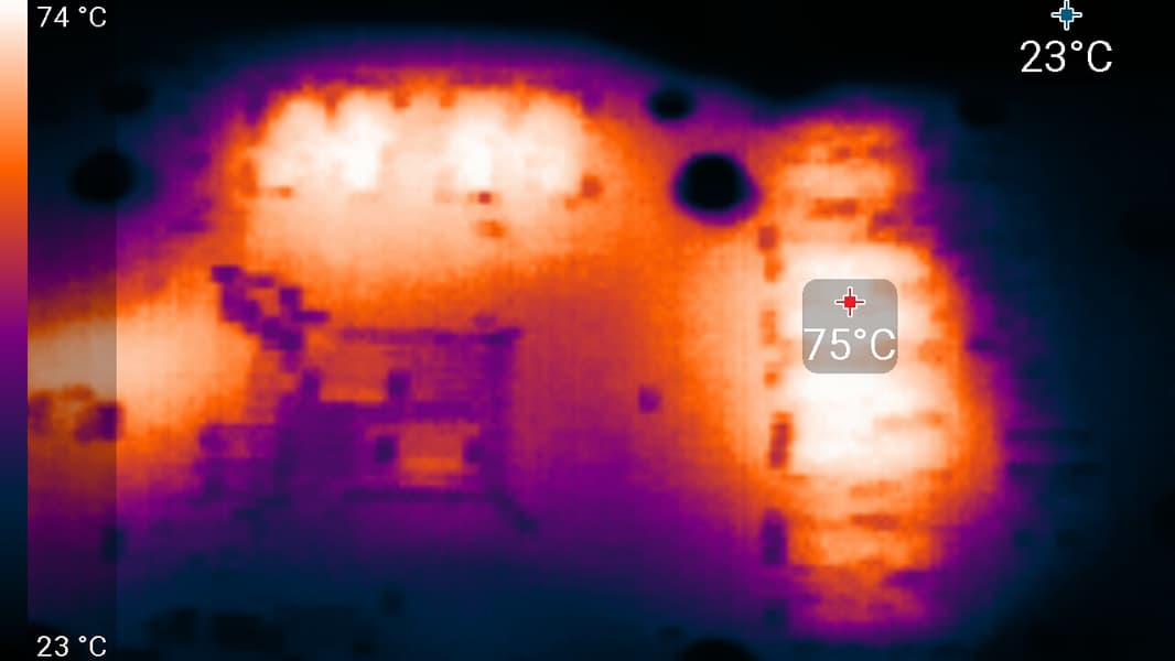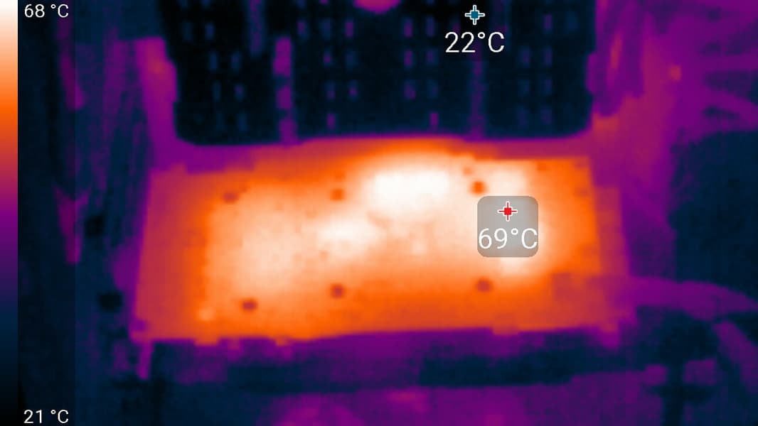 В режиме максимальной нагрузки в 3D температура достигала 63,9 °C. Вентиляторы при этом раскручивались до 1820 оборотов (57%) в минуту, шум вырастал до 32,7 дБА, это отчетливо слышно, но все еще тихо.
