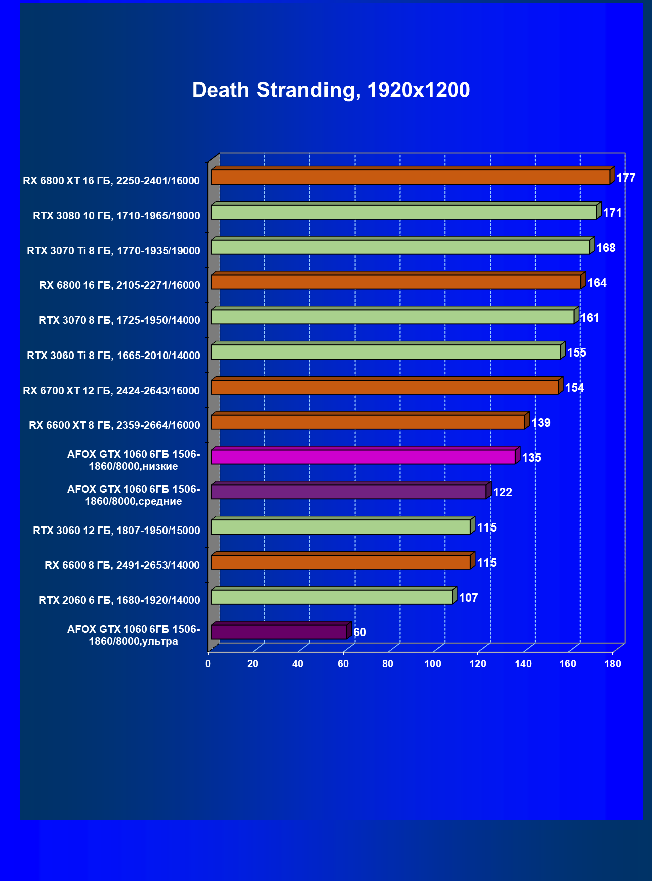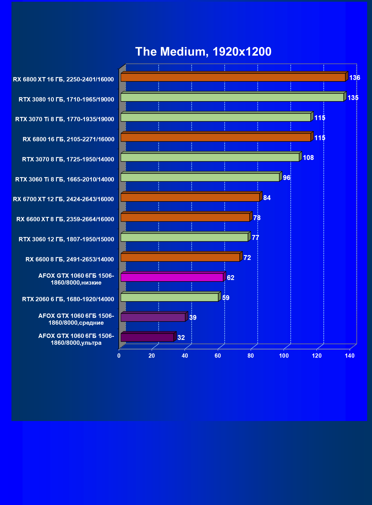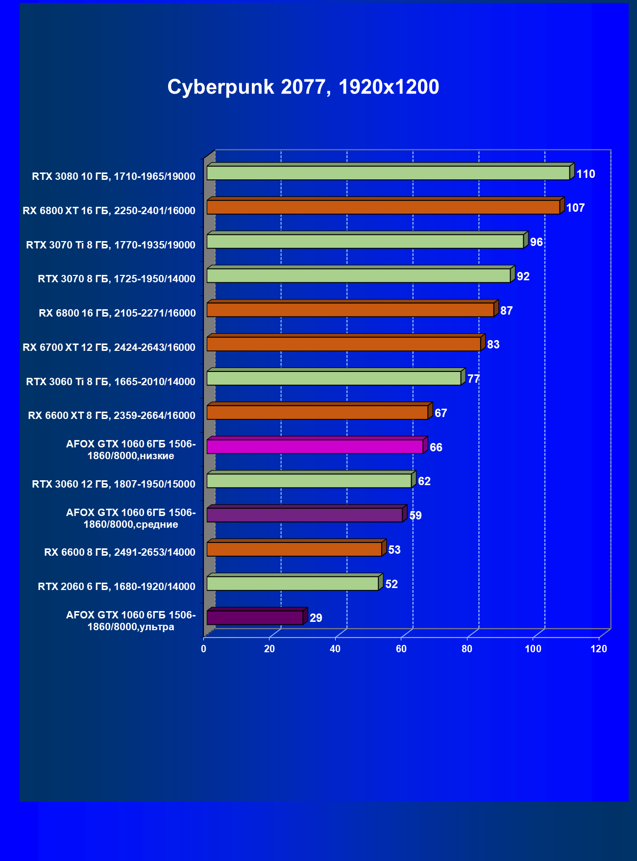 | 02 | Afox GTX 1060 6ГБ 1506—1860/8000, средние | 25 | 96 | 38 000 |