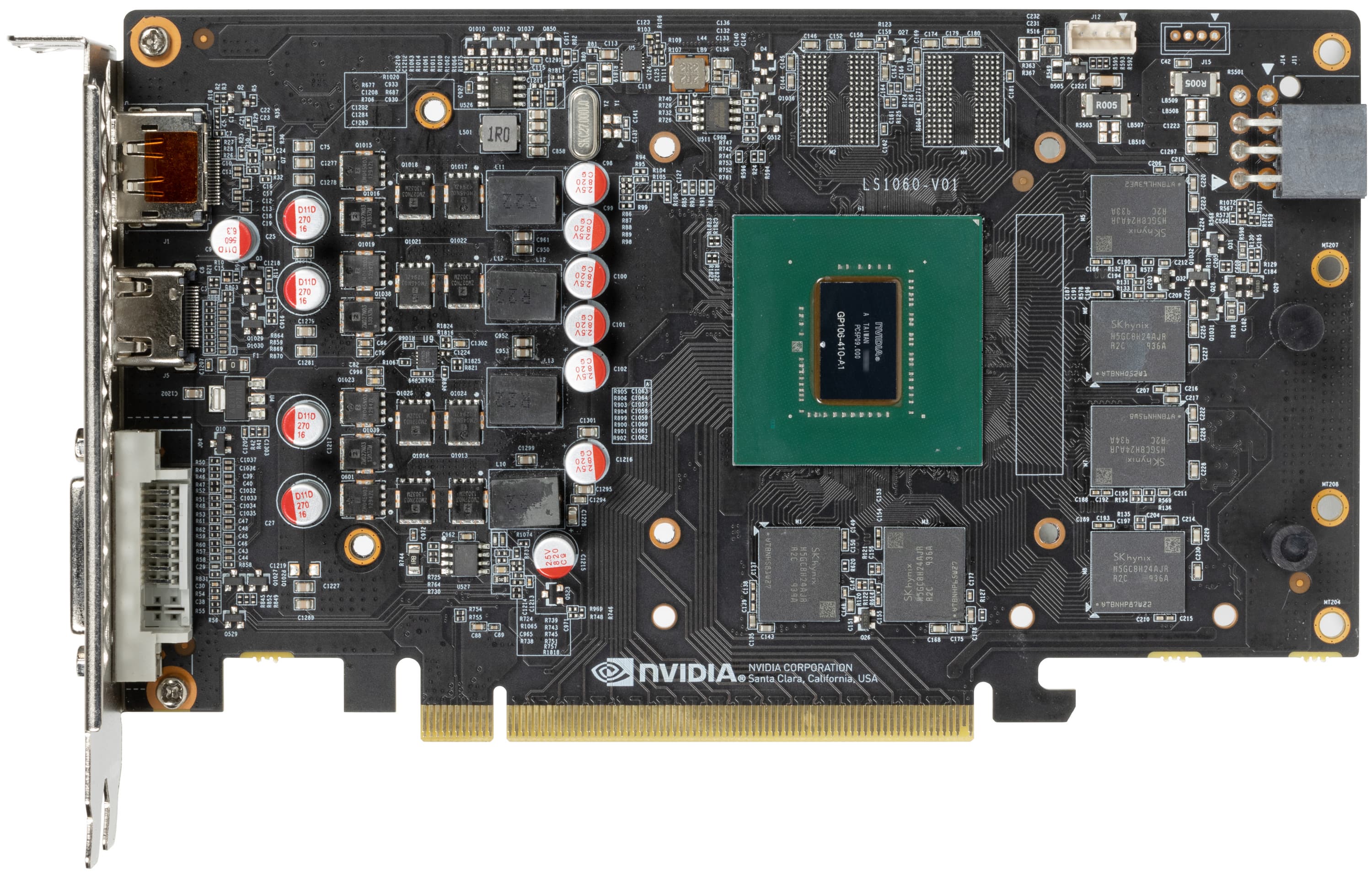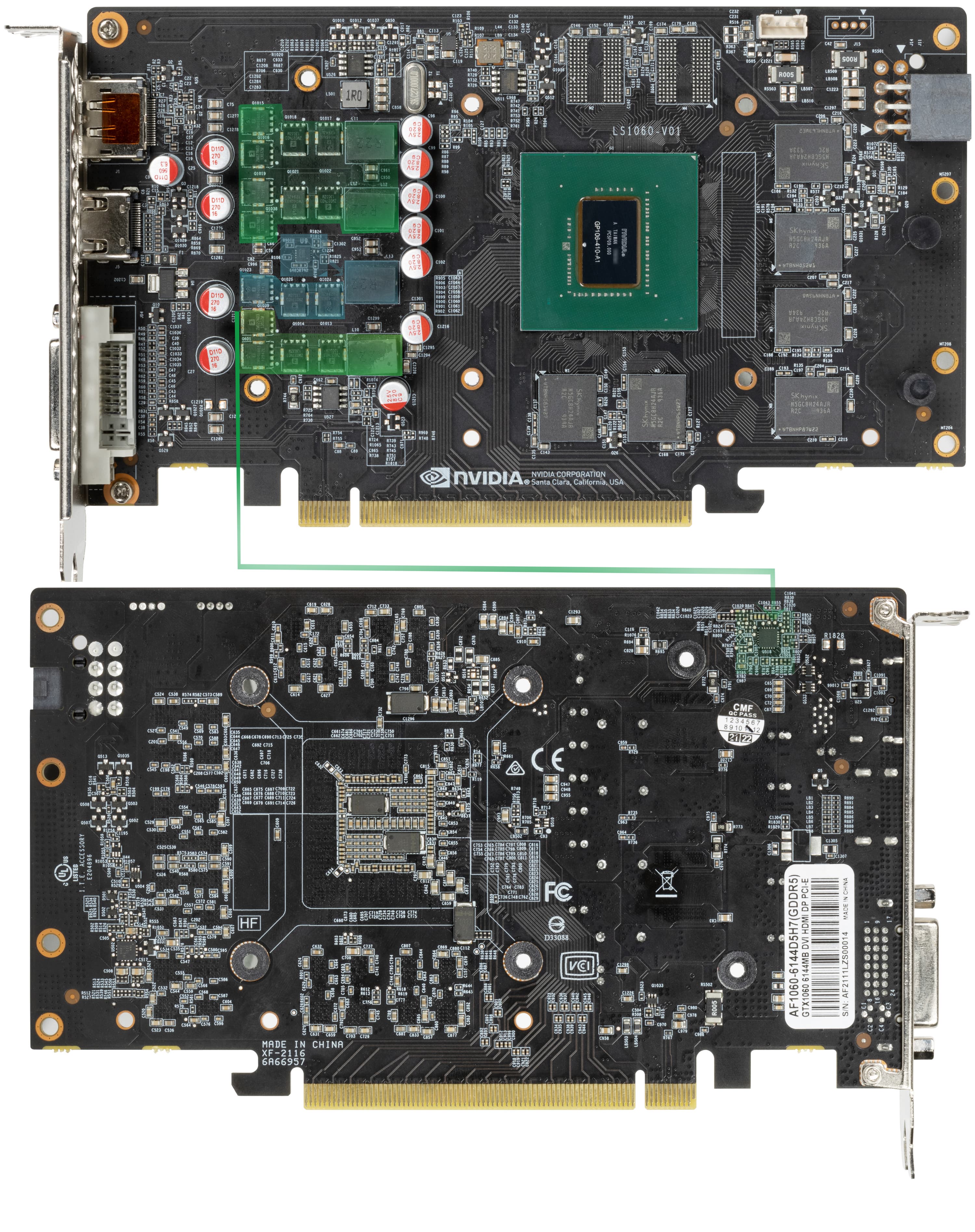 Карта имеет 6 ГБ памяти GDDR5 SDRAM, размещенной в 6 микросхемах по 8 Гбит на лицевой стороне PCB. Микросхемы памяти SKhynix (GDDR5, R2C) рассчитаны на условную номинальную частоту работы в 1750 (7000) МГц.