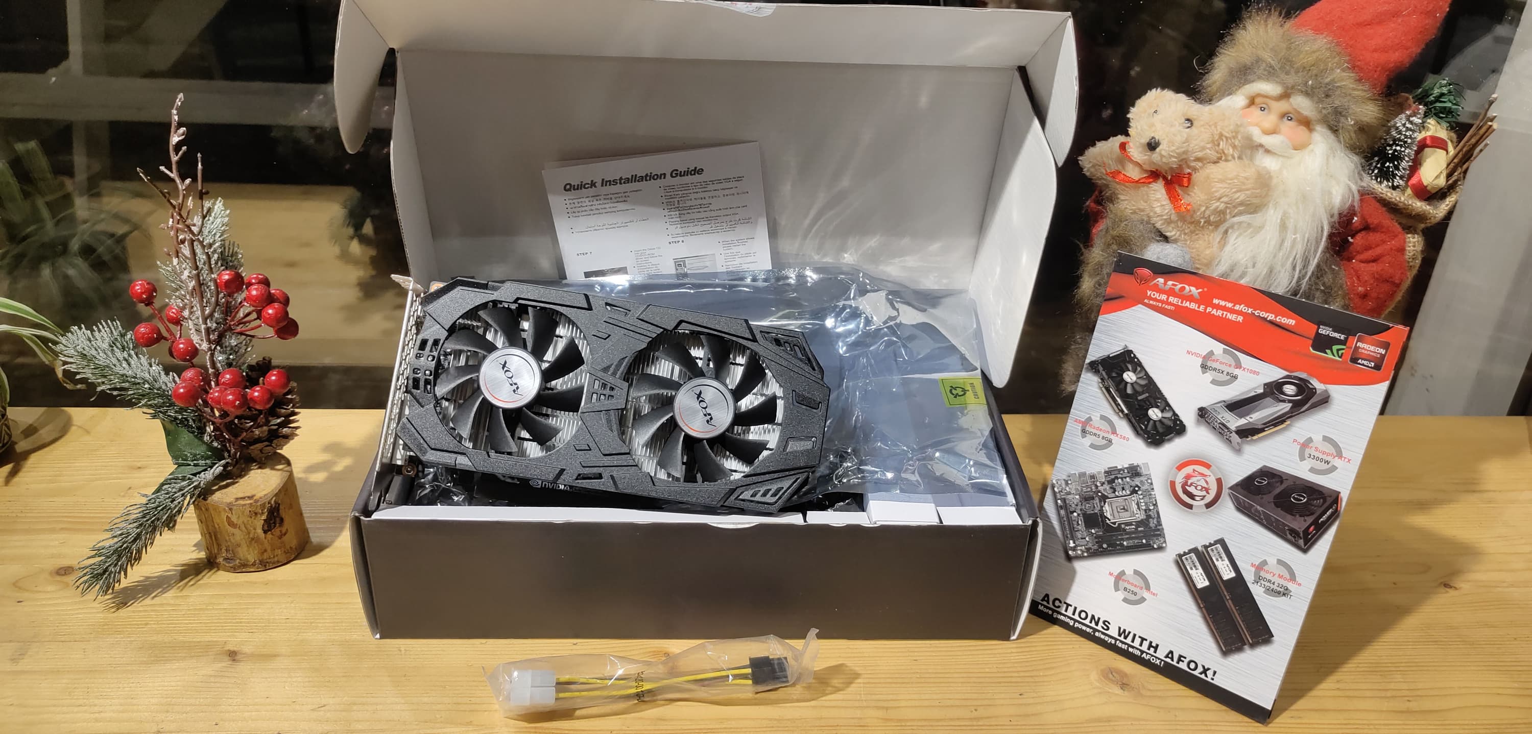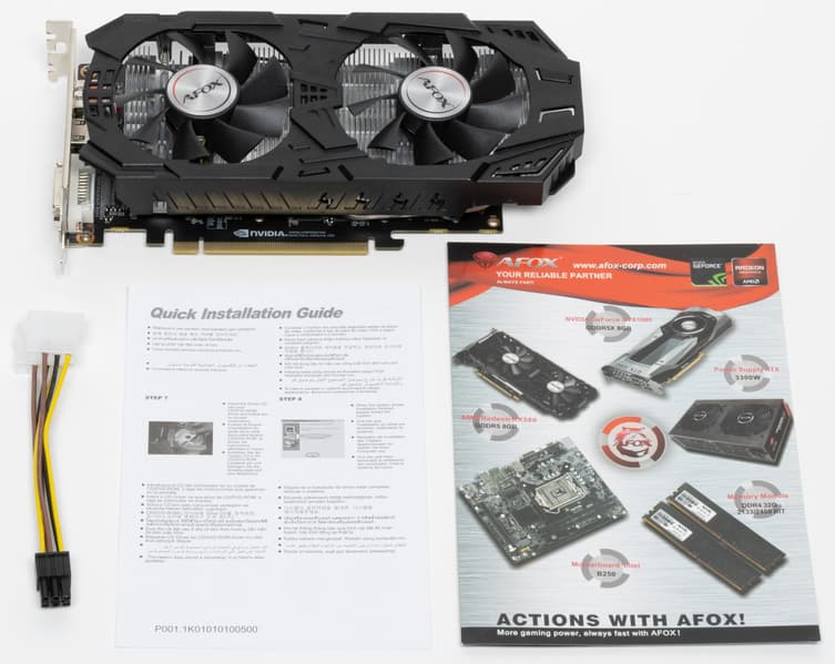Комплект Afox GeForce GTX 1060 (6 ГБ) скромен, имеется цветная брошюрка с другим ассортиментом карт компании, а в целом комплект базовый, плюс разветвитель питания.