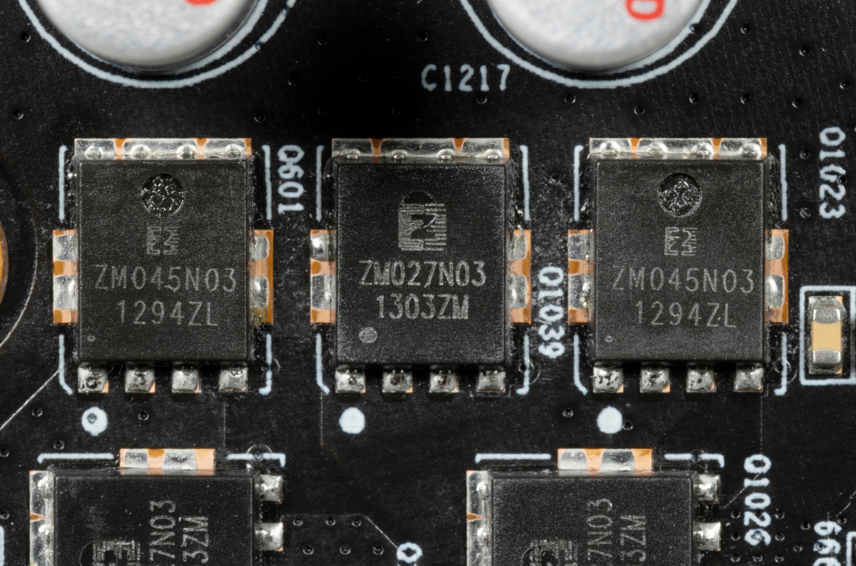 В преобразователе питания GeForce GTX 1060 используются наборы транзисторов (увы, не современные сборки DrMOS, а более простые решения) ZM027N03 от производителя Saiming, рассчитанные на максимальный ток 45 А.
