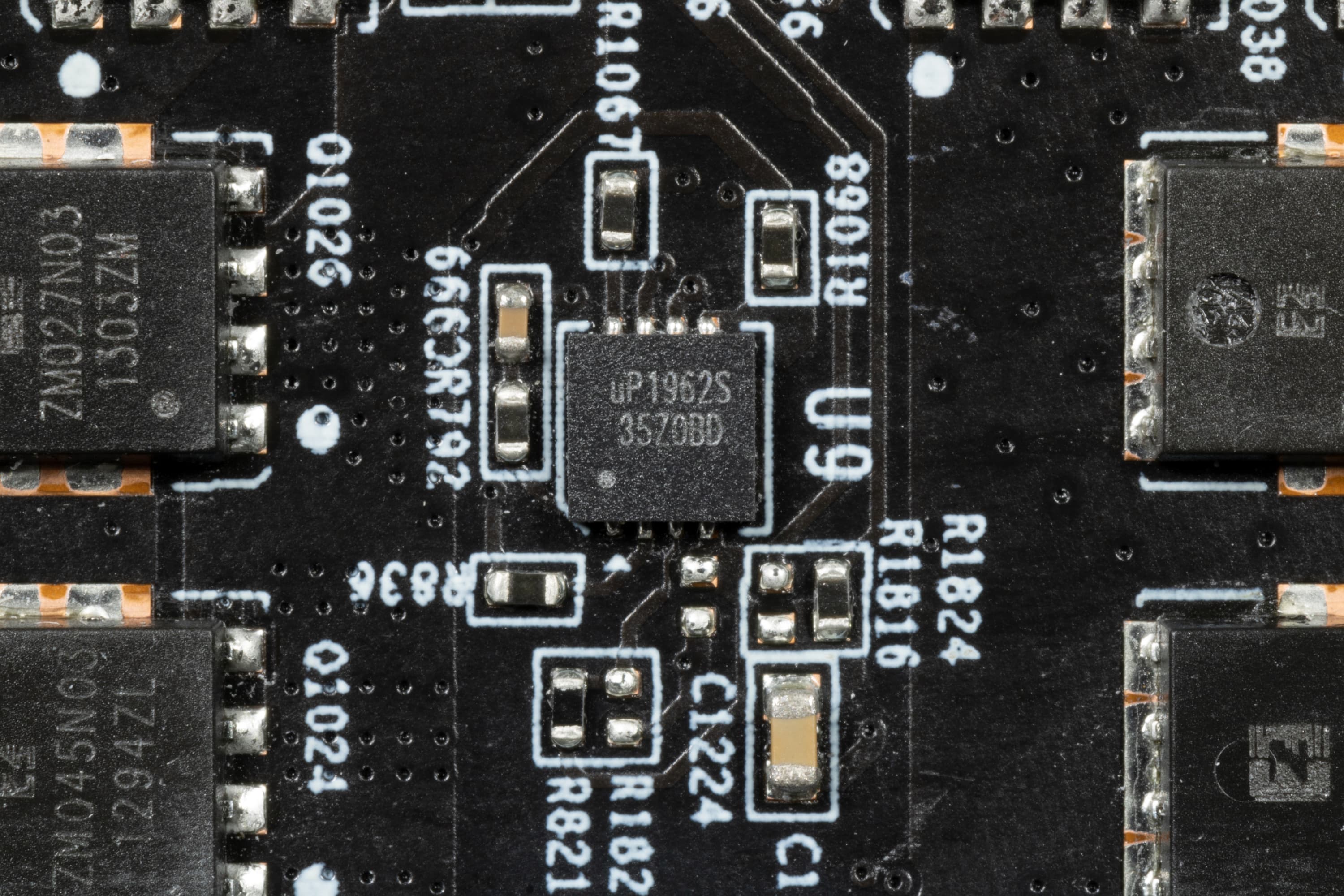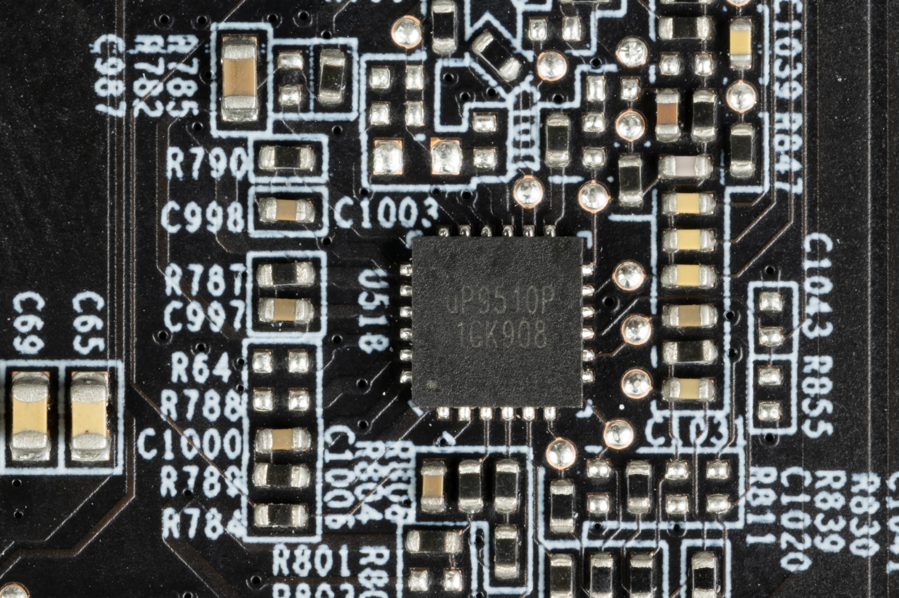 А именно ШИМ-контроллер uP9510P от uPI Semiconductor, который управляет этим самым легендарным графическим процессором, а именно его тремя фазами питания.