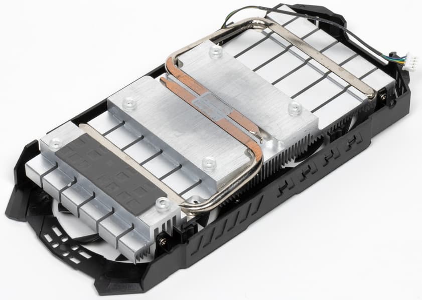 Это все установлено на сравнительно небольшом алюминиевом радиаторе, который охлаждает графическое ядро и силовые элементы схемы питания. Поверх радиатора имеется кожух с двумя 90-мм вентиляторами, которые вращаются всегда.