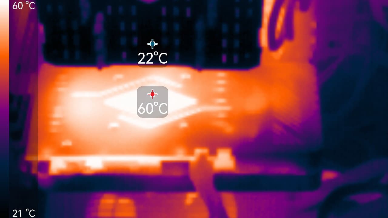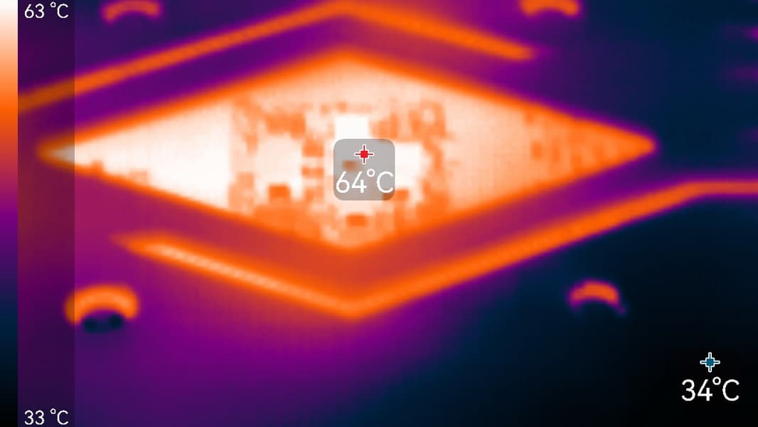 Максимальный нагрев наблюдался в районе GPU и микросхем памяти.