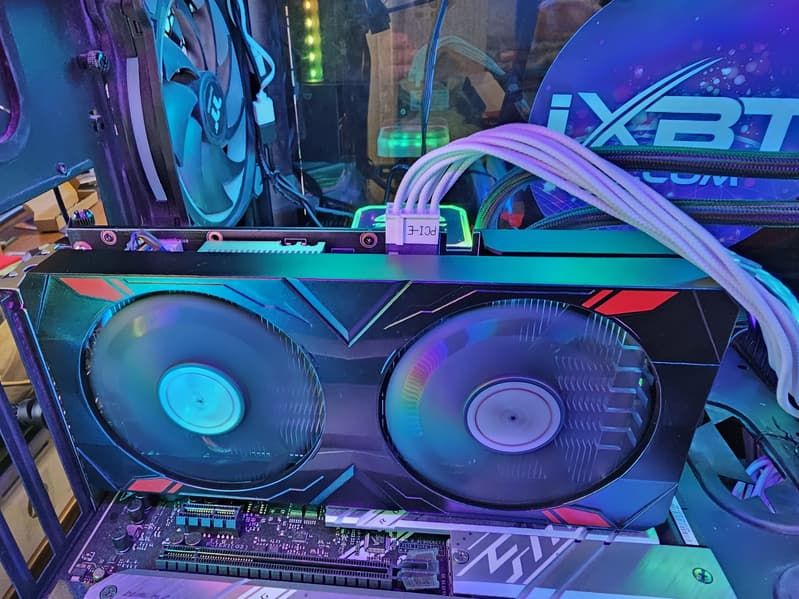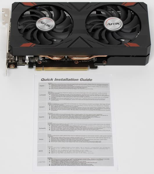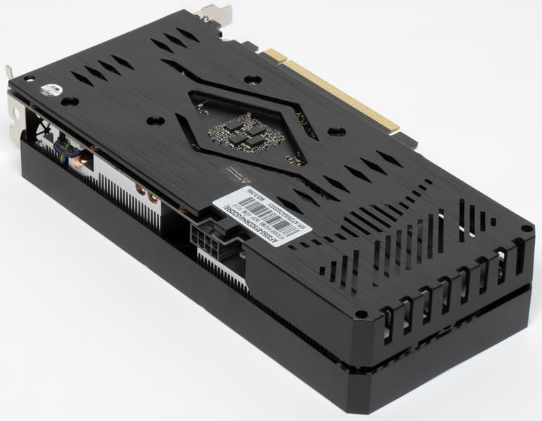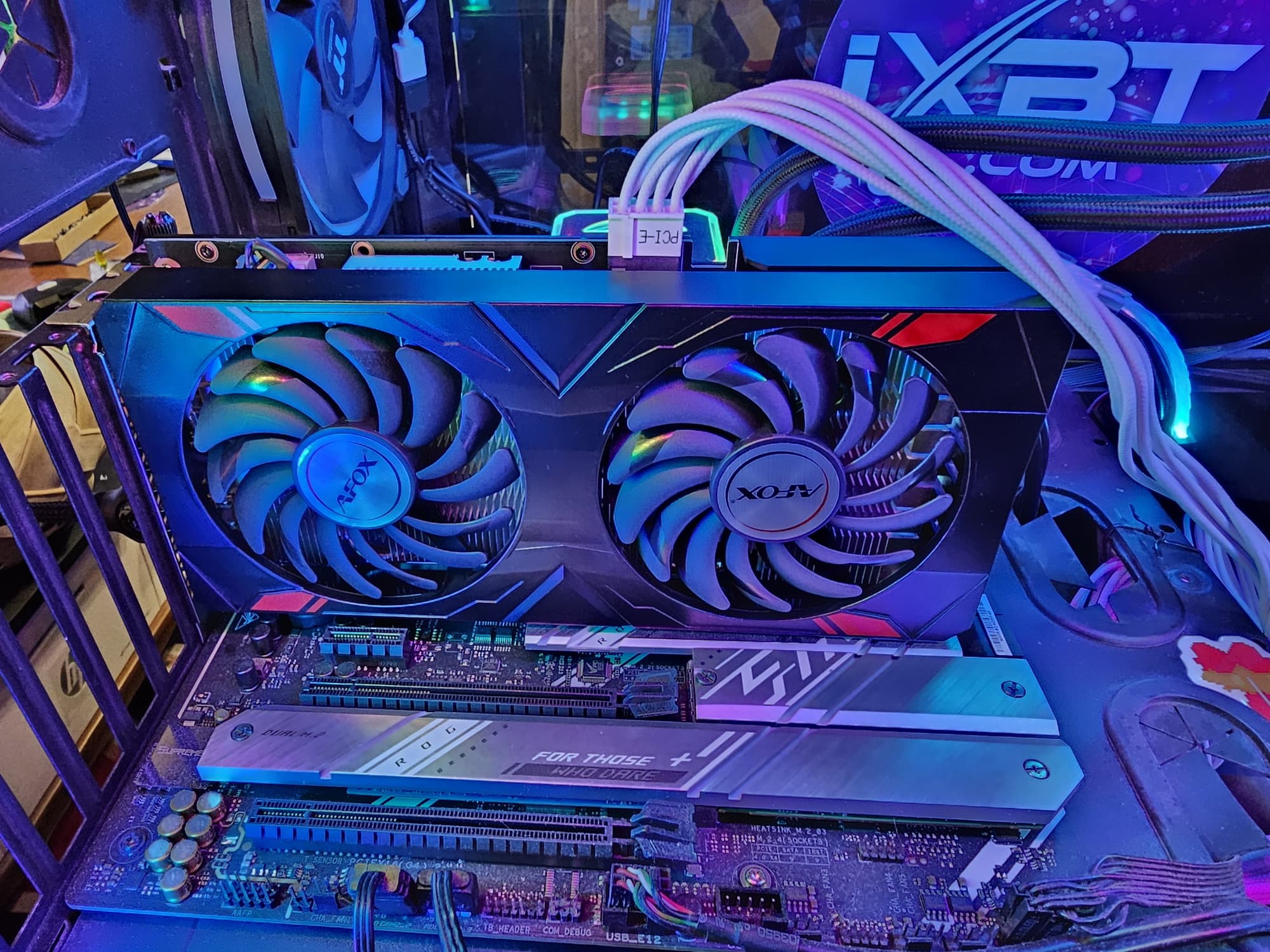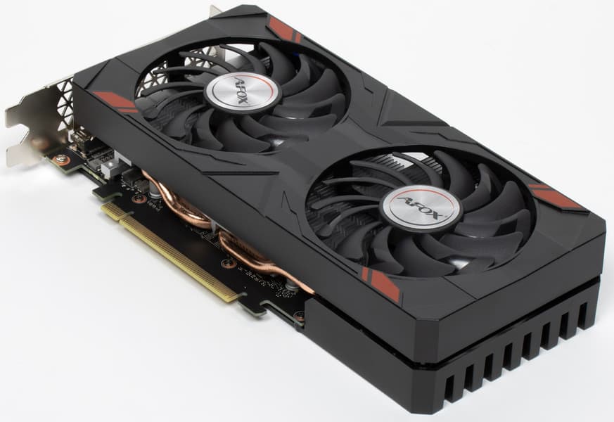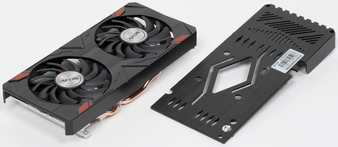 Система охлаждения у протестированной карты Afox достаточно эффективная и сравнительно тихая. Габариты этой модели составляют 22 см в длину и 11 см в высоту, а по толщине видеокарта занимает 3 слота в корпусе. Набор видеовыходов стандартный: 3 DP и 1 HDMI. Карта Afox способна потреблять до 119 Вт и имеет один 8-контактный разъем питания версии PCIe 2.0.